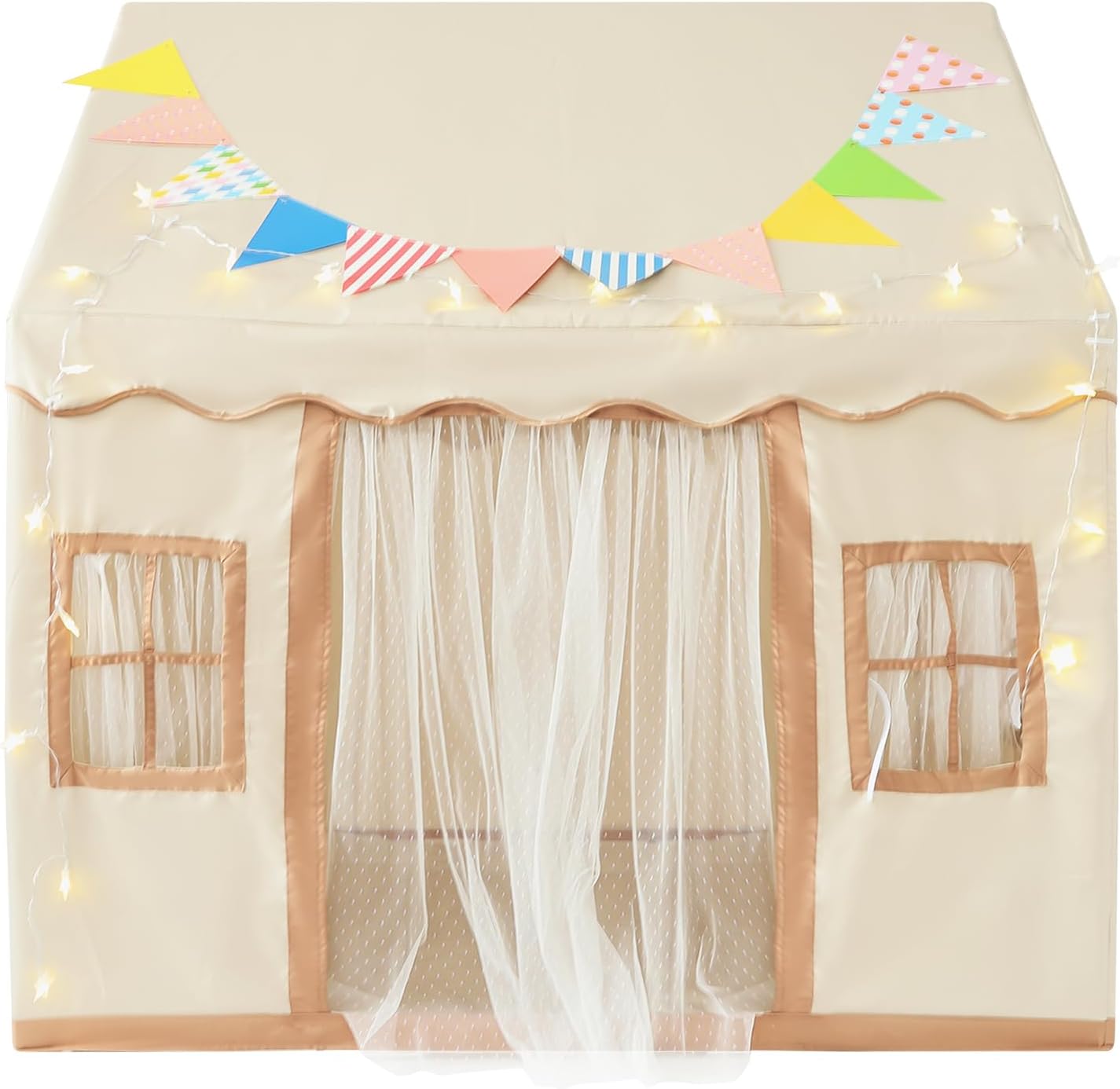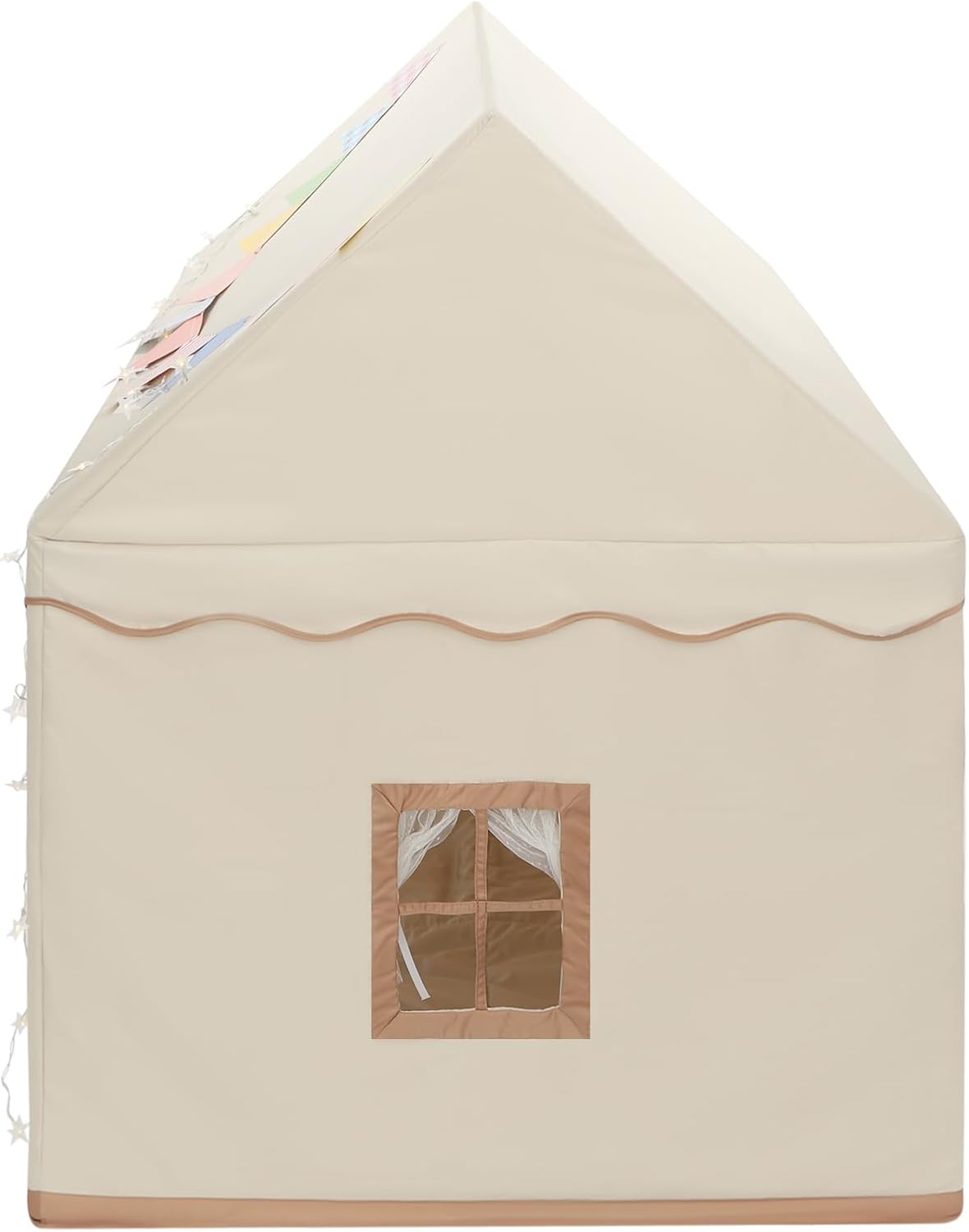DUREVOLE: il robusto tubo in PVC e la morbida pelle di pesca lo rendono resistente alla corrosione, agli strappi e difficile da deformare, garantendo una lunga durata Ampio spazio: la tenda per bambini dispone di un ampio spazio (120 x 100 x 130 cm), dove i tuoi bambini e i loro amici possono svolgere attività, leggere e divertirsi BUON ASPETTO: la forma della casa, le bandiere colorate e la calda catena luminosa a forma di stella rendono questo prodotto pieno di divertimento e immaginazione e lo rendono non solo una base segreta per il tuo bambino, ma anche una decorazione per la tua stanza e la tua casa INSTALLAZIONE FACILE: la struttura semplice e gli accessori completi ti rendono facile finire l'installazione Applicazione: questo prodotto può essere posizionato nell'angolo della stanza dei bambini come angolo lettura, sala giochi o come spazio per dormire. Può essere utilizzato anche come decorazione per una festa di compleanno