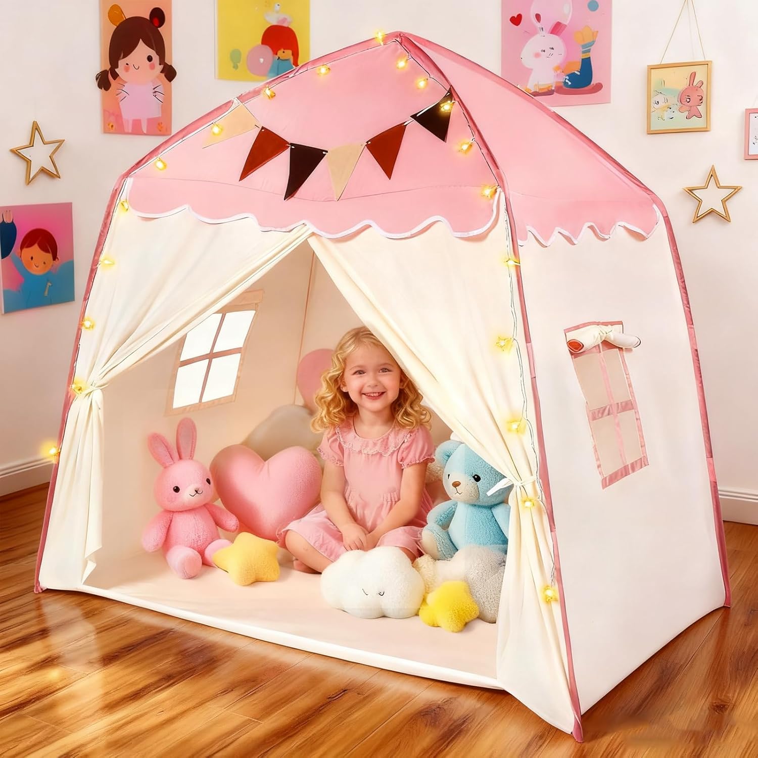 REGALO PER BAMBINI: i bambini sognano di avere uno spazio privato che appartiene a loro. Questa tenda per bambini per interni è un regalo più felice. Il bambino è più motivato e interessato a uno spazio indipendente dove può esplorare cose nuove. Design unico: questa tenda per bambini da interno realizzata in tessuto Oxford ispessito, molto forte e durevole, non toglie la seta ed è più comoda da pulire. Dimensioni: 130 x 100 x 130 cm. Facile da montare: molto facile da montare e smontare, senza bisogno di attrezzi. Il bambino può facilmente montare il proprio lucchetto sotto la supervisione di un adulto. La tenda da gioco per bambini può essere ripiegata in una piccola borsa e portata ovunque. Sicura: la tenda da gioco per bambini non ha bordi taglienti, quindi il bambino non può ferirsi. Tubo in PVC di alta qualità e giunti in plastica, nessuna sensazione acuta e ruvida. Tenda multiuso per bambini: utilizzare la tenda da gioco in camera da letto, feste, picnic, parchi, asilo nido, adatta per bambini per giocare all'interno e all'esterno. (Nota: se lo si utilizza all'aperto, mettere oggetti pesanti nella tenda)