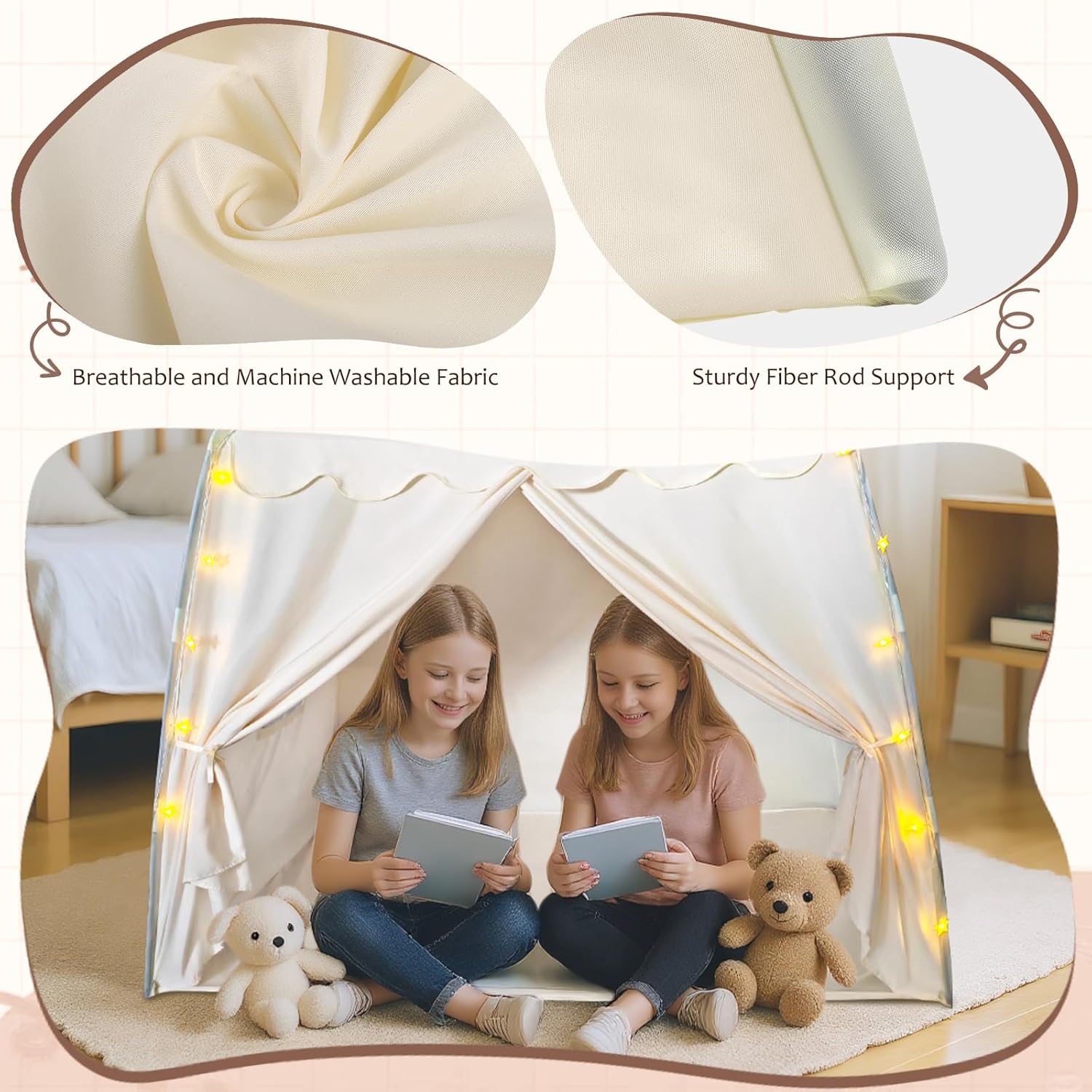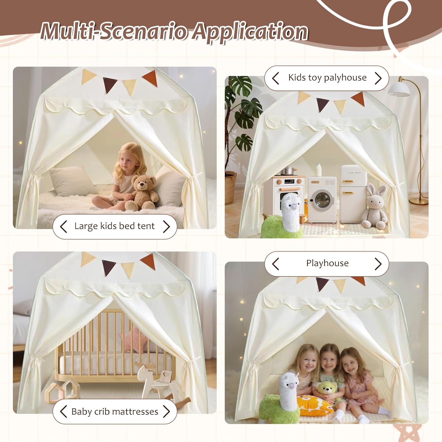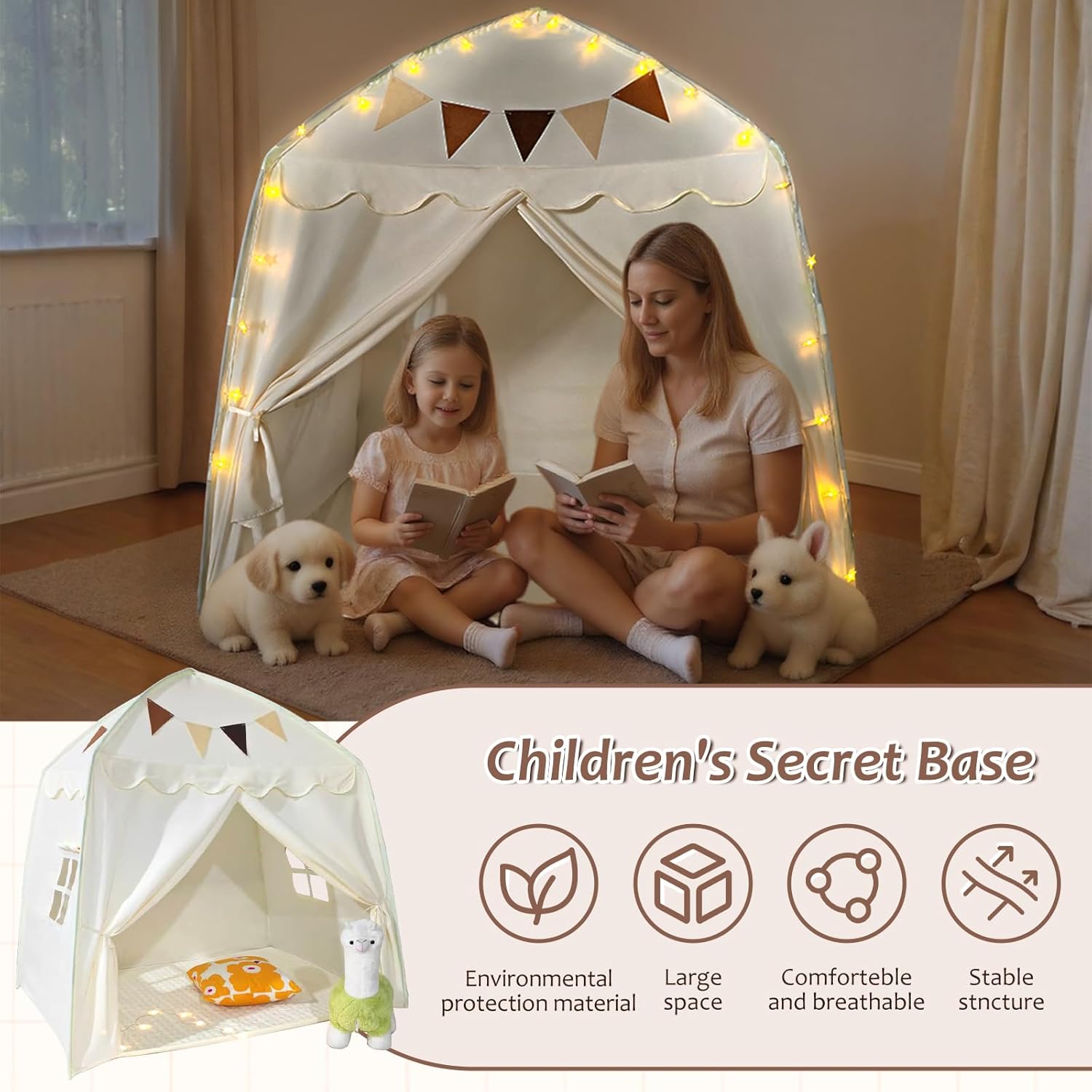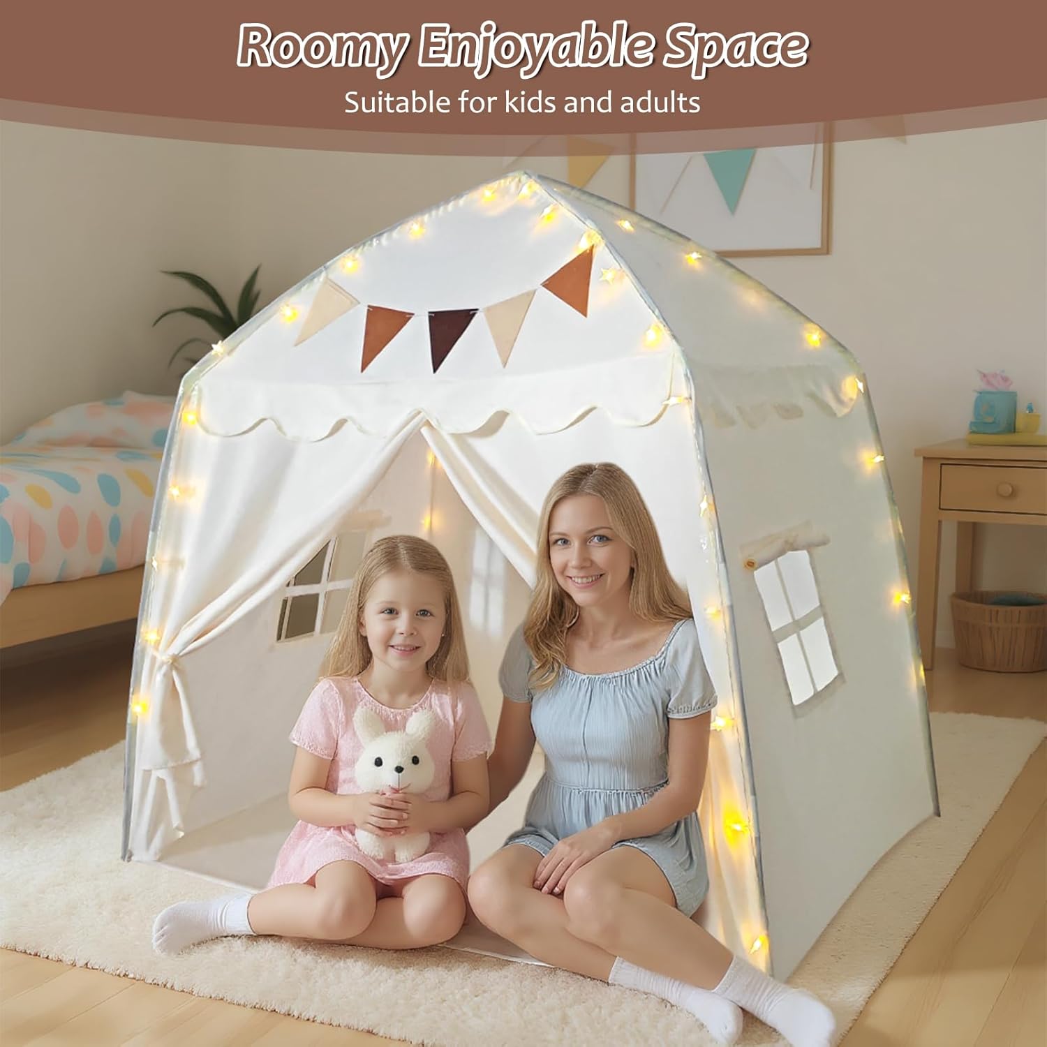 Area giochi XXL spaziosa e confortevole: questa tenda per bambini di alta qualità con le dimensioni generose di 150 x 108 x 150 cm offre un ampio e accogliente interno, perfetto per 3-4 bambini per giocare, leggere o riposare. Anche gli adulti possono entrare senza sforzo, il che lo rende la casetta ideale per giochi di ruolo e avventura. Che si tratti di interni o esterni, questa tenda per bambini trasforma qualsiasi stanza in un magico mondo di gioco! Facile da montare per l'interazione genitore-figlio: non sono necessari strumenti complicati, questa tenda per bambini si monta in soli 3 minuti! Bambini e genitori possono costruire insieme la casetta, che non solo rafforza il legame, ma promuove anche l'orgoglio dei più piccoli. Grazie al semplice sistema, montare e smontare la tenda da gioco è un gioco da ragazzi! Fantastico set di decorazioni per un'atmosfera magica: la tenda per bambini viene fornita con bandiere colorate e catene luminose che creano un'atmosfera fiabesca. Sia come area giochi creativa o come accogliente angolo di lettura, qui i bambini possono dare libero sfogo alla loro immaginazione. Perfetto per ore sognanti sotto "luce stellare"! Sicura, durevole e facile da pulire: la tenda per bambini è realizzata in tessuto di pelle di pesca traspirante e delicato sulla pelle (lavabile in lavatrice). e robuste aste in fibra di vetro da 8 mm. Così la casetta diventa un'oasi di gioco robusta e sicura, per un divertimento duraturo e genitori rilassati Divertente design a due porte con buona ventilazione e visibilità: la tenda da gioco convince con due ingressi e finestre ventilate per un ricambio d'aria ottimale, ideale per lunghe ore di gioco, al chiuso o all'aperto. Le tende arrotolabili offrono ai genitori una visione sempre all'interno. Così questa tenda combina perfettamente divertimento e sicurezza per i bambini!