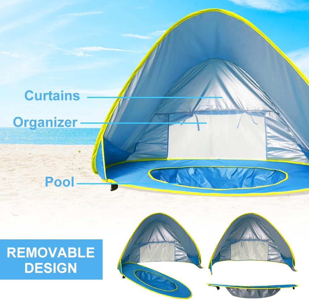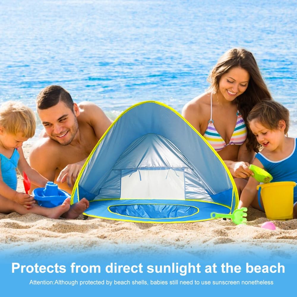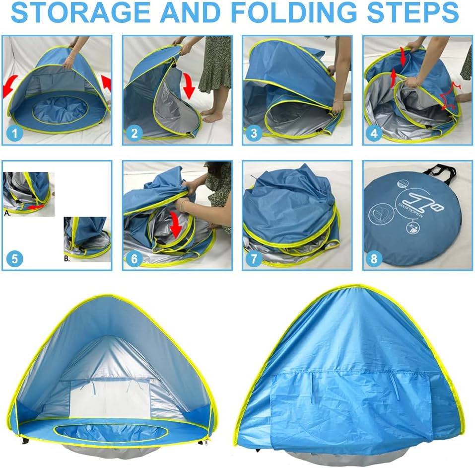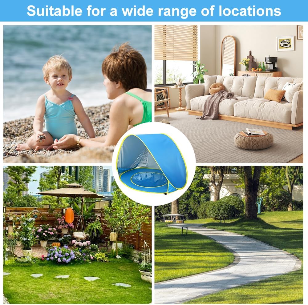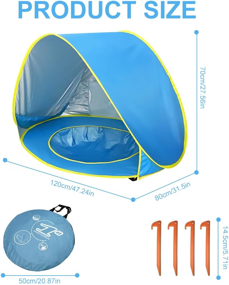 【Mini Piscina Integrata】Tenda spiaggia bambini con mini piscina integrata che consente al bambino di giocare in acqua invece di andare in riva al mare. Basta scavare la sabbia sotto la piscina e aggiungere la quantità d'acqua desiderata per regalare ore di divertimento al tuo bambino, mentre i genitori hanno più tempo per godersi la gita in spiaggia 【Design Pop Up】La nostra tenda da spiaggia bambini con mini piscina ha una struttura pieghevole e presenta un design pop-up che consente di installarla e smontarla automaticamente in pochi secondi senza montaggio. Utilizzare i picchetti in dotazione per fissare rapidamente la tenda spiaggia bambini al terreno 【Design Portatile】Con un peso di soli 750 g, la nostra tenda da spiaggia bambini con mini piscina è facile da trasportare, piegare e imballare. Le dimensioni aperte della tenda spiaggia bambini sono 120 cm L x 80 cm P x 70 cm H. E si ripiega direttamente in una borsa per il trasporto con un diametro di 53 cm 【Protezione UV】La tenda da spiaggia pop-up con protezione UV è realizzata in poliestere e ha un rivestimento argentato ecologico che blocca efficacemente fino al 90% dei dannosi raggi UV del sole, impedendo alla luce solare dannosa di danneggiare la pelle del tuo bambino. Tenda spiaggia bambini a scomparsa, design a rete sul retro per consentire all'aria fresca di entrare e uscire, mantiene fresco l'interno della tenda 【Uso Estensivo】Questa Tenda da spiaggia bambini con mini piscina è perfetta per i bambini e offre un rifugio spazioso e sicuro per godersi il sole, il mare e la sabbia. Tenda spiaggia bambini ma anche per parchi, giardini, zone di pesca, festival musicali, viaggi e molti altri scenari. Puoi utilizzarlo come protezione solare mentre ti rilassi