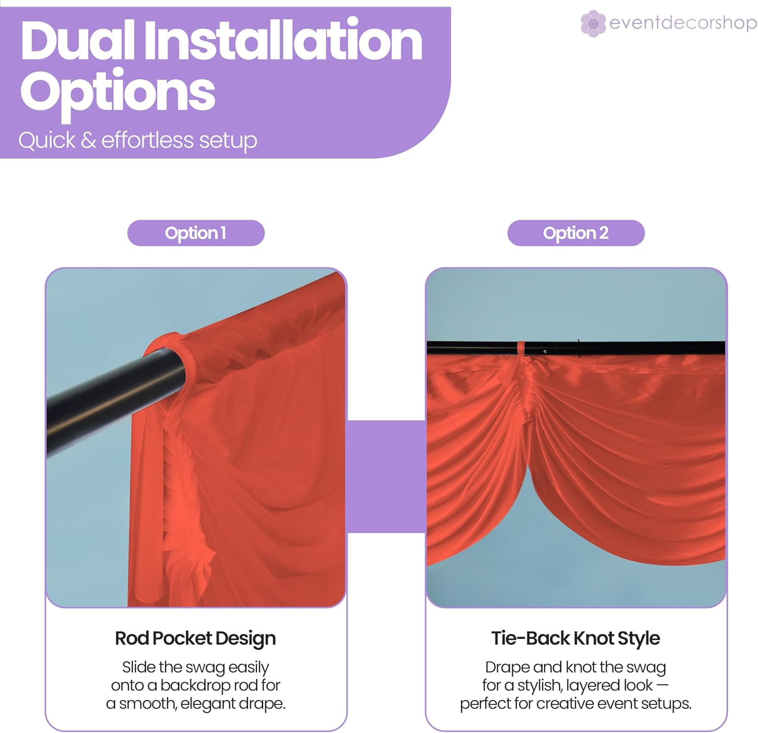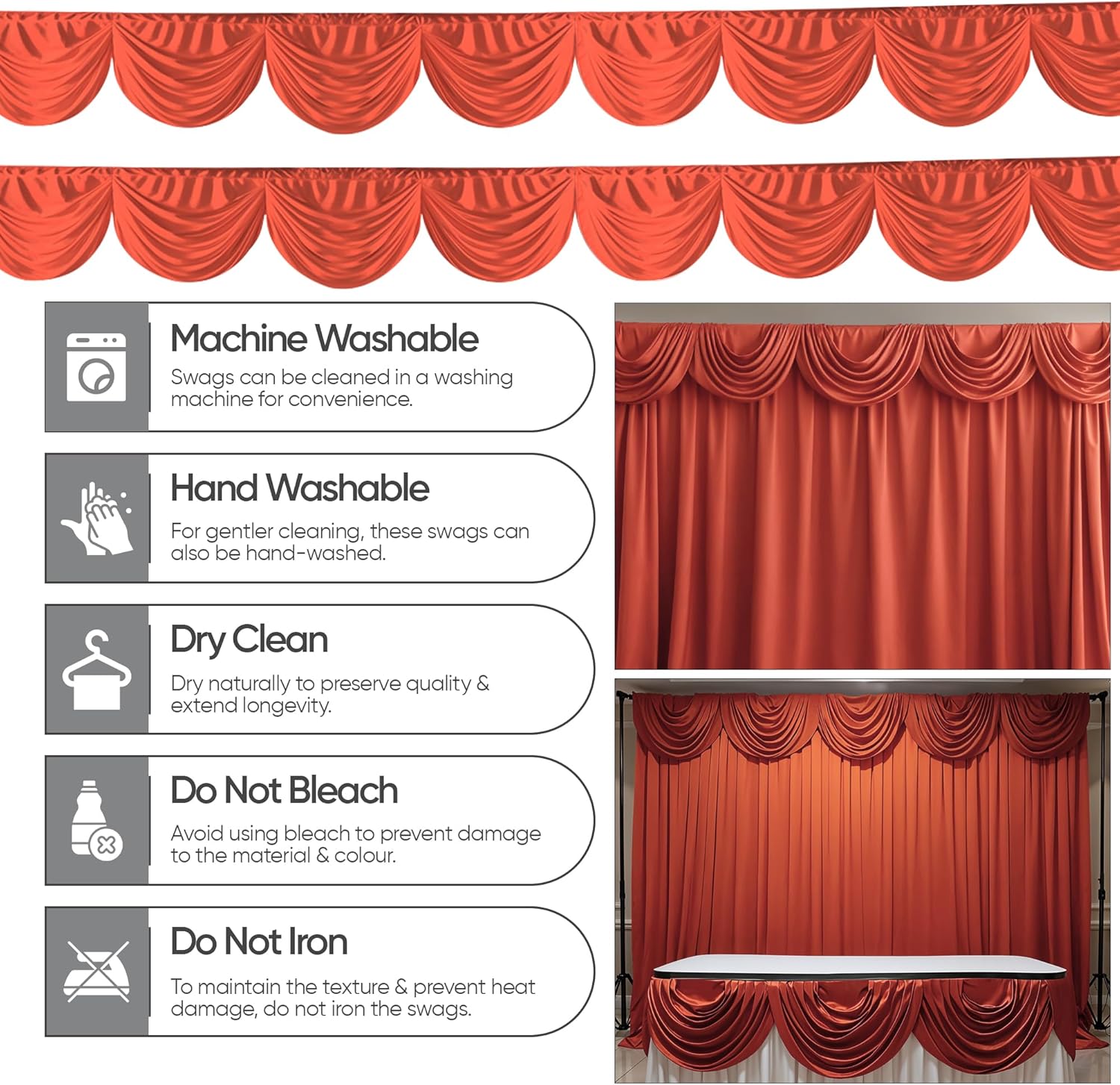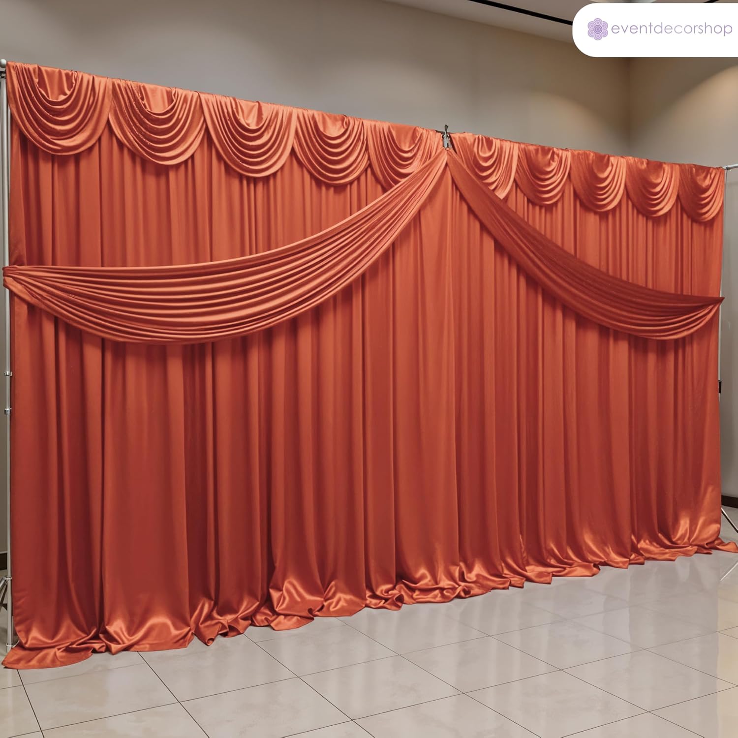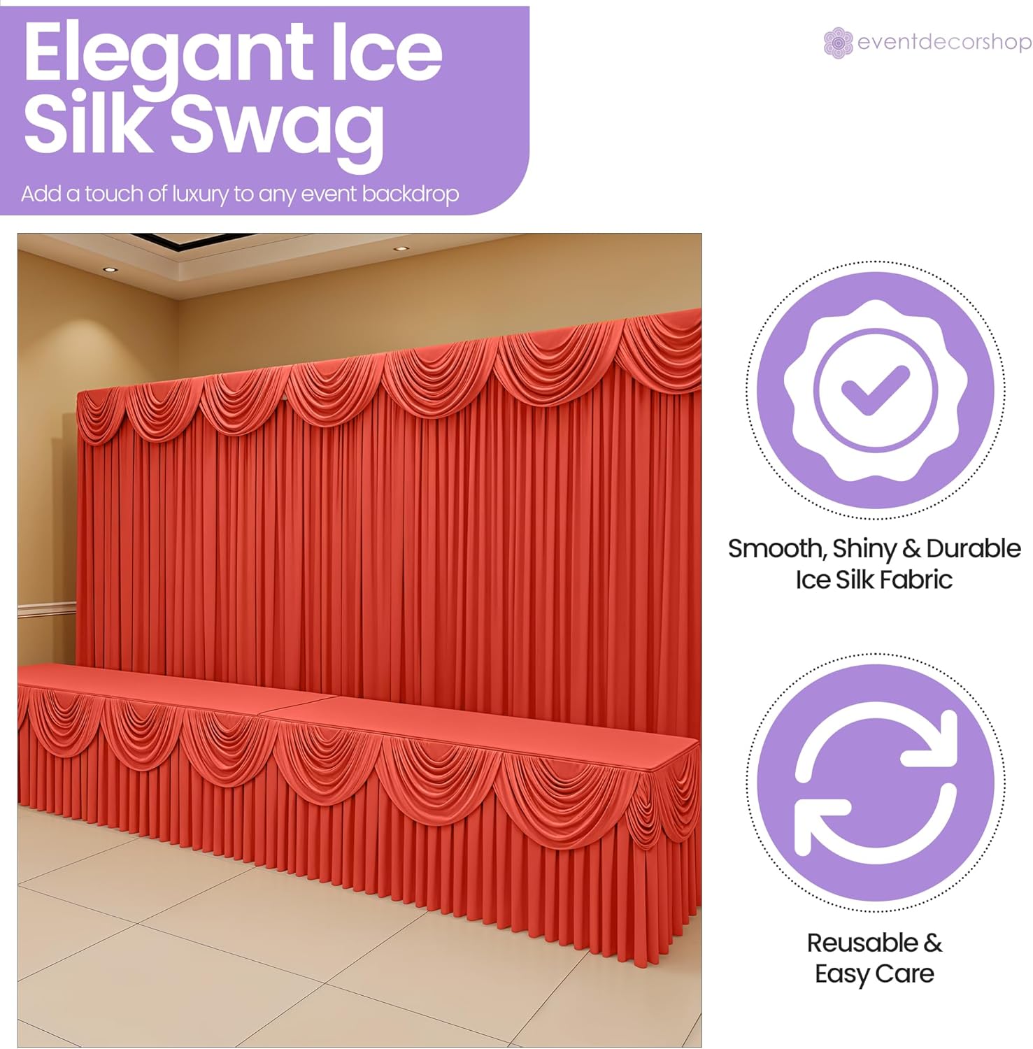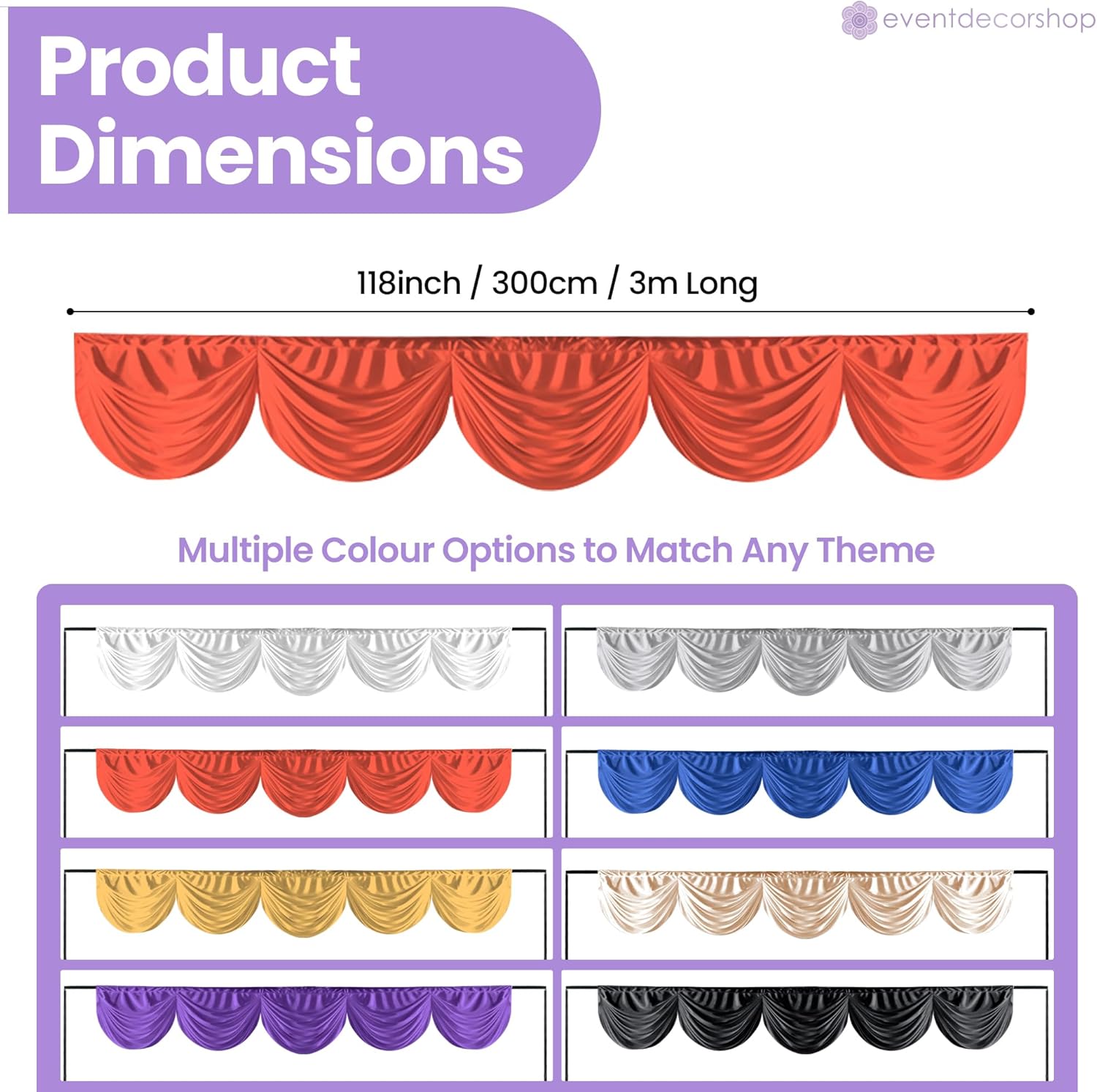 Aggiungi un tocco di raffinatezza alla tua sede con la ghirlanda di seta ghiacciata rimovibile da 3 metri del negozio di decorazioni per eventi. Progettato per matrimoni, occasioni speciali e fondali fotografici. Questa tenda lucida offre un'eleganza fluida e un aspetto raffinato, rendendola la soluzione perfetta per eventi professionali o privati. Questa ghirlanda da 10 piedi (299,7 x 45,7 cm) si drappeggia magnificamente su palchi, tavoli principali, archi o finestre, creando profondità e raffinatezza ovunque sia posizionata. Grazie alla sua funzione rimovibile, la ghirlanda è veloce da installare e facile da rimuovere, offrendo comodità ai decoratori pur mantenendo una finitura impeccabile ed elegante per il tuo evento. Realizzata in tessuto di seta di ghiaccio morbido ma robusto, la ghirlanda unisce resistenza e stile. La sua lucentezza migliora l'illuminazione e gli sfondi fotografici, mentre la texture liscia offre una sensazione lussuosa. Leggero, riutilizzabile e di facile manutenzione. Questo materiale elegante offre una bellezza duratura, ideale per decorazioni eleganti di eventi e presentazioni teatrali. Dai ricevimenti di nozze, feste di compleanno e feste festive di Natale agli eventi a tema di Halloween, baby shower e vivaci celebrazioni di Capodanno, questo accessorio decorativo funziona senza sforzo. Il suo fascino versatile si adatta sia alle feste grandi che a quelle intime, consentendoti di creare splendidi fondali per eventi che lasciano un'impressione duratura. Ogni confezione contiene 1 ghirlanda removibile in seta ghiaccio che misura 3 m (299,7 x 45,7 cm). Riutilizzabili, resistenti, disponibili in tonalità eleganti come bianco, argento, rosso, blu reale, oro, viola, oro rosa e nero. Questa tenda è ideale per gli organizzatori di eventi che cercano un lusso accessibile per trasformare le celebrazioni in esperienze indimenticabili.