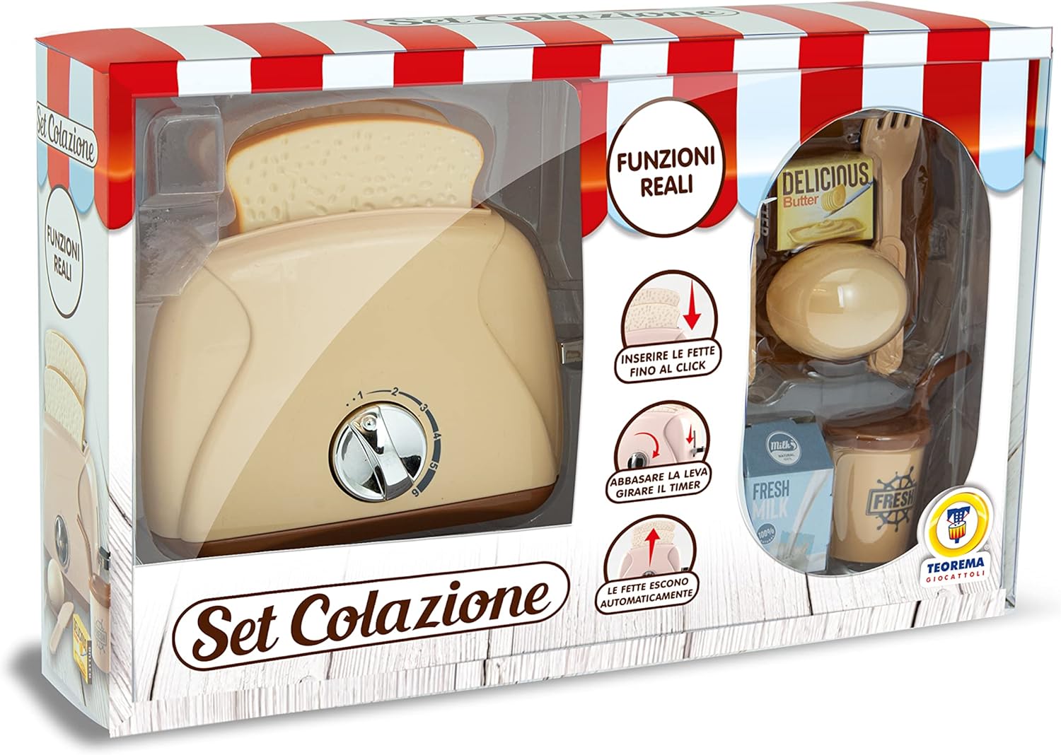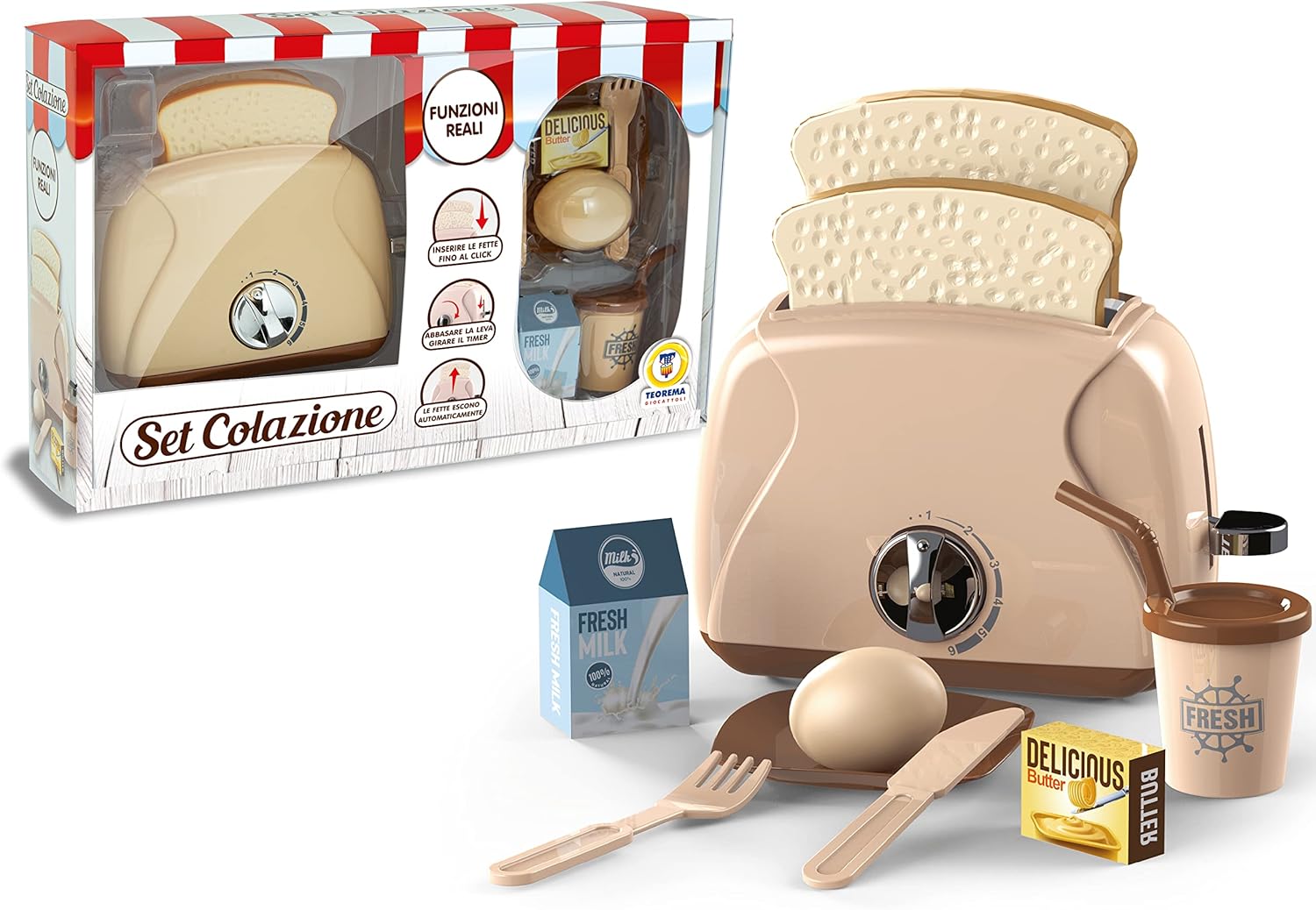 ✅ SET COLAZIONE: E' presente un Tostapane realmente funzionante, vari alimenti da cucinare per preparare la colazione, come pane, burro, un uovo e anche il caffè, infine degli accessori per servire la colazione preparata. ✅ FUNZIONI REALI: Il Tostapane funziona realmente, basterà inserire le 2 fette di pane nel Tostapane fino a sentire un click, abbassare la leva e far partire il timer, al termine della cottura le fette usciranno automaticamente. ✅ MATERIALE: Il Set Colazione è realizzato in plastica, ogni bordo ha gli angoli arrotondati per prevenire ogni tipo di rischio e pericolo durante il momento di gioco. ✅ REALISTICO: Il Tostapane, grazie al suo funzionamento reale, assomiglia molto ad un elettrodomestico reale. Attraverso il gioco il bambino o la bambina potrà imparare autonomamente come si prepara si prepara la colazione, imparando anche a prendere conoscenza dello strumento e creando degli scenari immaginari grazie all'utilizzo degli accessori a disposizione. Potrà approfondire le capacità di coordinazione occhio-mano, le capacità di reazione e quelle cognitive.