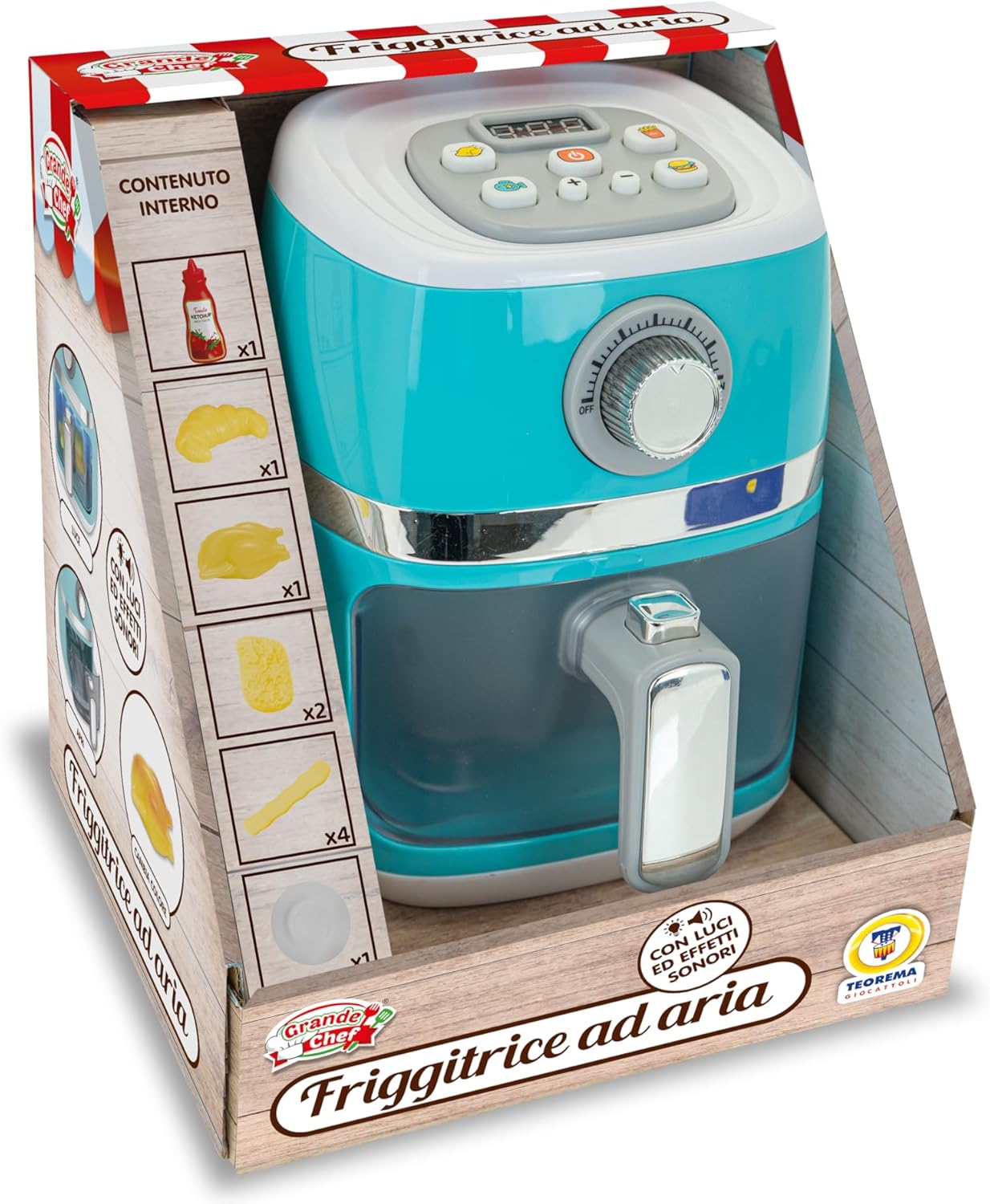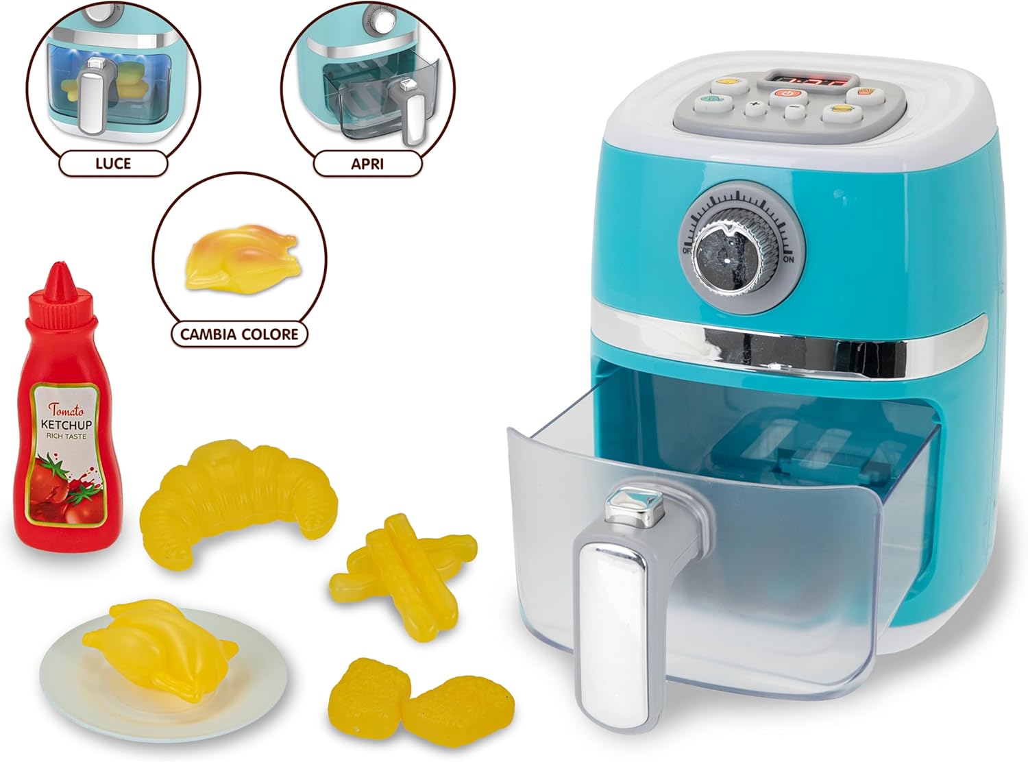 CIBO MAGICO CHE CAMBIA COLORE: La vera magia della cottura! Inserisci i cibi giocattolo (croissant, patatine, pollo) nel cestello: grazie a una speciale luce interna, sembreranno "cucinati", cambiando colore da chiari a dorati. Un effetto "wow" che lascerà i bambini a bocca aperta! LUCI E SUONI DA VERO CHEF: L'esperienza è incredibilmente realistica. La friggitrice ad aria è dotata di un display digitale che si illumina, suoni di cottura e un timer funzionante. I bambini possono impostare la "temperatura" e sentire il rumore del cibo che cuoce. SET COMPLETO PER PICCOLI CUOCHI: Apri la scatola e inizia subito a cucinare! La confezione include, oltre alla friggitrice, un croissant, patatine fritte, crocchette di pollo, un piattino e una bottiglietta di ketchup. Tutto il necessario per preparare un pasto completo. DESIGN REALISTICO E SICURO: Proprio come quella vera dei grandi! Il cassetto si estrae facilmente e i comandi sono intuitivi. Realizzata in plastica robusta e atossica, con bordi arrotondati, garantisce ore di gioco in totale sicurezza per i piccoli chef. SVILUPPA LA FANTASIA E LA COORDINAZIONE: Questo gioco di ruolo è un potente strumento educativo. Incoraggia la creatività nell'inventare ricette, insegna i concetti di causa-effetto (premo un tasto, il cibo si "cuoce") e sviluppa le abilità motorie fini manipolando i cibi e i comandi.