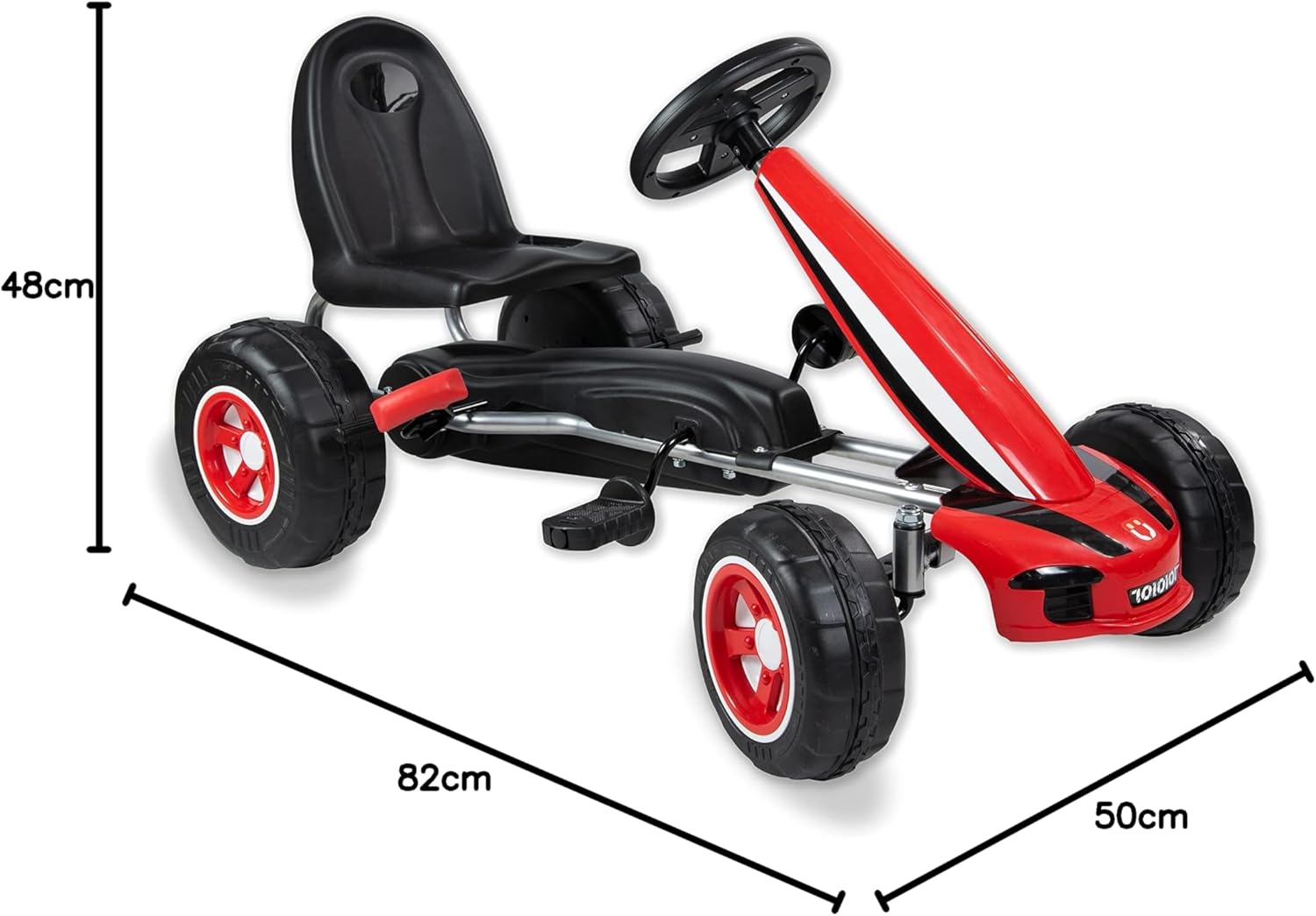 ESPERIENZA DI GUIDA COMPLETA: Unico nel suo genere! Questo go kart a pedali è dotato di marcia avanti e retromarcia. Il tuo bambino potrà non solo sfrecciare in avanti ma anche fare manovra e parcheggiare all'indietro, per un'esperienza di guida incredibilmente realistica e divertente. SICUREZZA E CONTROLLO TOTALI: La sicurezza prima di tutto. Grazie al freno a leva manuale, posizionato comodamente accanto al sedile, il bambino ha il pieno controllo del veicolo e può arrestare la corsa del suo go kart in modo rapido e sicuro in qualsiasi momento. DESIGN ERGONOMICO E SPORTIVO: Progettato per piccoli piloti, questo go-kart a pedali per bambini offre una seduta comoda e un volante facile da impugnare per un controllo preciso della sterzata. La struttura bassa e stabile garantisce un'autentica sensazione di guida da corsa. TELAIO ROBUSTO E RUOTE RESISTENTI: Costruito per durare e per affrontare ogni avventura, questo veicolo vanta un solido telaio in metallo e quattro grandi ruote in plastica dura con battistrada, ideali per una guida fluida su asfalto, erba o sterrato. DIVERTIMENTO CHE FA CRESCERE: Guidare questa macchina a pedali non è solo un gioco, ma un'attività fisica completa. Pedalare rafforza i muscoli delle gambe, mentre sterzare e frenare sviluppano la coordinazione, i riflessi e la percezione dello spazio.