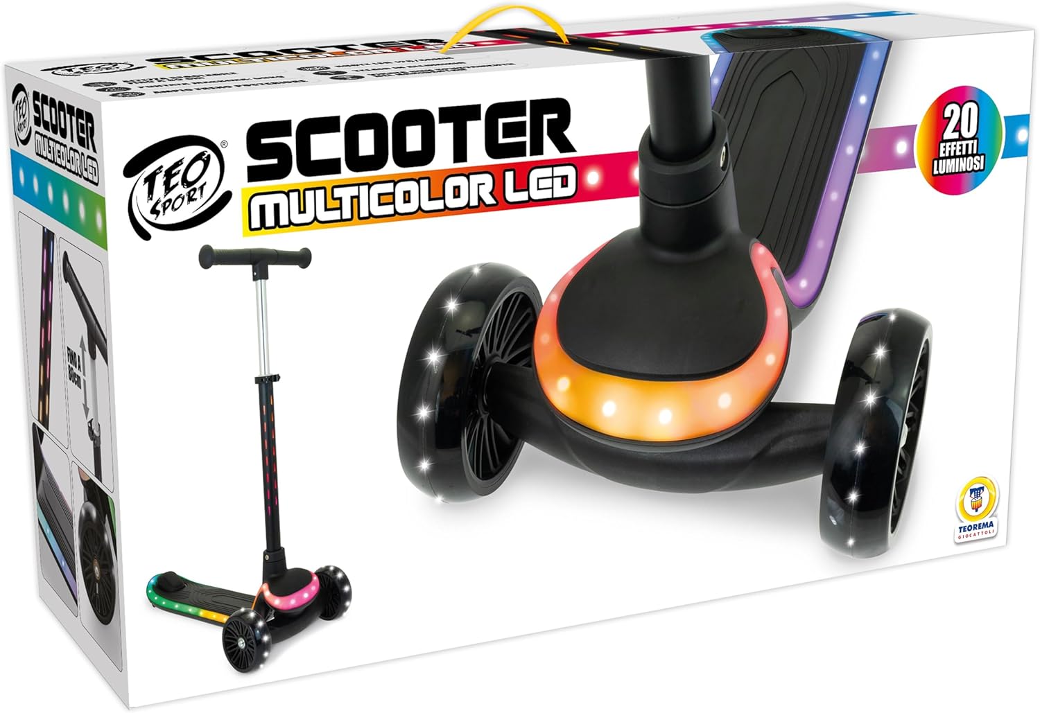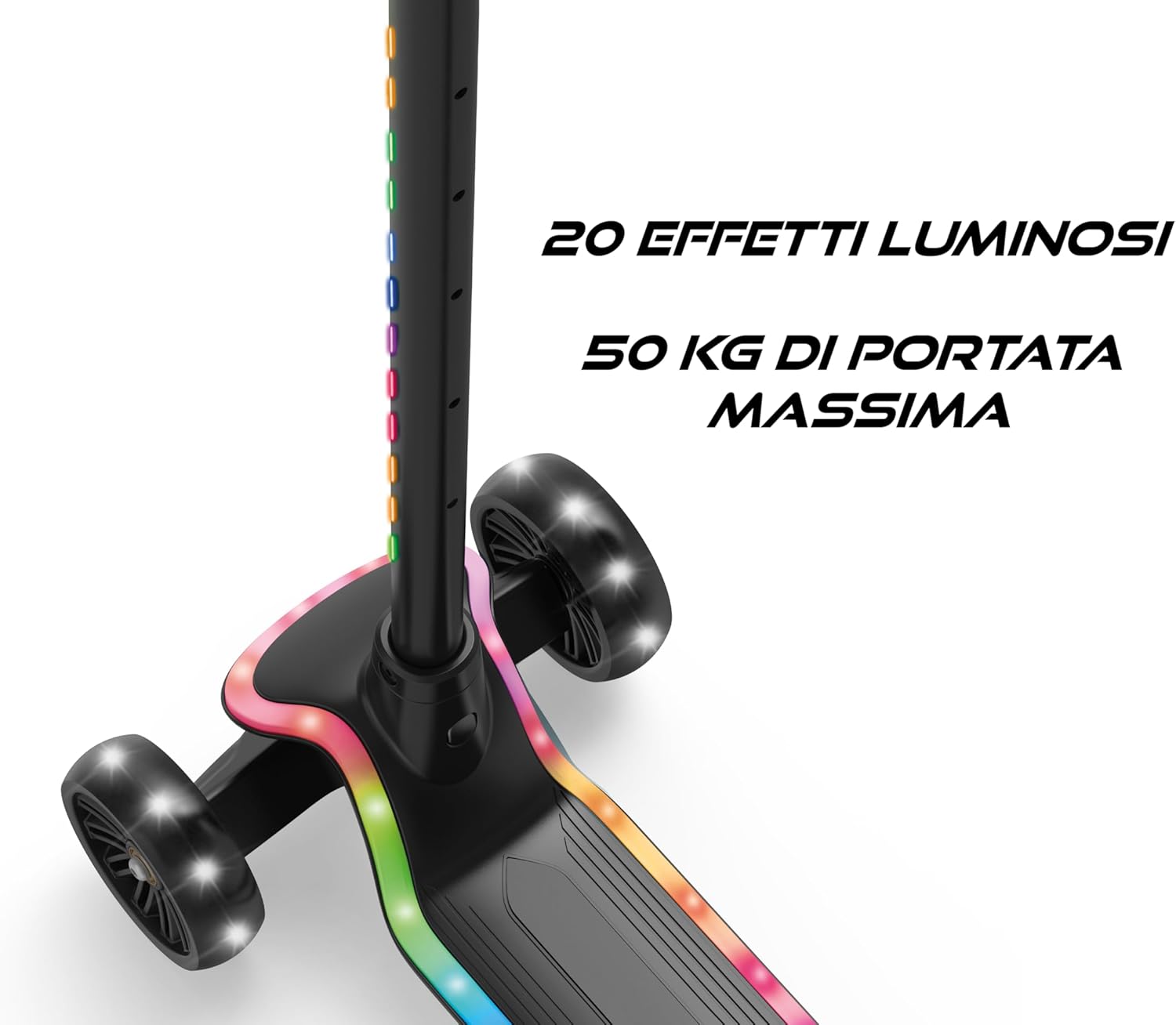 MONOPATTINO BIMBO TRE RUOTE PER MASSIMA STABILITÀ: il design a tre ruote garantisce equilibrio e sicurezza, rendendolo ideale come primo monopattino per bambini. Grazie al sistema di virata con spostamento del baricentro, il monopattino offre una guida fluida e intuitiva, mentre il freno posteriore garantisce un arresto sicuro e tempestivo. ADATTO A BAMBINI DAI 3 ANNI IN SU: progettato specificamente come monopattino per bambini da 3 anni in su, favorisce lo sviluppo dell'equilibrio e della coordinazione. MANUBRIO REGOLABILE E PRESA SICURA: Accompagna la crescita del tuo bambino! Il manubrio si regola facilmente in altezza per offrire il massimo comfort, mentre le manopole ergonomiche con impugnatura antiscivolo assicurano una presa sempre salda e sicura, garantendo un controllo totale durante la guida. RUOTE LED PER UN TOCCO DI DIVERTIMENTO: le ruote anteriori con luci led si illuminano durante il movimento, rendendo il monopattino bimbo ancora più accattivante. Grazie al pulsante posto al centro del manubrio è possibile attivare anche dei fantastici effetti luminosi LED su tutto il telaio. LEGGERO E FACILE DA TRASPORTARE: la struttura leggera consente un facile trasporto e stoccaggio, ideale per l'uso quotidiano.