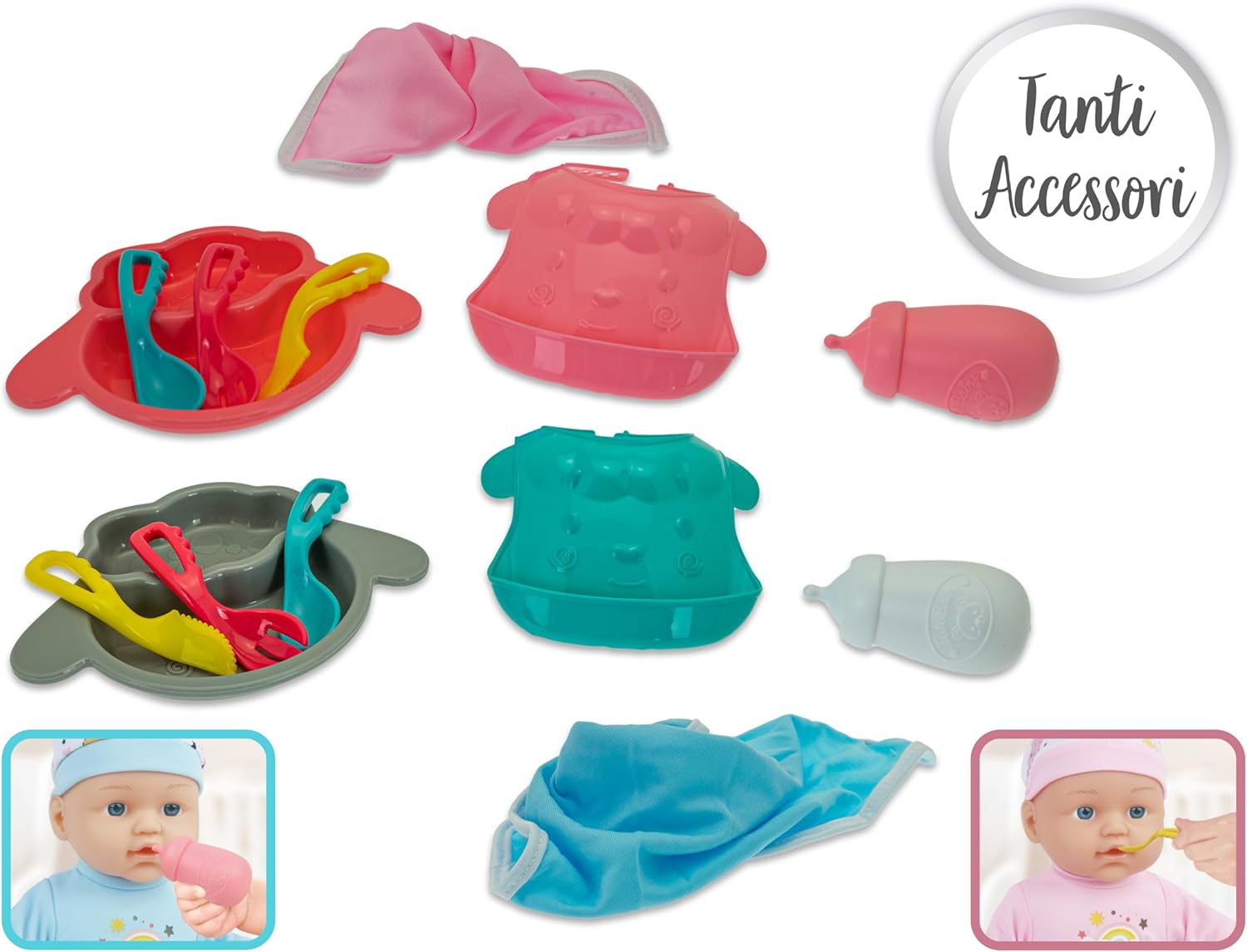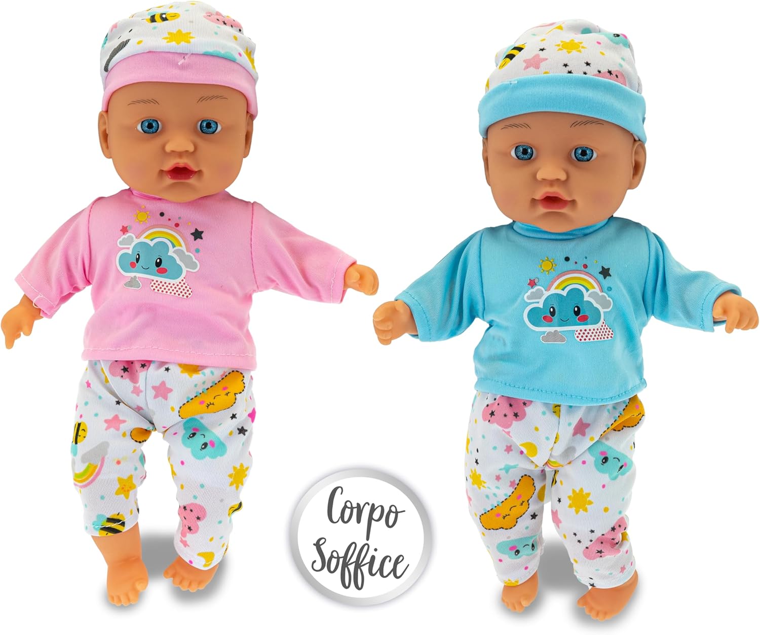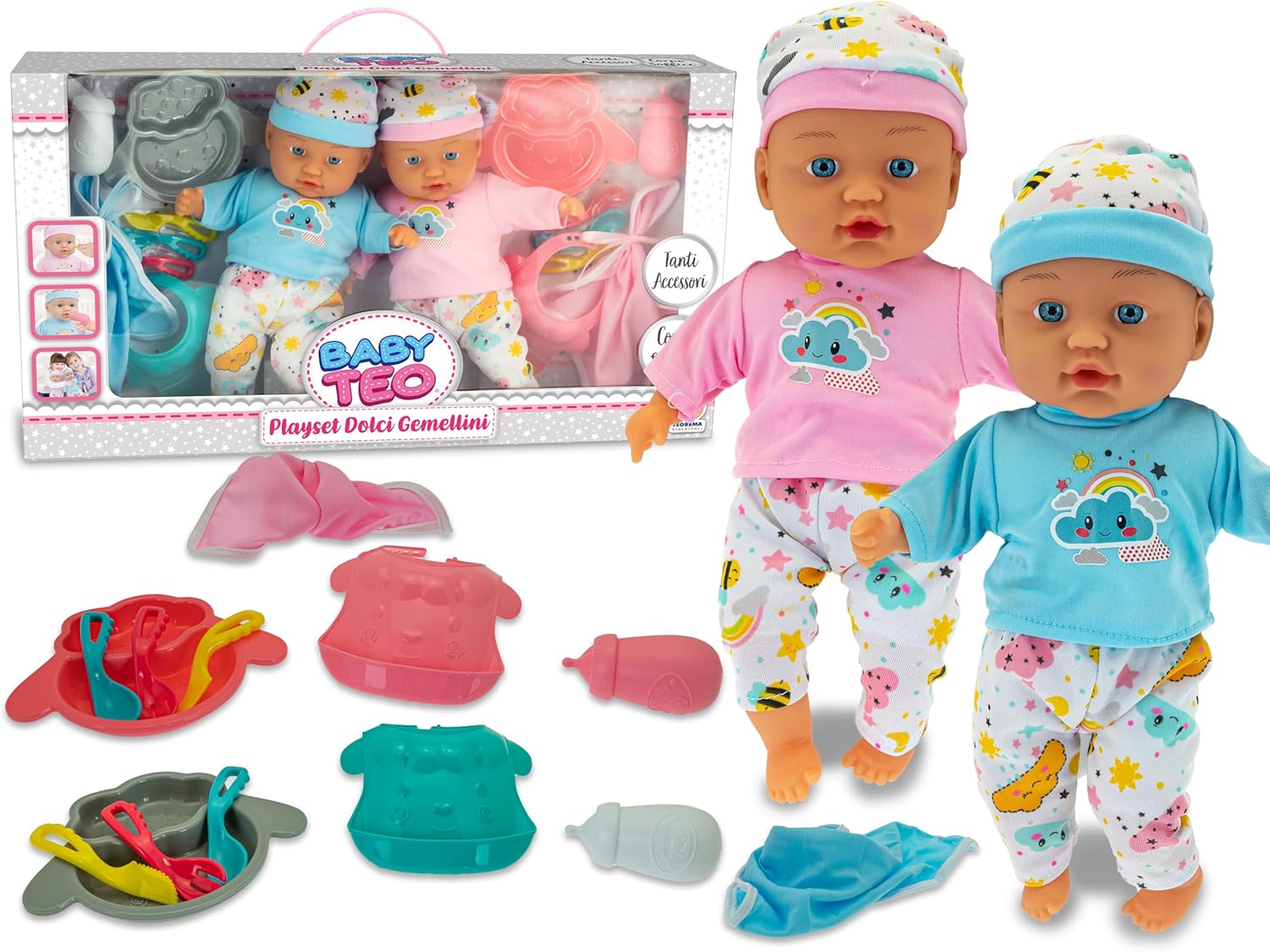✅ 2 GEMELLINI: Perfetti per raddoppiare il divertimento e stimolare il senso di cura e protezione nei bambini. ✅ MATERIALE DI ALTA QUALITA': Il morbido vinile e il corpo soffice garantiscono sicurezza e comfort durante il gioco. ✅ VESTITINI ABBINATI: Uno in blu e uno in rosa, per un look tenero e realistico. ✅ TANTI ACCESSORI INCLUSI: Per prendersi cura dei gemellini proprio come farebbe un vero genitore c'è il set pappa con piattino, posate e bavaglino per l'ora del pasto e il biberon per nutrirli e farli addormentare.