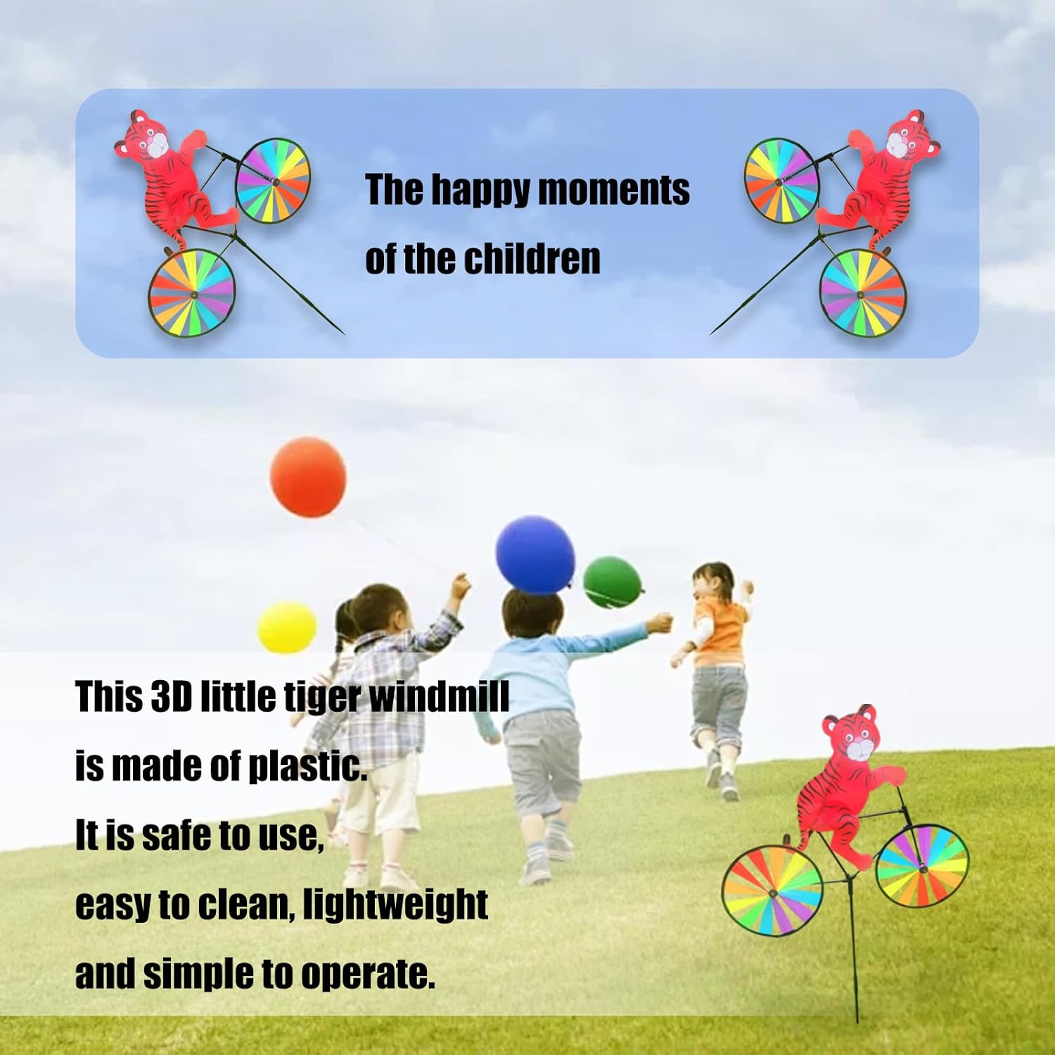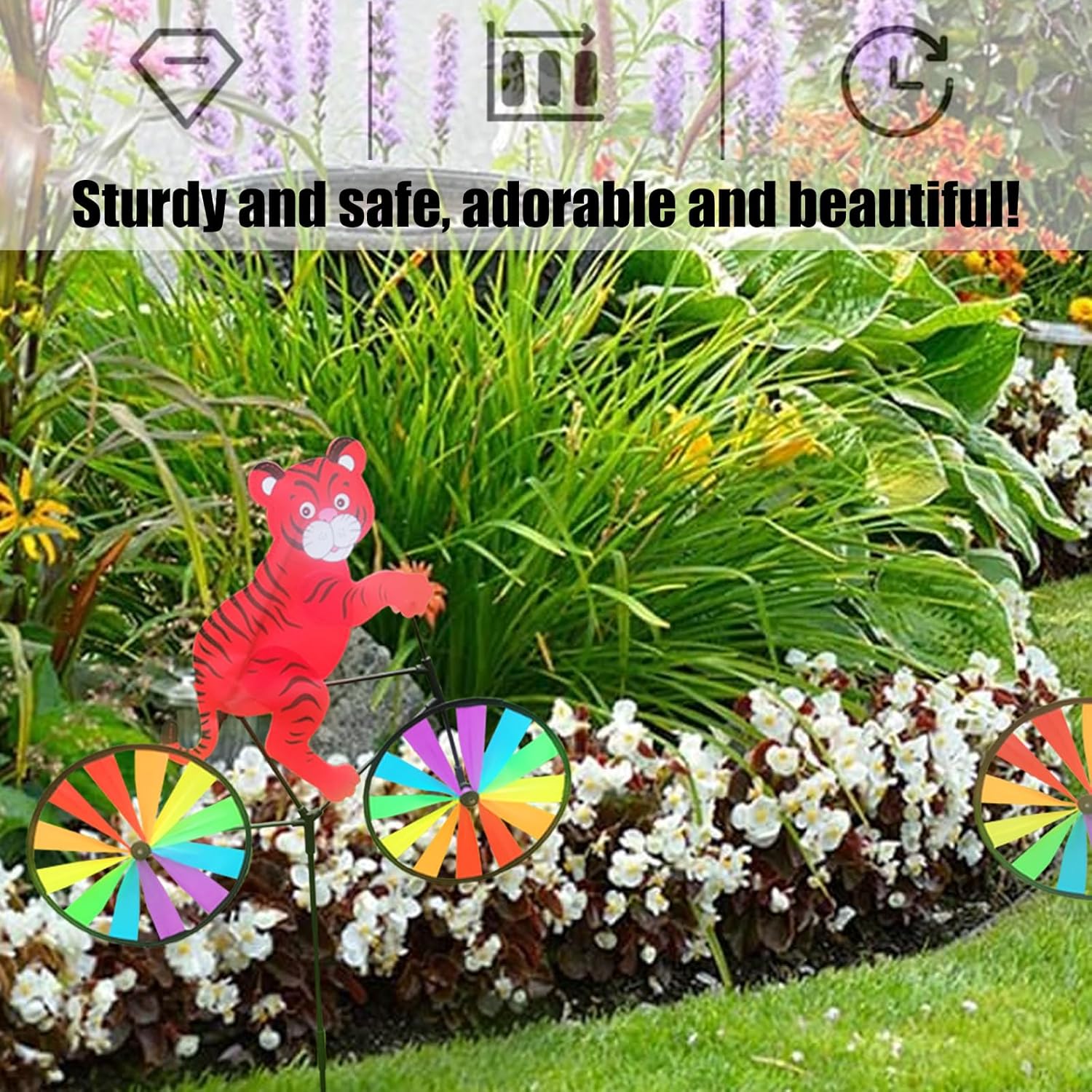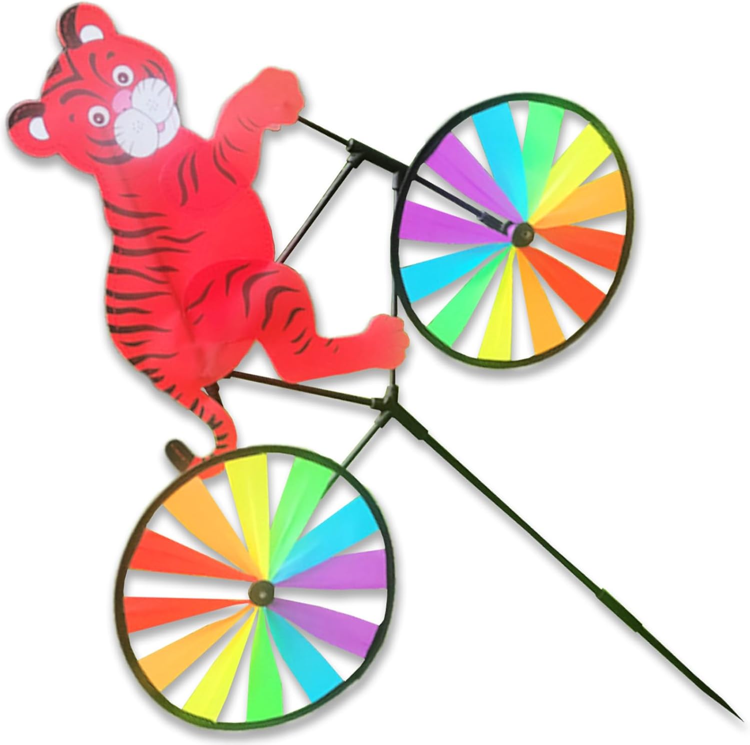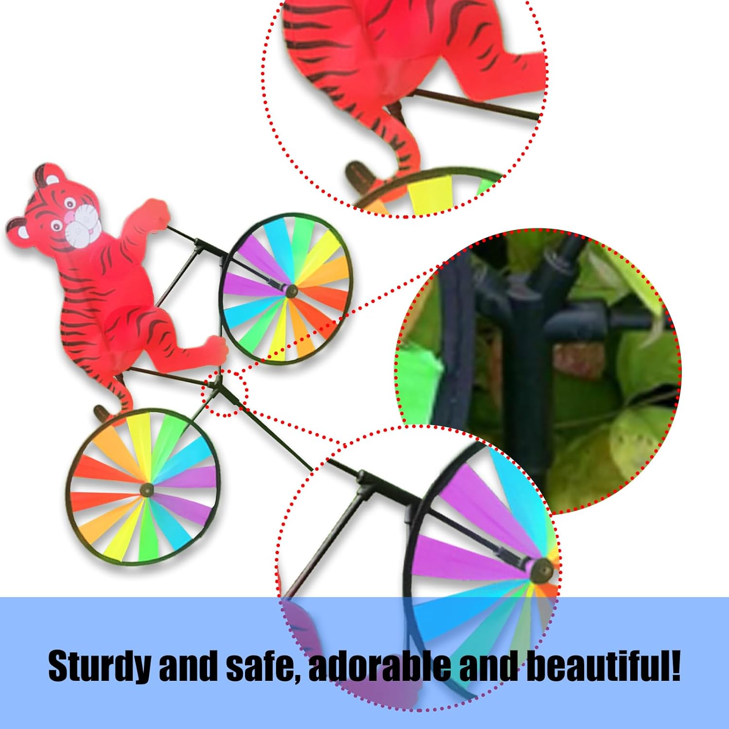 Migliora le feste in giardino o il percorso del giardino con i mulini a vento colorati arcobaleno che portano felicità a bambini e adulti Progettato per una facile installazione e resistenza agli agenti atmosferici tutto l'anno, questo stravagante mulino a vento mantiene tonalità vivaci attraverso il sole e la pioggia per un fascino duraturo del paesaggio I vivaci mulini a vento tigri con robusto palo creano decorazioni accattivanti resistendo ai forti venti, per migliorare giardini e cortili Ideale per famiglie, appassionati di campeggio e influencer dei social media che cercano accenti fotogenici per illuminare riunioni o creazione di contenuti Caratterizzato da animali in sella a una bicicletta, offre una facile conservazione e configurazioni rapide per una decorazione versatile all'aperto