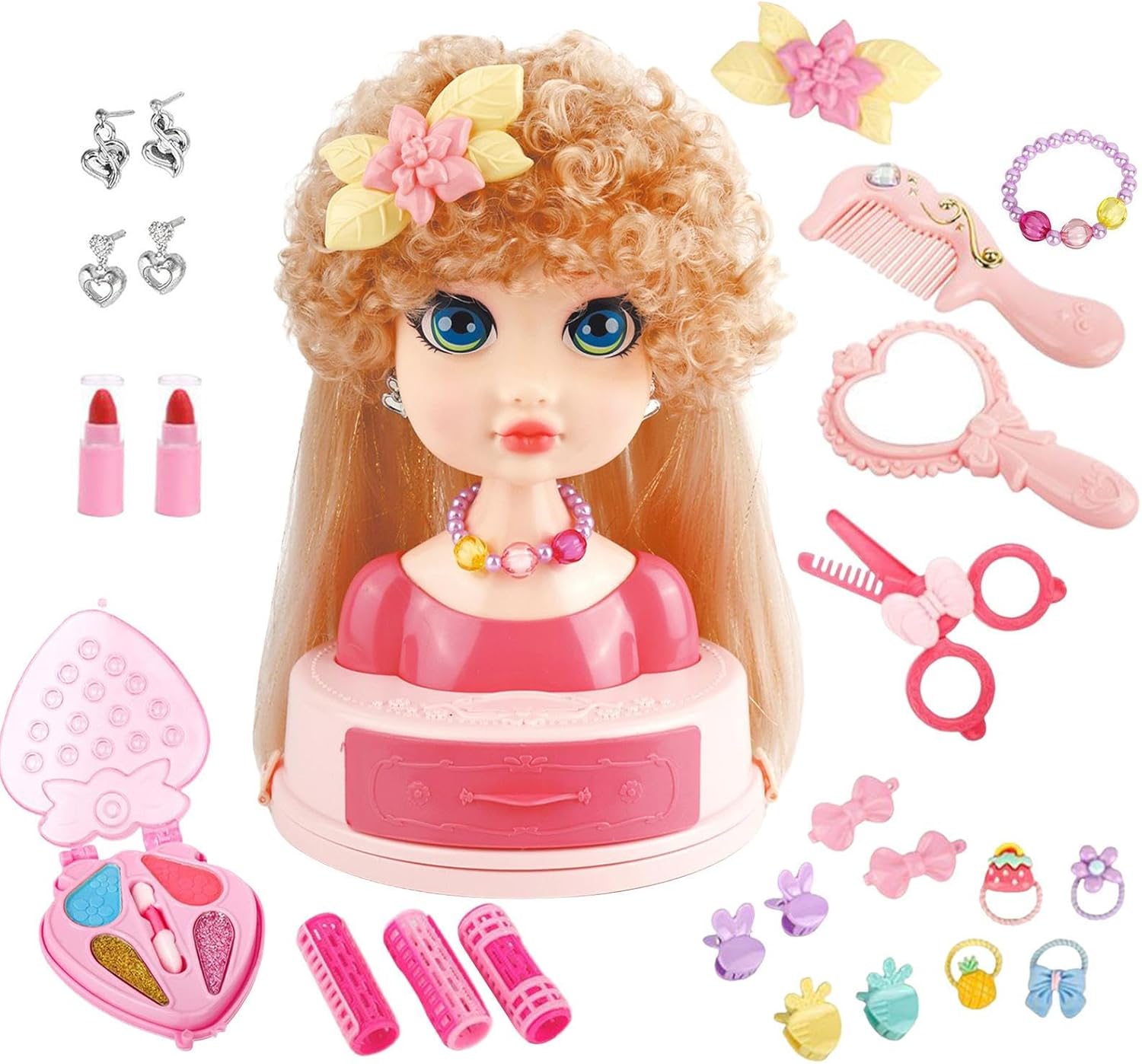 Creatività nello styling: incoraggia l'esplorazione delle tendenze dell'acconciatura e incoraggia l'immaginazione per coinvolgenti giochi di ruolo nello styling a casa. Gioco con i capelli ricci: i capelli ricci biondo dorato offrono una varietà di opzioni di styling. Con questa testa di bambola i bambini possono creare acconciature speciali e giocose pettinandole, intrecciandole e attorcigliandole e godendosi ore di gioco creativo. Promuove il gioco di ruolo: il set da gioco da 31 pezzi con asciugacapelli, ferro arricciacapelli e accessori per lo styling stimola attività fantasiose e supporta la rievocazione creativa delle visite dal parrucchiere. Sicurezza e realismo: realizzata in materiale ABS di alta qualità, inodore e senza spigoli vivi, questa testa giocattolo per parrucchiere offre la massima sicurezza dei bambini e un'esperienza di gioco realistica per un divertimento di ruolo di lunga durata. Bel regalo: combina l'esercizio per la cura dei capelli con l'intrattenimento. Promuove la creatività e l'interazione sociale attraverso giochi fantasy. Ideale come regalo per feste come compleanni o Natale.