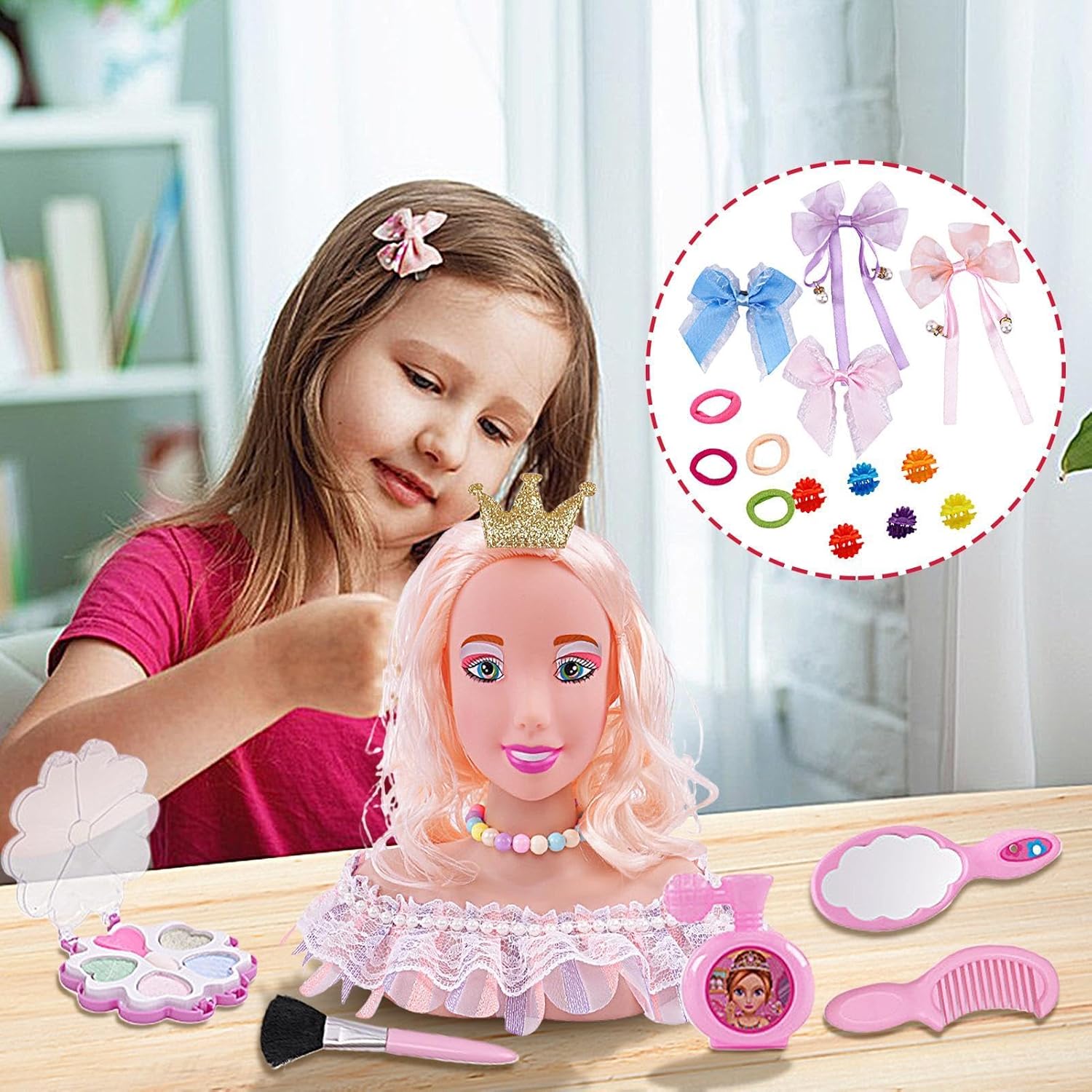 Aumenta la fiducia: la nostra testa di bambola per il trucco per ragazze è il giocattolo perfetto per incoraggiare la creatività e l'immaginazione, dando alle ragazze l'opportunità di dare alla loro bambola un aspetto unico ed esprimersi attraverso più possibilità di acconciatura in questo set di giochi di ruolo. Materiali sicuri: lascia che l'immaginazione di tuo figlio si scateni con la nostra testa di bambola per il trucco per ragazze realizzata con materiali sicuri. Il risultato è un prodotto sicuro e inodore realizzato in materiale PP di alta qualità, resistente alla deformazione e all'usura, che offre a genitori e bambini tranquillità mentre giocano. Bellissimo giocattolo per divertimento: preparati a entrare nel mondo dell'arte dei capelli con la nostra innovativa testa di bambola per il trucco per ragazze. Con capelli morbidi e vari accessori per capelli puoi creare facilmente acconciature nuove e fantasiose. Sperimenta e divertiti con questa bambola comoda e versatile Lavorazione sofisticata: grazie alla sua ottima fattura, questa testa di bambola per il trucco per ragazze offre un esterno liscio ed elegante che non graffierà le mani dei bambini. Le sue dimensioni perfette offrono una presa facile per i bambini da tenere e acconciare, e le caratteristiche ben realizzate offrono più opzioni per lo styling dei capelli. Idea regalo perfetta: ideale da regalare per compleanni, vacanze o altre occasioni speciali. Questo giocattolo è adatto a bambini dai 3 anni in su e catturerà sicuramente la loro attenzione. È la scelta perfetta per tenerli occupati e divertiti per ore