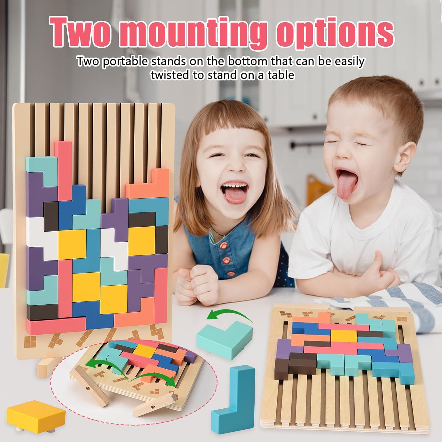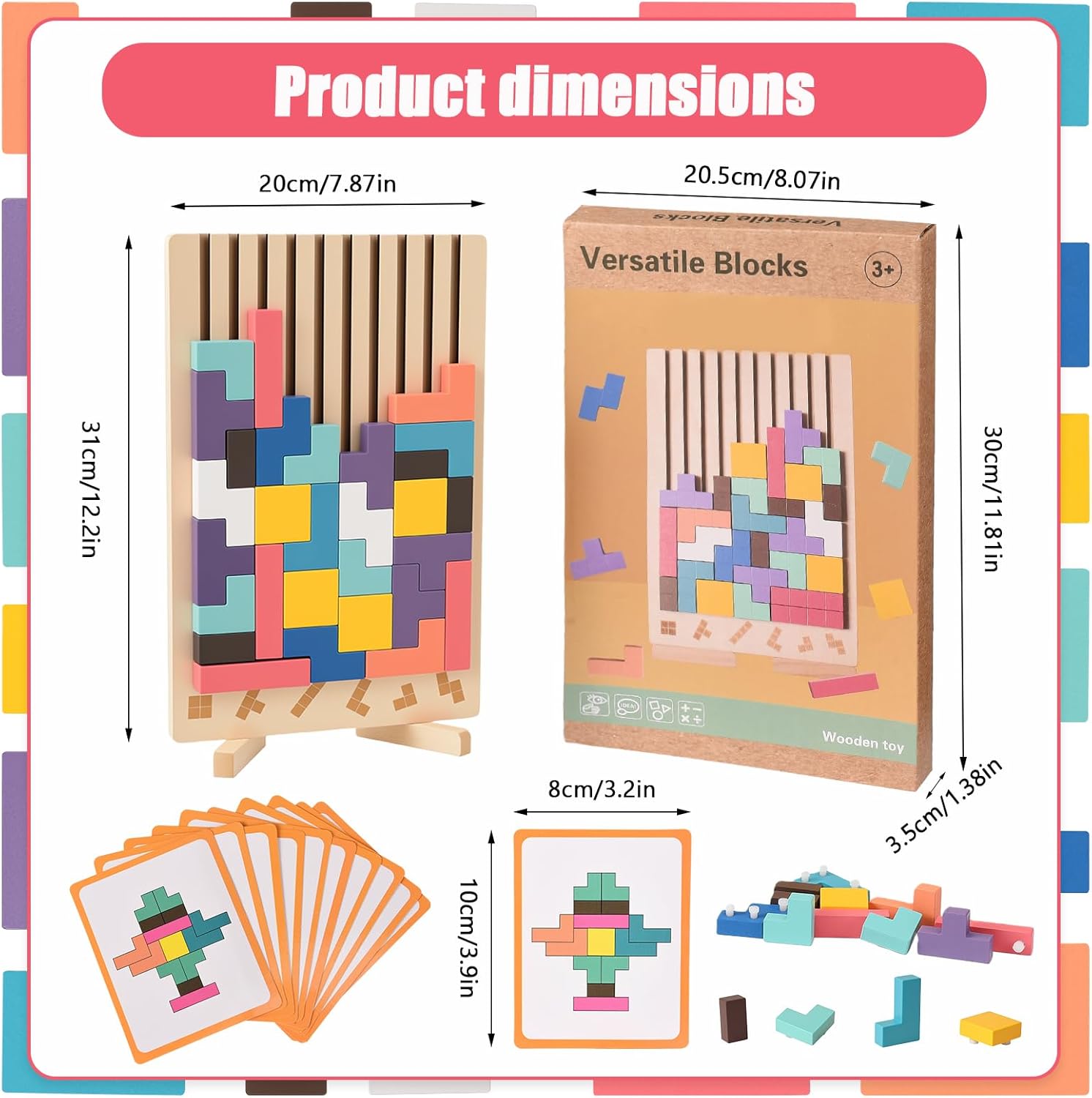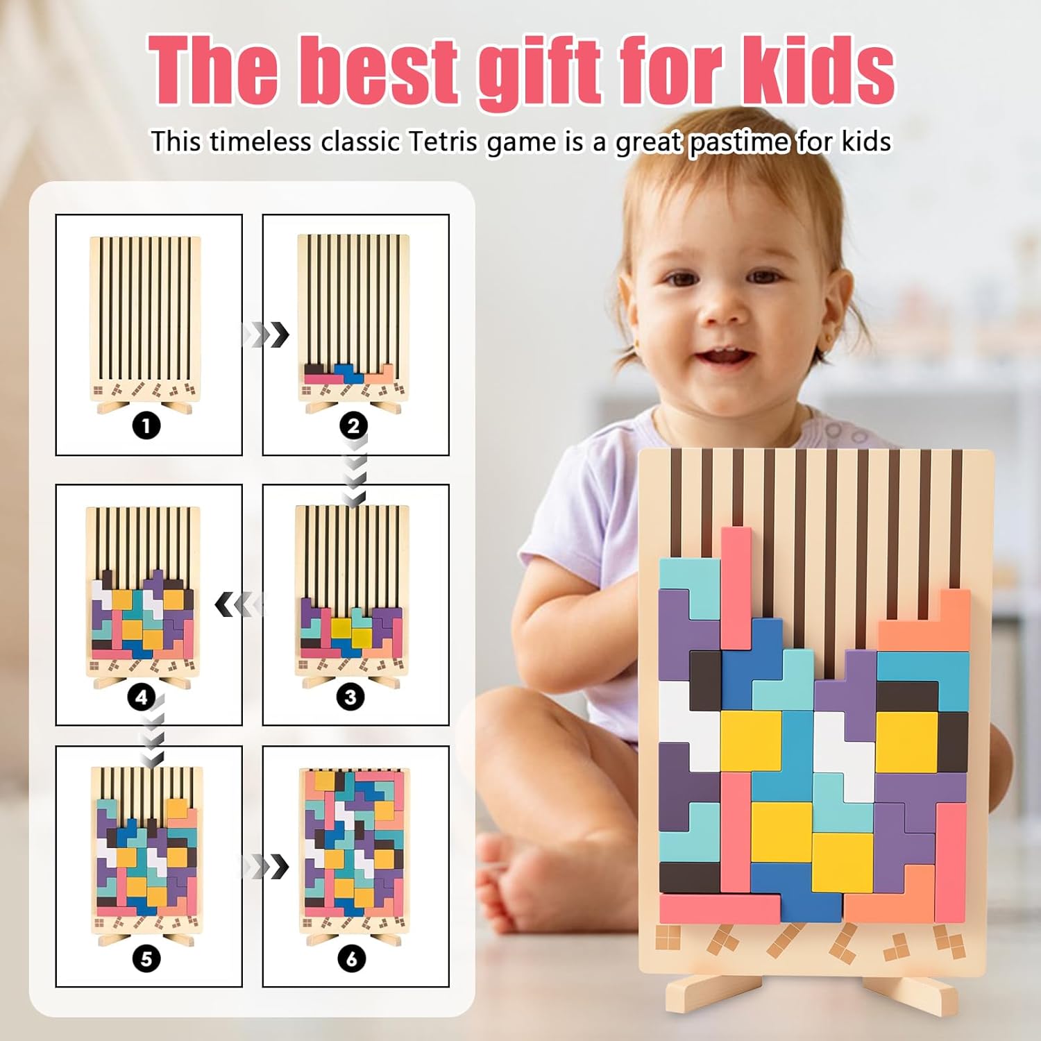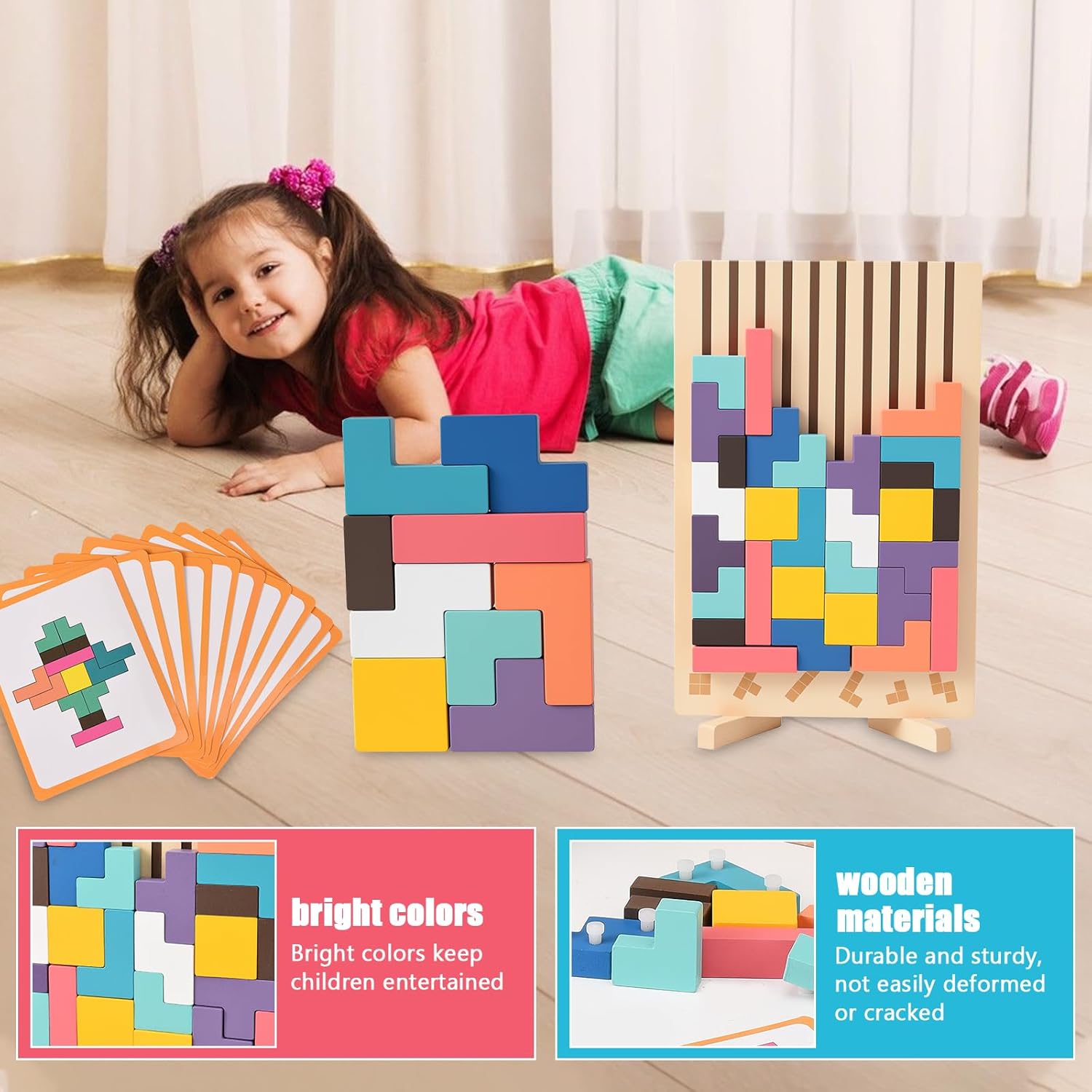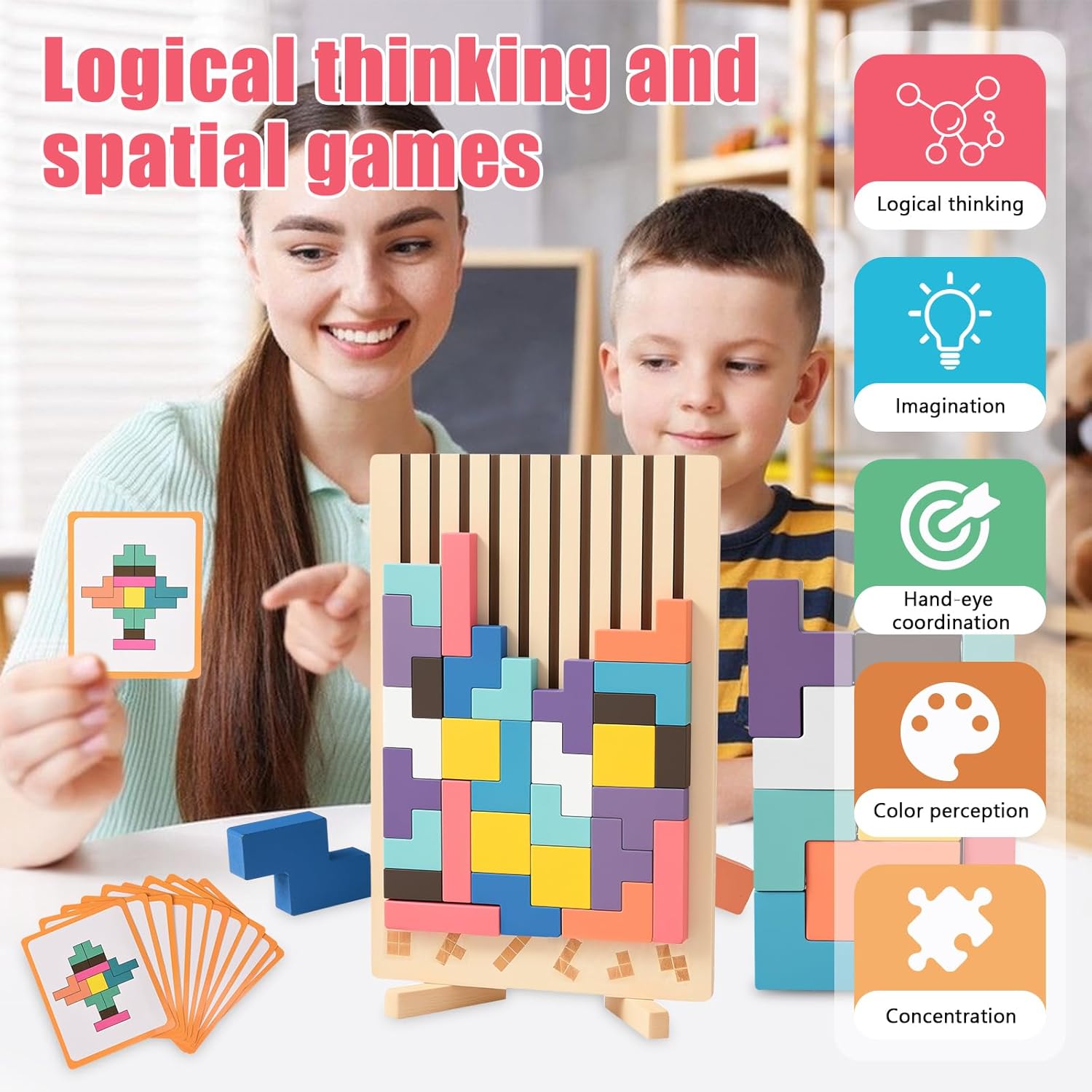 【Puzzle Tetris 3D】Riceverai un tetris contenente 9 forme uniche e 42 blocchi di costruzione in legno di media grandezza, insieme a 10 carte di sfida con modelli. Le ricche combinazioni di blocchi offrono creatività e divertimento infiniti 【Materiale sicuro】Questo puzzle impilabile in legno è realizzato in legno naturale di alta qualità, resistente e durevole. La superficie di rompicapo bambini è trattata con vernice atossica, finemente levigata, liscia e senza schegge, garantendo la sicurezza dei bambini 【Design premuroso】La base di smart games è dotata di due pratici piedini di supporto che, dopo la rotazione, si posizionano stabilmente su qualsiasi superficie senza ribaltarsi facilmente. Che sia a casa o in viaggio, i bambini possono godere di giochi creativi in qualsiasi momento e luogo 【Sviluppo educativo】Attraverso jenga bambini, i bambini possono esplorare infinite combinazioni di forme mentre migliorano il loro senso spaziale, pensiero logico, riconoscimento dei colori, concentrazione e coordinazione occhio-mano,真正做到边玩边学,permettere ai bambini di crescere con divertimento 【Regalo pratico】Questo giochi montessori 4 anni è adatto ai bambini per giocare da soli o per passare momenti piacevoli con familiari e amici. Che sia per un compleanno, una festa o una ricompensa in classe, è una scelta premurosa ed educativa, oltre che un regalo perfetto per i bambini