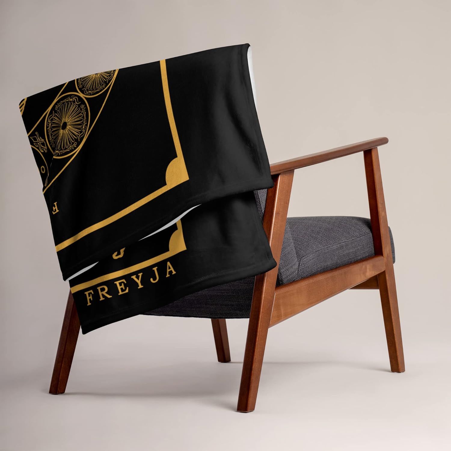 Presenta un'immagine vibrante e dorata di Freyja, la dea norvegese della guerra, della fertilità e Seiadow r, in ambientazione di carte dei tarocchi Dettagli a linea fine e colori vivaci intensi Tessuto morbido al tatto Lavabile in lavatrice Progettato negli Stati Uniti