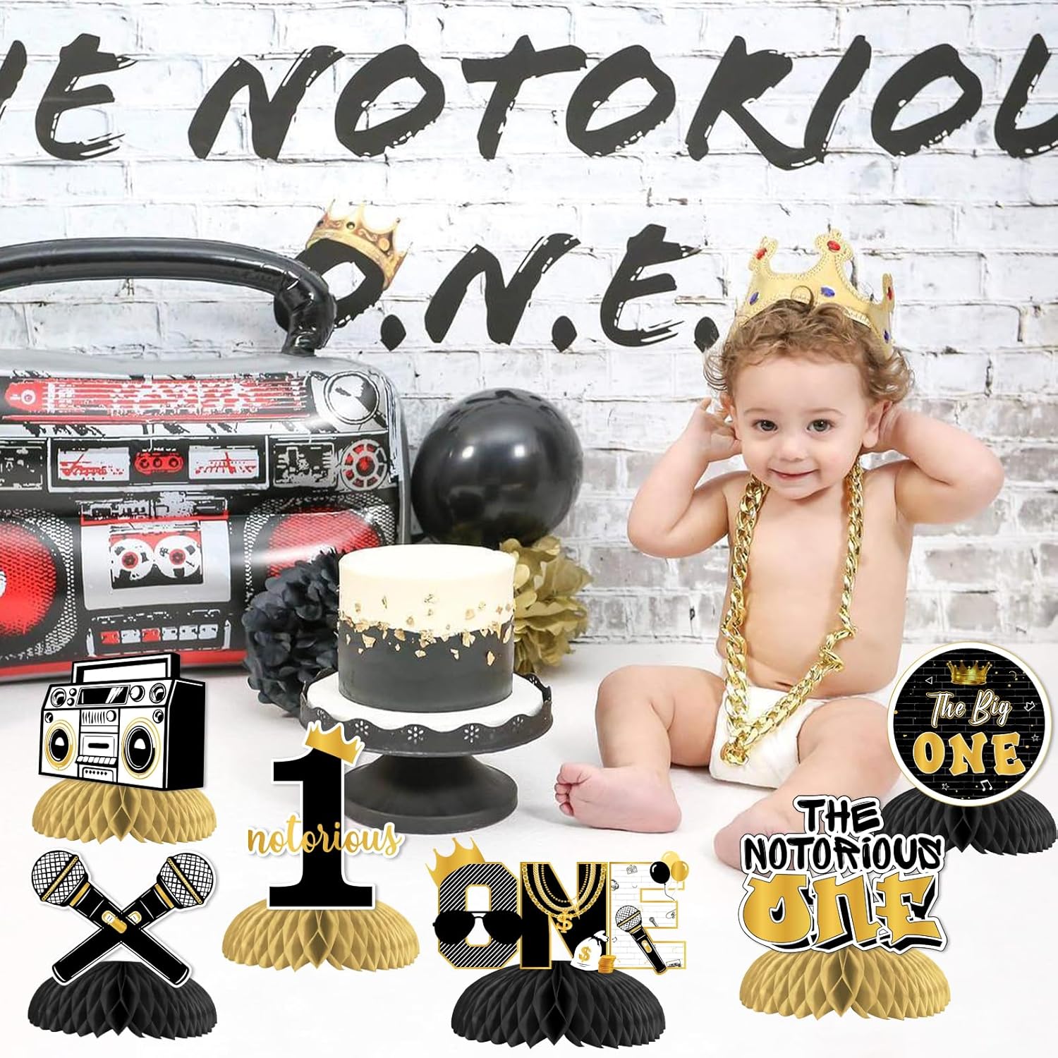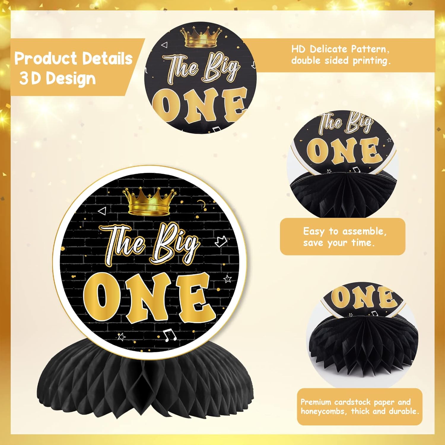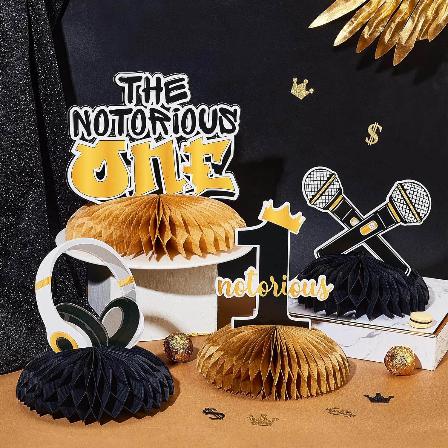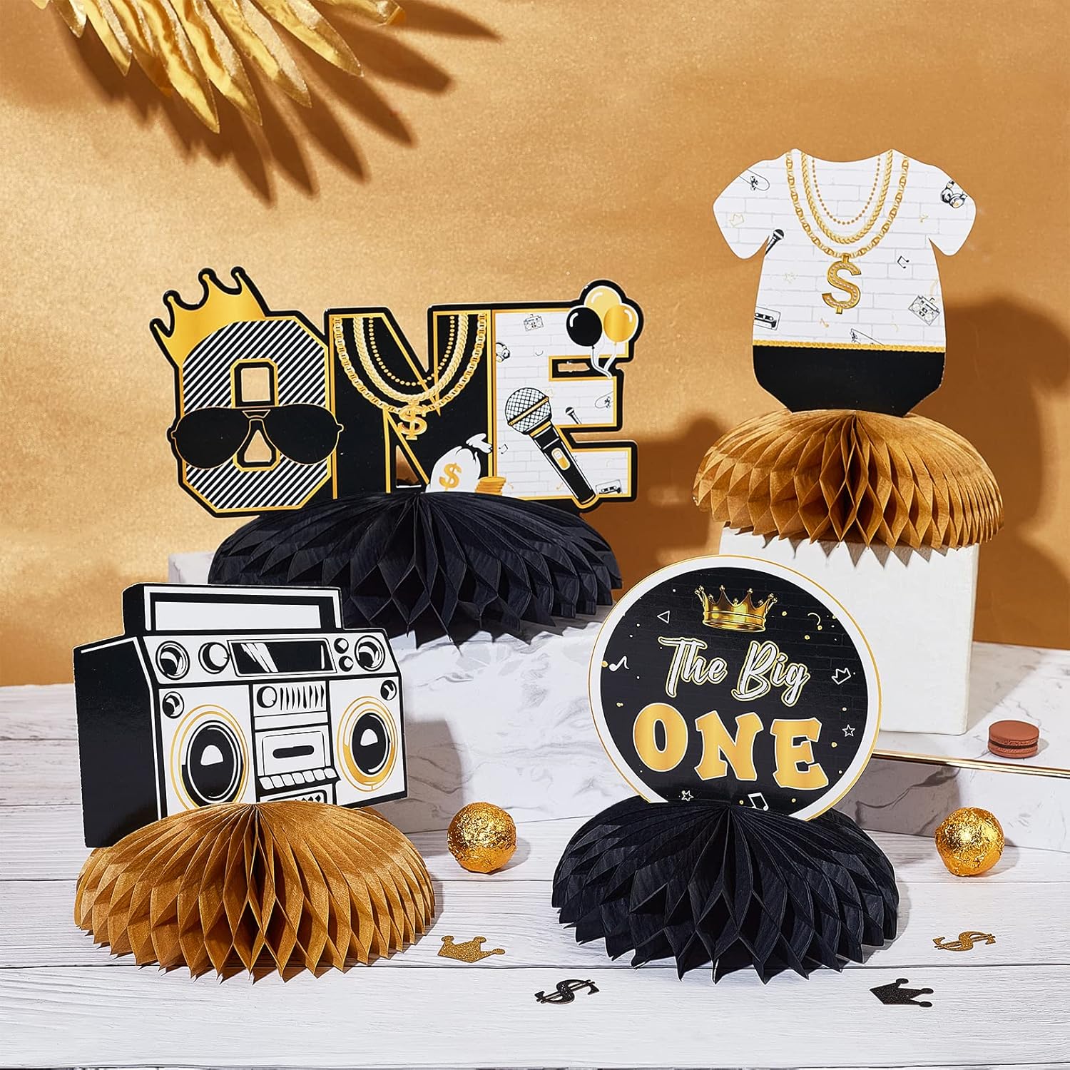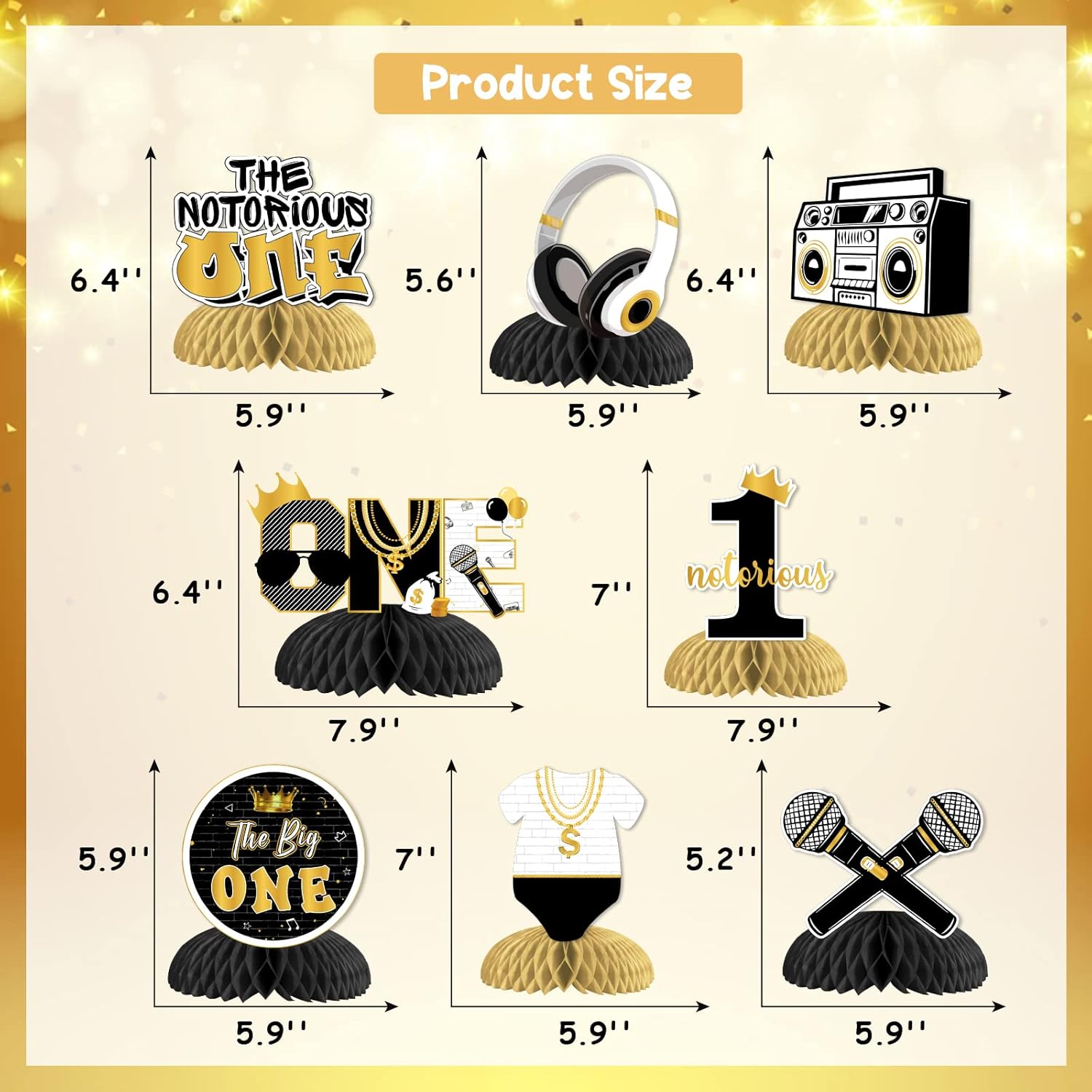 La confezione include: set di 8 decorazioni da tavolo a nido d'ape a doppia faccia nere e dorate, tra cui quella grande, radio boombox, rapper della vecchia scuola e altro ancora. L'altezza dei centrotavola è di circa 18,8-14,5 cm e di circa 15,2-20,1 cm di larghezza. The Big One Honeycomb Centerpieces: centrotavola 3D neri e dorati per il primo compleanno con disegni unici di personaggi famosi e microfono ti regaleranno una fantastica festa di compleanno. 【Facile da montare】: Passaggio 1: trova l'adesivo e rimuovilo dal nido d'ape. Passaggio 2: incolla il nido d'ape sul fondo della carta e fissalo. Passaggio 3: aprire delicatamente la pallina a nido d'ape manualmente. Quindi otterrai una decorazione da tavolo perfetta. Ampio utilizzo: le decorazioni da tavolo Big One sono perfette per creare una divertente festa di compleanno di un anno e possono essere utilizzate anche per il primo compleanno hip-hop e le feste degli anni '90, ecc. ALTA QUALITÀ: i nostri centrotavola neri e dorati sono i famosi centrotavola con stampa high-tech e materiale robusto. Non si romperà facilmente e potrà servirti a lungo.
