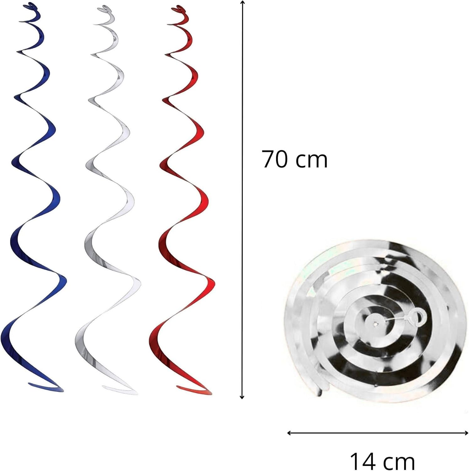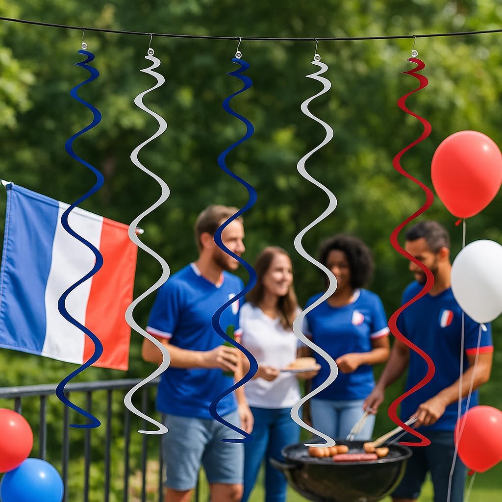 Effetto metallico di alta qualità: la superficie riflettente amplifica la luce e crea riflessi spettacolari. Installazione semplificata: il sistema di aggancio integrato consente un'installazione rapida e sicura. Resistenza ottimale: il design rinforzato resiste a ripetute manipolazioni e a un uso intensivo. Il design a spirale ottimizza la resistenza meccanica mantenendo la fluidità del movimento. Usi consigliati: 14 luglio, celebrazioni repubblicane, commemorazioni patriottiche, eventi sportivi, cerimonie ufficiali, compleanni a tema, serate patriottiche, feste di famiglia.