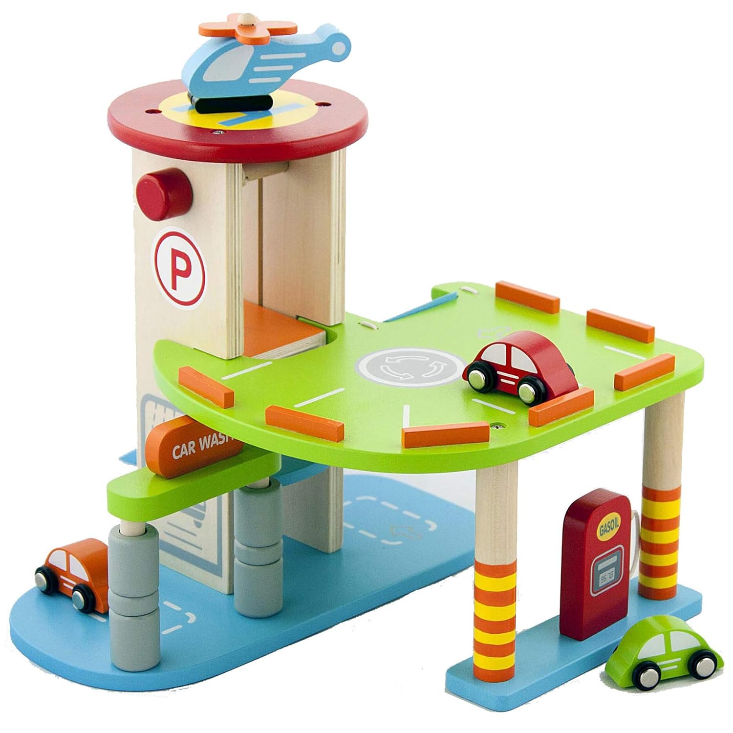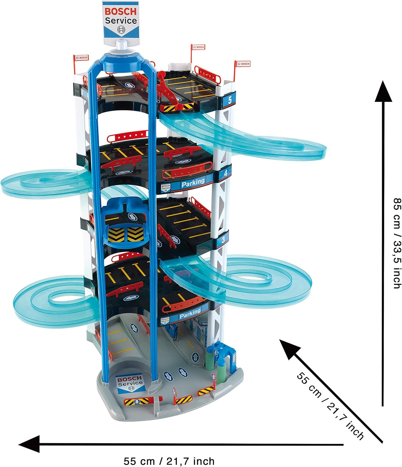 Con la sua doppia rampa di uscita, sulla quale due auto da corsa corrono, il parcheggio soddisfa sogni dei piccoli appassionati di auto e dei piloti l'ascensore porta le auto in dotazione al quinto piano, da dove effettuano la partenza ottima, sfrecciando giù Arrivate al piano basso, le auto possono essere rifornite presso il Service-Center e lavate l'autosilo stabile e di alta qualità nel design Car Service Bosch forma la creatività così come il ragionamento spaziale Dimensioni: 55 cm x 55 cm x 85 cm Adatto ai bambini a partire dai tre anni di età