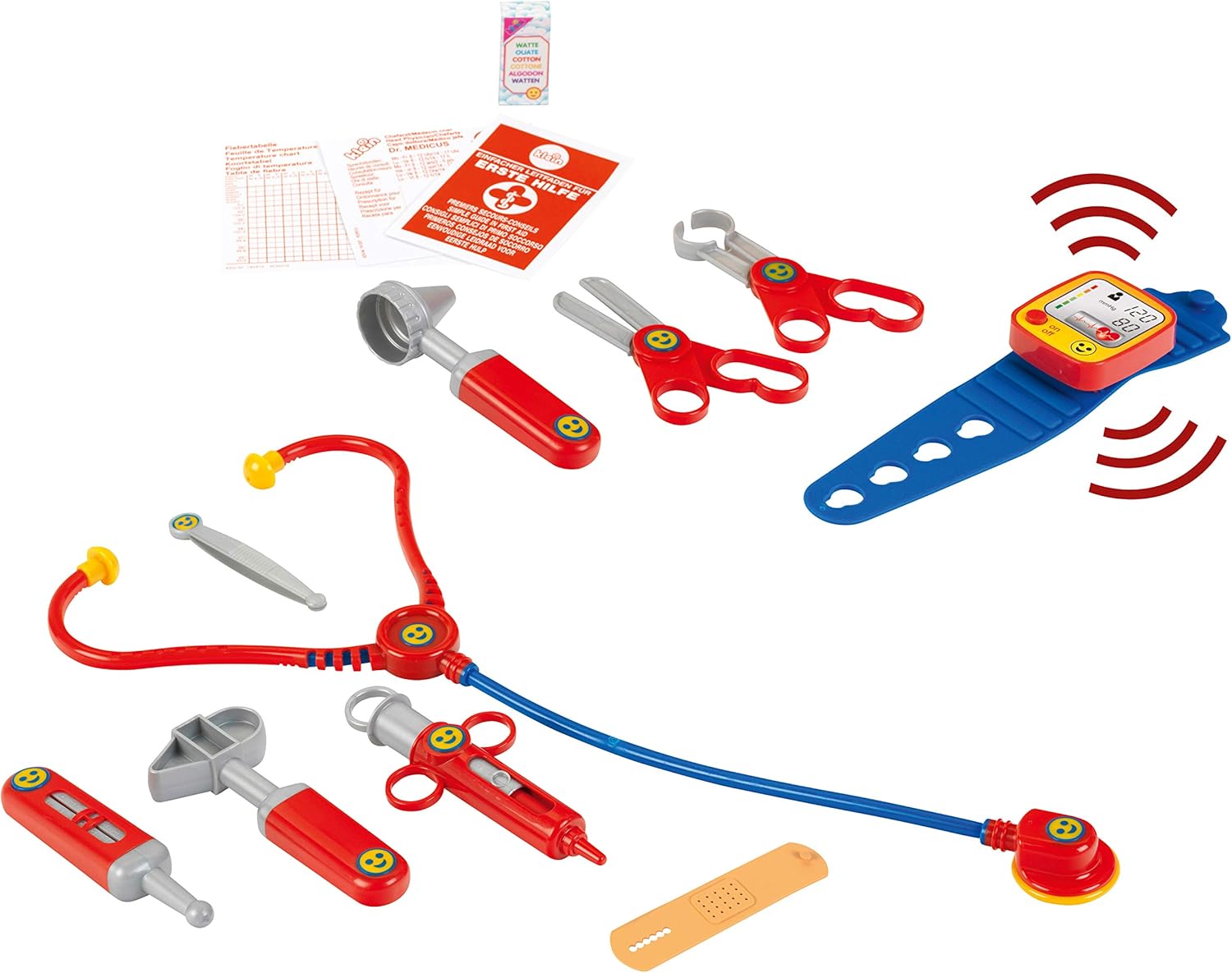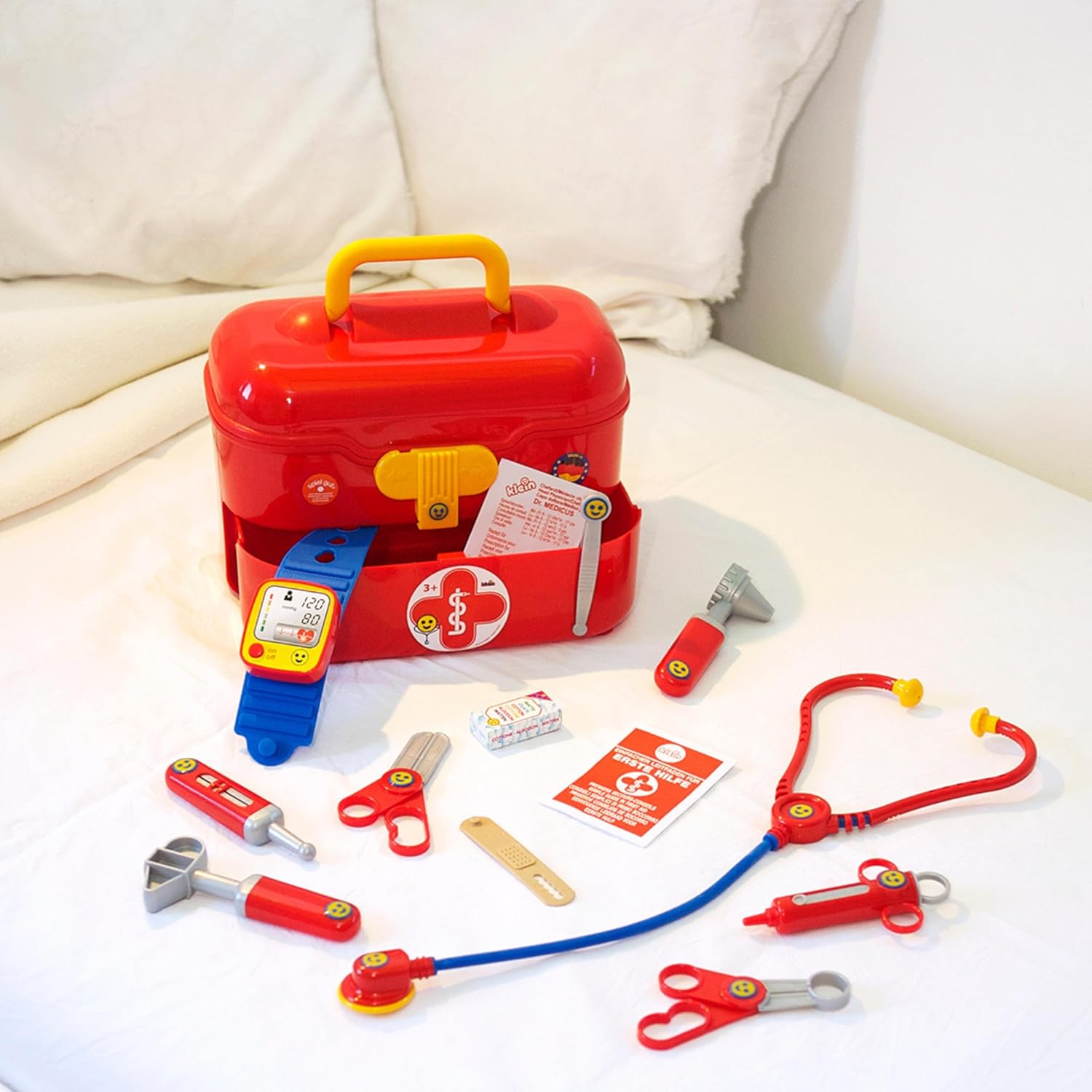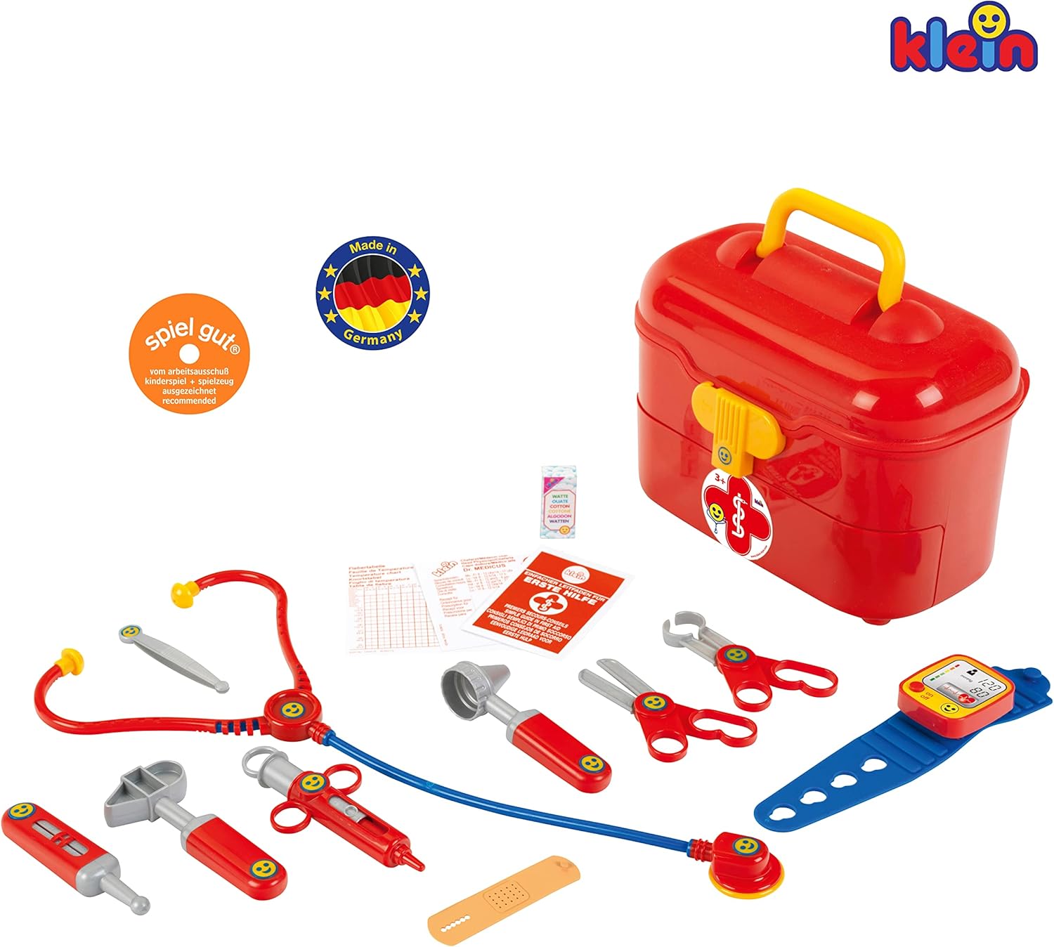 Questa valigetta del dottore di grande qualità ha una pratica maniglia e tutto il necessario per visitare e curare rapidamente le bambole e gli animaletti di peluche La valigetta del dottore contiene accessori di alta qualità, tra cui lo stetoscopio, il martelletto per riflessi, lo specchietto auricolare e tant'altro Il misuratore elettronico di pressione sanguigna (a batteria e con effetti sonori) sarà al centro dell'attenzione dei piccoli infermieri Questi graziosi accessori a misura di bambino sviluppano le capacità motorie attraverso il gioco, e possono alleviare la paura di quando si va dal dottore Prodotto in Germania Dimensioni: 25 cm x 15 cm x 20 cm Adatto a bambini dai 3 anni in su Batterie richieste: 2 x R03-AAA non incluse