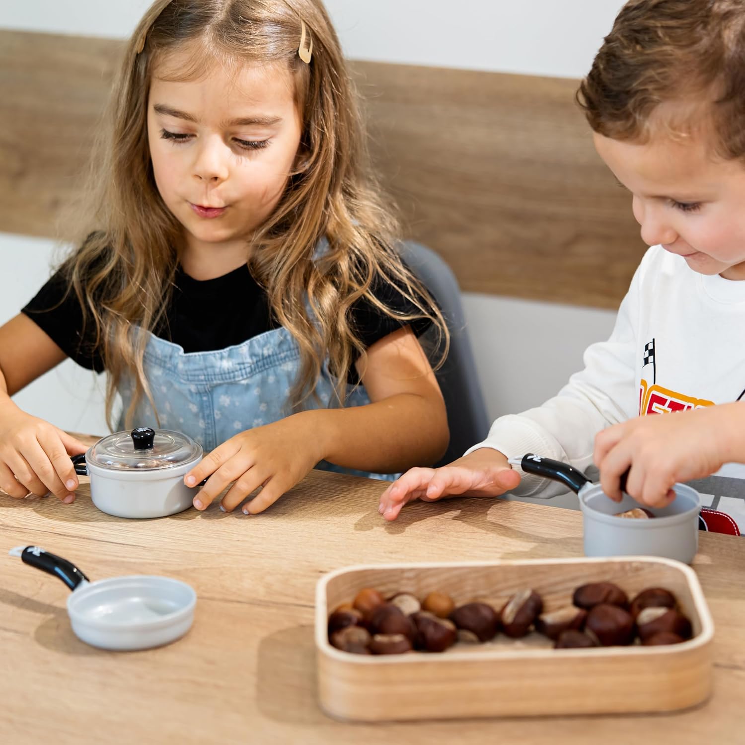 Il set base per intenditori e amici degli utensili da cucina di alta qualità contiene tutto ciò che servef per preparare prelibatezze nella loro cucina giocattolo Grazie alla robusta padella, le due pentole, una delle quali con coperchio, potete allegramente friggere e cuocere la minestra sui fornelli da gioco Il set di cucina da gioco nell'elegante design WMF è costruito in plastica di alta qualità Mescolare quel che bolle in pentola, preparare e rigirare le finte uova e patate fritte in padella non è solo divertente, ma allena anche le abilità motorie e la creatività Grazie alle sue dimensioni, l'alta qualità e la robustezza del prodotto, la cucina giocattolo è adatto per bambini dai 3 anni in su