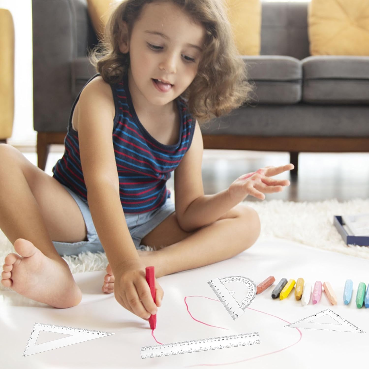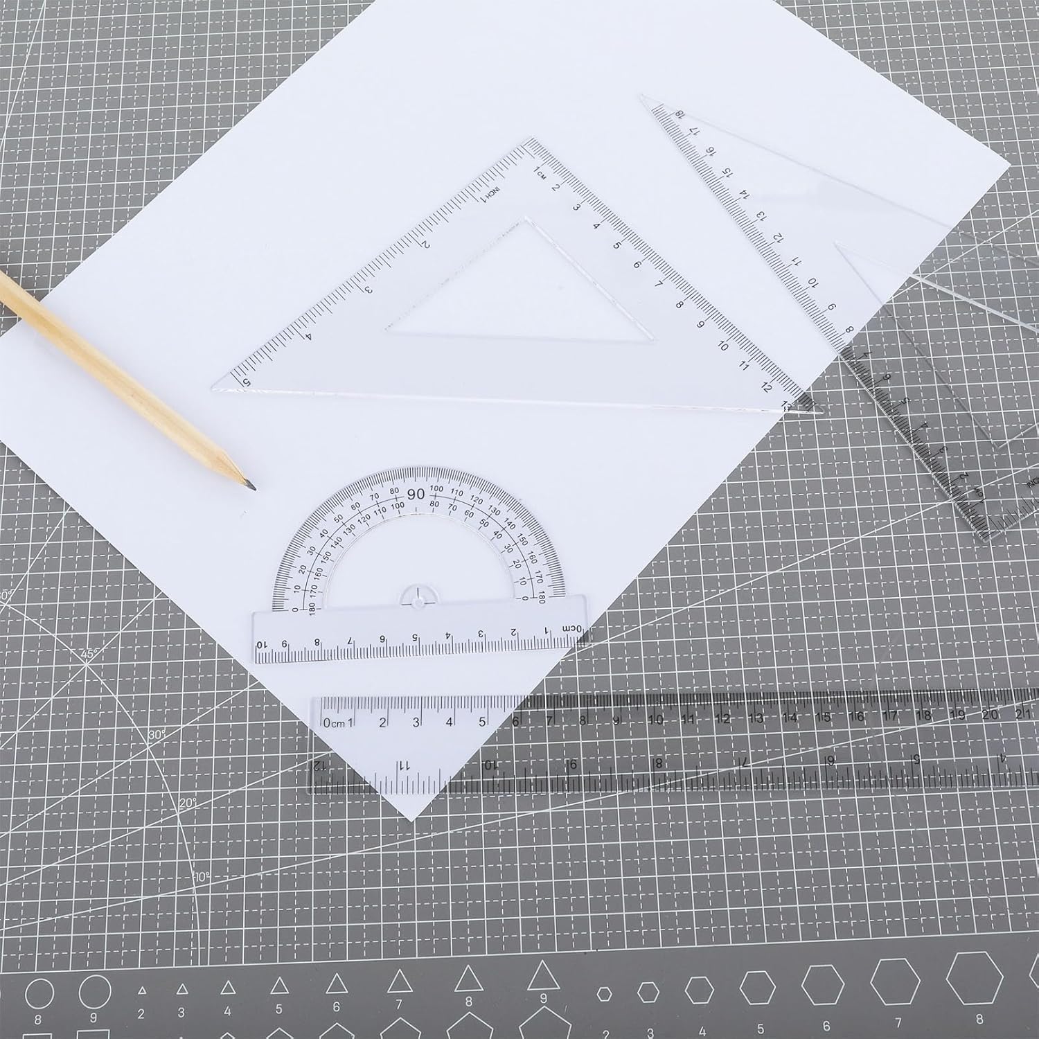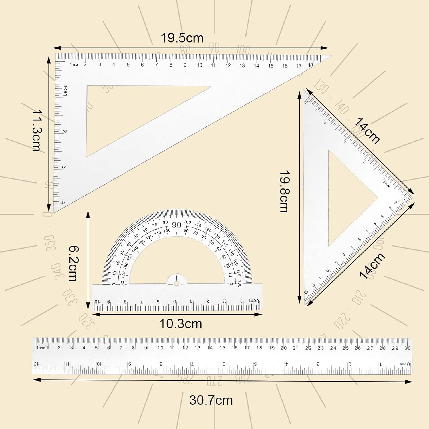 Materiale di alta qualità: il set di righelli in plastica è realizzato in plastica di alta qualità, robusto e resistente all'usura, non facile da rompere e sbiadire, non facile da rompere, può essere utilizzato ripetutamente per lungo tempo. Confezione: riceverai 1 righello in scala 30 cm, 1 tavola triangolare ad angolo retto in scala 18 cm, 1 tavola triangolare isoscele in scala 13 cm, 1 goniometro in scala 10 cm, il set completo soddisfa le esigenze di diverse occasioni. Grado accurato: il righello ha un design trasparente, ben fatto, aspetto liscio, non facile da graffiare, scala chiara, misurazione accurata, facile da leggere e misurare. Facile da usare: set di righelli in plastica con scala chiara, facile da usare e leggere, puoi utilizzare il set di righelli in plastica con lettere e numeri mostrati sul lato per la tua comodità. Ampiamente applicato: è un ottimo strumento di disegno e misurazione, i colori ricchi aumentano il divertimento dell'insegnamento, perfetto per studenti, insegnanti e ingegneri, ecc., è uno strumento di apprendimento essenziale.
