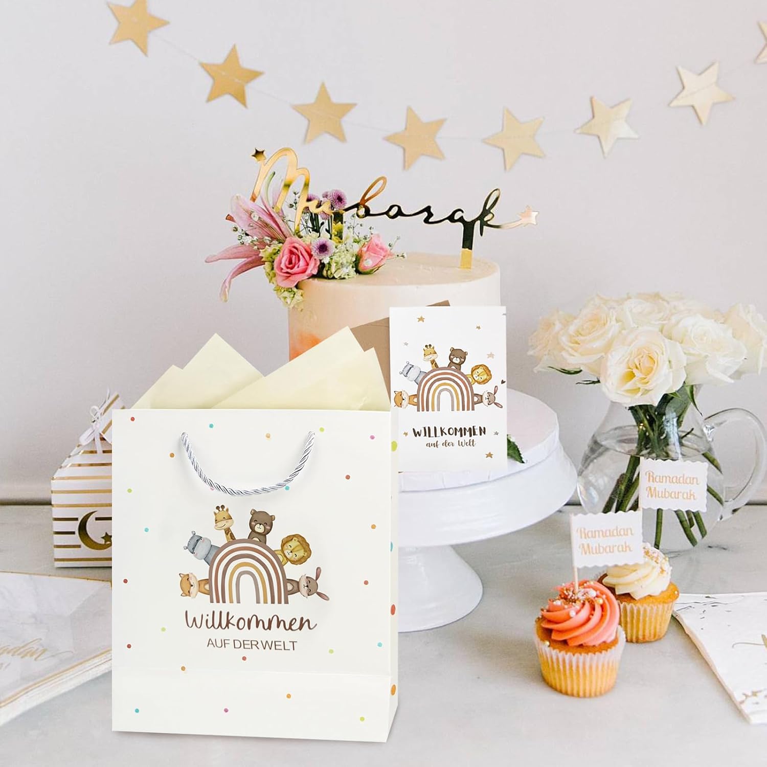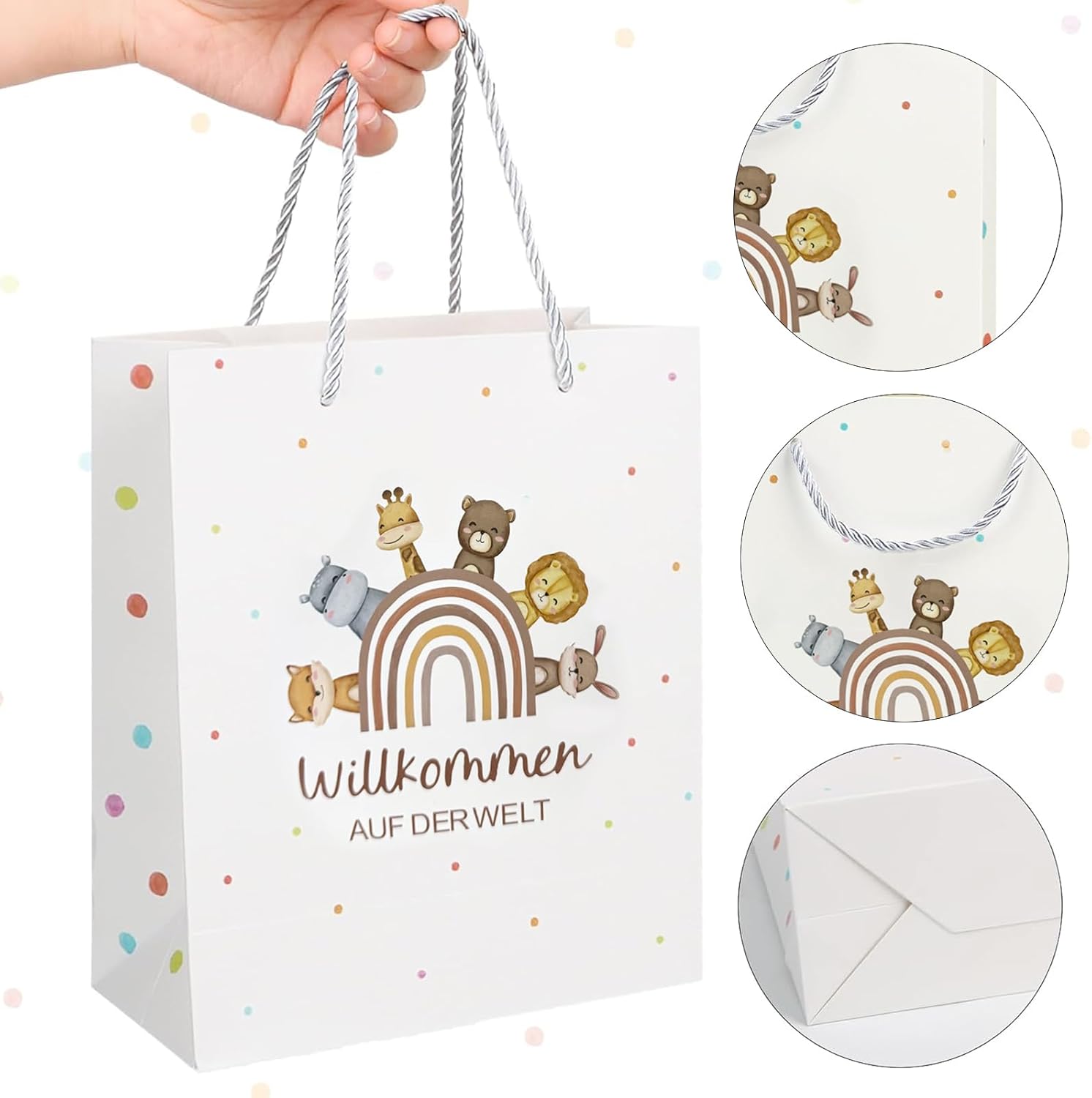 Fornitura: 1 sacchetto regalo con "Benvenuti nel mondo", 1 biglietto di auguri e 1 foglio di carta velina color crema Dimensioni: ogni sacchetto regalo misura ca. 21x11x27 cm, ogni carta velina misura 50x70 cm, puoi usare la carta velina per decorare il sacchetto regalo o per avvolgere un piccolo regalo Materiale: Realizzato in carta Confezione regalo: Bellissimi accessori come decorazione e confezione per una nascita, baby shower o baby shower Borse da riempire: Spazio sufficiente per confezionare regali, regali in denaro, dolci, torte, bomboniere, questi sacchetti regalo hanno una maniglia con coulisse, facili da trasportare