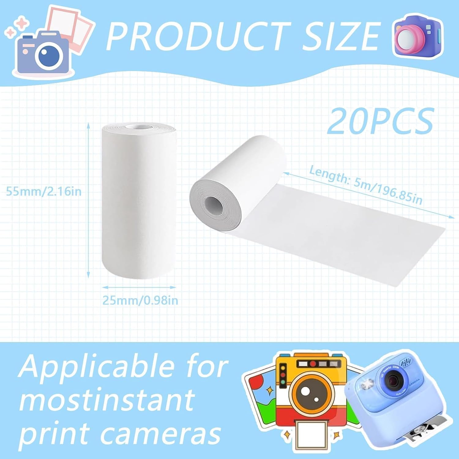 Alta Qualità: Realizzata con carta termica per macchina fotografica bambini di prima scelta, liscia e resistente per stampe nitide e durature Grande Quantità: La confezione include 20 rotoli da 57x25mm (5m) compatibili con macchina fotografica bambini stampa, ideale per uso quotidiano Facile da Usare: Ogni rullino fotografico è tagliato con precisione per un'alimentazione fluida, nessun inceppamento durante l'uso Stampa Rapida: Perfetto per macchina fotografica istantanea bambini – stampa immediata dopo ogni scatto, ottimo per attività scolastiche e giochi creativi Ampia Compatibilità: Ideale per mini stampanti, POS, o macchina fotografica per bambini – stampa foto, testi, adesivi, etichette e appunti
