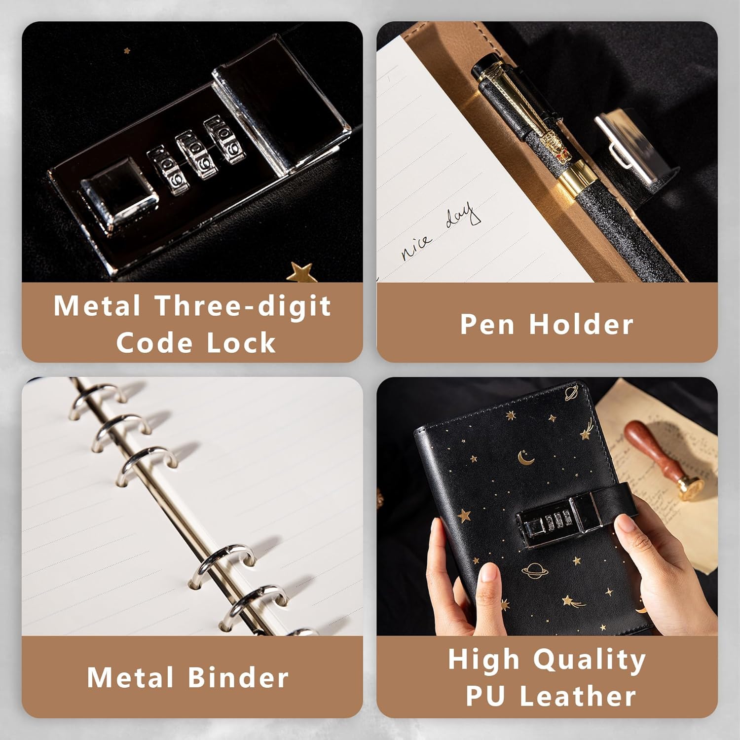 Taccuini privati: lucchetto a combinazione in metallo, codice password a tre cifre da 0 a 9. La password originale è 0-0-0, il lucchetto verrà aperto quando inserito correttamente. Non preoccuparti che gli altri vedano i tuoi segreti. Se dimentichi la password, puoi contattarci per risolverlo. Diario in pelle: pelle sintetica di alta qualità, tocco delicato, resistente all'usura. Motivo a stelle stampato a caldo sulla copertina. Un ottimo regalo per bambini, amici, parenti. Diario in carta ricaricabile: 80 fogli/160 pagine di carta senza legno da 100 g/m², raccoglitore a 6 anelli, formato carta: 10,13 x 17,5 cm, facile da sostituire. Diario portatile: copertina in pelle: 5,12 × 18,5 cm × 3,8 cm, 0,5 kg, leggero e portatile, può essere trasportato in una valigetta o in borsa, utilizzato in qualsiasi momento, registra la vita quotidiana. Regalo perfetto: un diario è il tuo compagno perfetto perché ti consente di esprimere i tuoi pensieri e sentimenti, fissare obiettivi e compiti, mantenendo i tuoi pensieri privati. Questo diario in pelle vintage è adatto a tutti. Un fantastico regalo di compleanno, Natale o anniversario