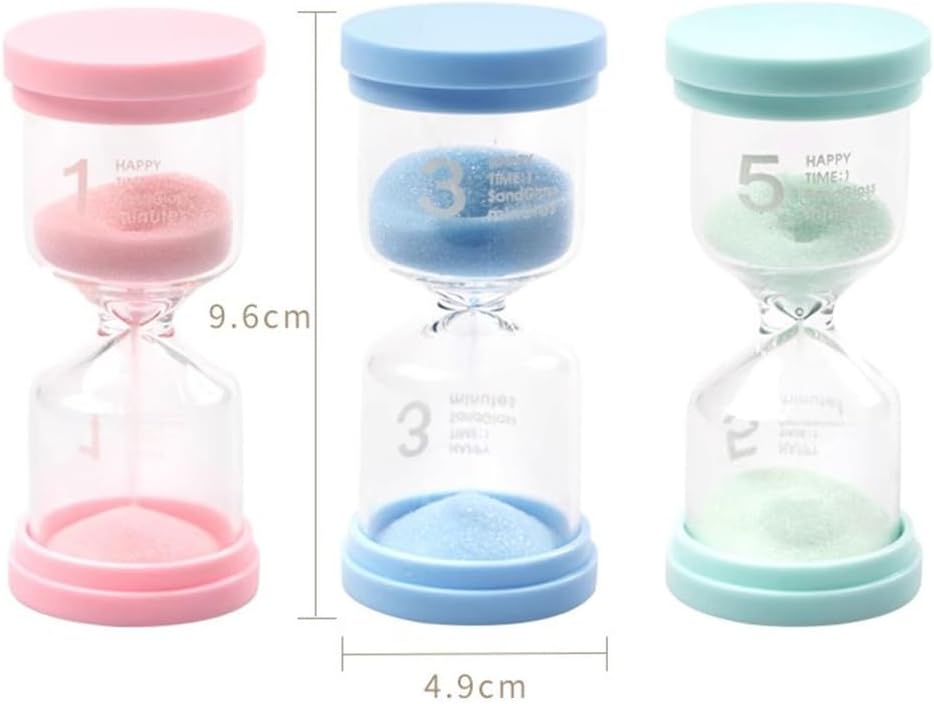Sviluppa la comprensione del tempo: il timer a clessidra è uno strumento visivo per comprendere il concetto di tempo e supporta la comprensione delle transizioni all'interno delle loro routine da parte dei bambini. Pratico e facile da usare: questo funzionale timer per sabbia è facile da portare con sé e può essere utilizzato per girare i turni, finire un puzzle, leggere, pulire, lavarsi i denti, timeout e attività in classe. Regalo per ogni occasione: L'orologio timer è una classica idea regalo per i tuoi nipoti o i tuoi cari nei loro giorni speciali durante tutto l'anno. Si prega di notare che questo timer per sabbia non è un dispositivo di precisione, quindi c'è una piccola deviazione di tempo. Colore: Rosa (1 minuto) Blu (3 minuti) Verde chiaro (5 minuti). Materiali principali: coperchio in plastica, vetro.