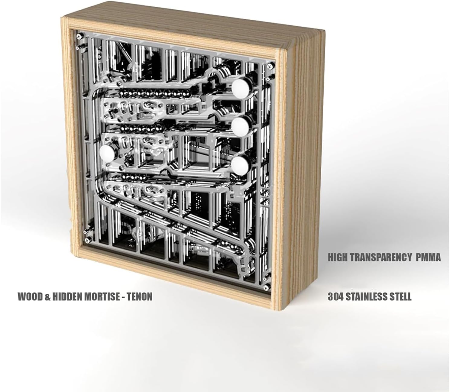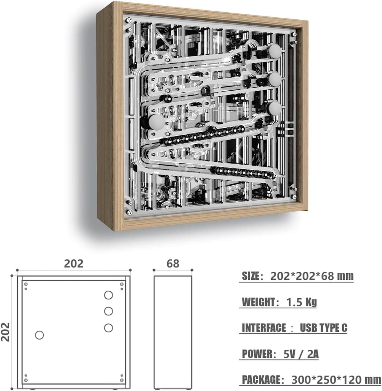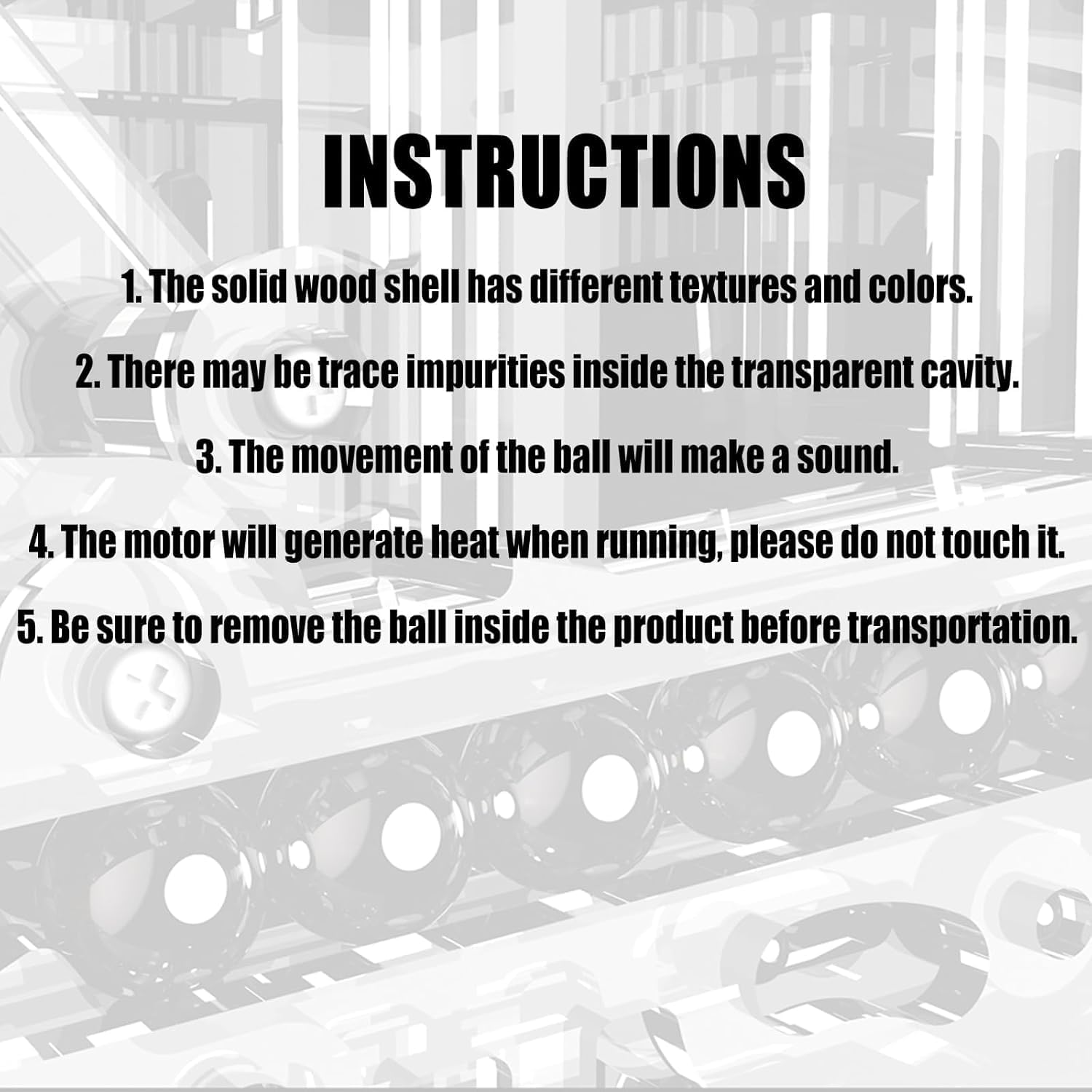 Costruzione in legno massello con texture naturale e variazioni di colore per un look unico. Il materiale PMMA altamente trasparente può contenere piccole impurità interne per migliorarne la chiarezza. Presenta quattro piste in cui il movimento della sfera crea un rumore udibile durante il funzionamento. Il motore genera calore durante l'uso, evitare il contatto per evitare fastidi o lesioni. Include sfere in acciaio inossidabile 304, rimuoverle prima del trasporto per garantire la sicurezza.