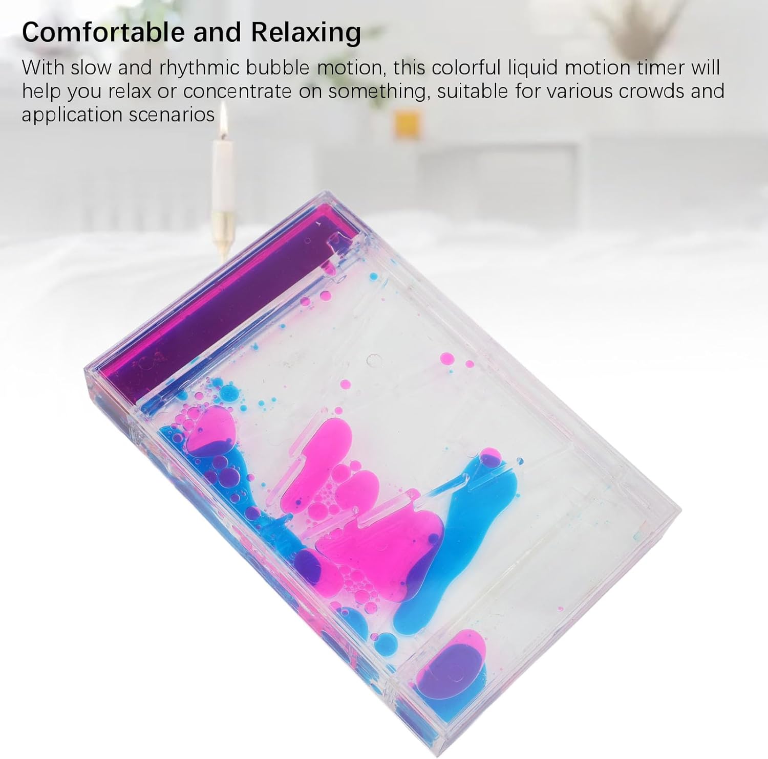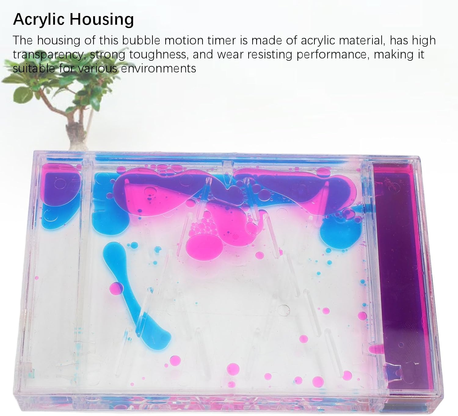 Effetto visivo incantevole: questo timer di movimento liquido fornisce un fascino visivo colorato, con bolle rosse e blu che si muovono al rallentatore, fornendo effetti affascinanti che ti mantengono felice per ore Conforzo e rilassante: con movimento a bolle lento e ritmico, questo colorato timer di movimento liquido ti aiuterà a rilassarti o concentrarti su qualcosa, adatto a varie folle e scenari di applicazione Uso versatile: questo gorgogliatore di movimento liquido è adatto a tutte le fasce d'età, dai bambini agli adulti, fornendo loro un giocattolo pratico per l'intrattenimento e il rilassamento quotidiani e ha una vasta gamma di applicazioni Presente interessante: questo timer di movimento liquido può anche essere servito come un pratico o un per le vacanze, o come donatore, fornitura di classe, ecc., Da dare alla tua famiglia, amici, colleghi o studenti Alloggiamento acrilico: l'alloggio di questo timer di movimento a bolle è realizzato in materiale acrilico, ha un'alta trasparenza, forte tenacità e prestazioni di resistenza all'usura, rendendolo adatto per vari ambienti