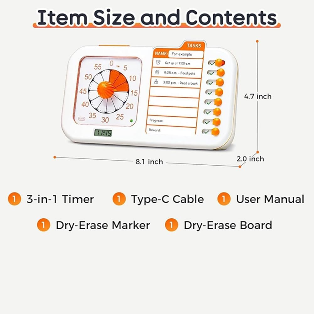 [Facile da usare]: dotato di un timer visivo per il conto alla rovescia, basta ruotare la manopola in senso orario per impostare l'ora. Fai scorrere l'interruttore per contrassegnare le attività come completate, promuovendo la responsabilità e migliorando le capacità di gestione delle attività. Bambini e adulti possono comprendere visivamente il passare del tempo, rendendo più facile combattere la procrastinazione e la scarsa consapevolezza del tempo [Funzionamento silenzioso]: goditi un timer ticchettio, perfetto per ambienti silenziosi come aule e biblioteche. L'allarme regolabile ti consente di scegliere tra notifiche sonore o luminose per un'esperienza distrazioni. Questa versatilità lo rende ideale come timer per lo studio, timer da cucina o timer per l'allenamento [Ideale per l'istruzione speciale]: progettato per bambini e adulti con ADHD, autismo e altre difficoltà di apprendimento, questo orologio adhd supporta l'autoregolamentazione e le transizioni fluide tra i compiti. È consigliato per l'istruzione speciale (strumento adhd per bambini) e l'istruzione elementare precoce, aiutando gli studenti a rimanere coinvolti e concentrati sui compiti [Strumento di gestione del tempo ]: questo timer da 60 minuti con lavagna di pianificazione cancellabile a secco combina un timer digitale, un timer visivo e un di cose da per traccia di faccende, compiti e routine quotidiane. Aumenta la produttività, crea consapevolezza del tempo e aiuta a rispettare i tempi, ideale per migliorare la concentrazione e la gestione del tempo [Regalo versatile e premuroso]: adatto per aule, casa, cucina, ufficio, questo timer visivo funziona come un tracker di attività, un orologio con conto alla rovescia e una lavagna bianca. È un regalo fantastico per studenti, insegnanti e professionisti che cercano di migliorare la produttività e l'indipendenza. È lo strumento fantastico per promuovere la concentrazione, la responsabilità e le capacità di gestione del tempo