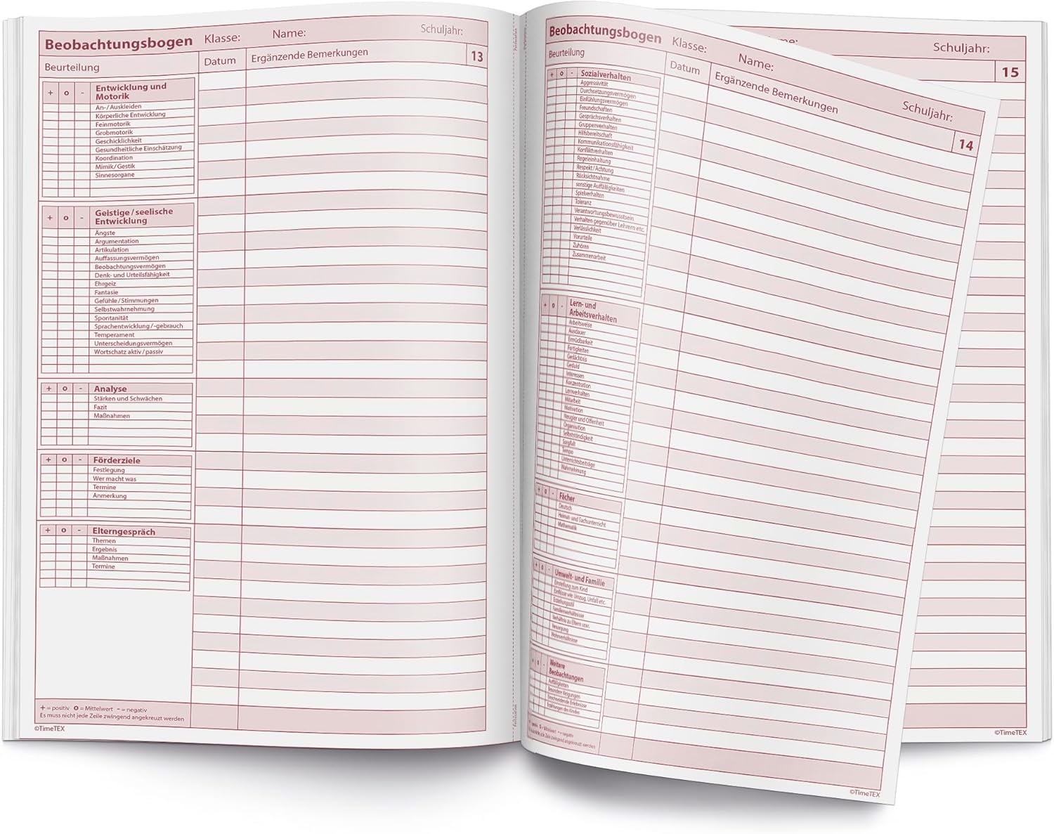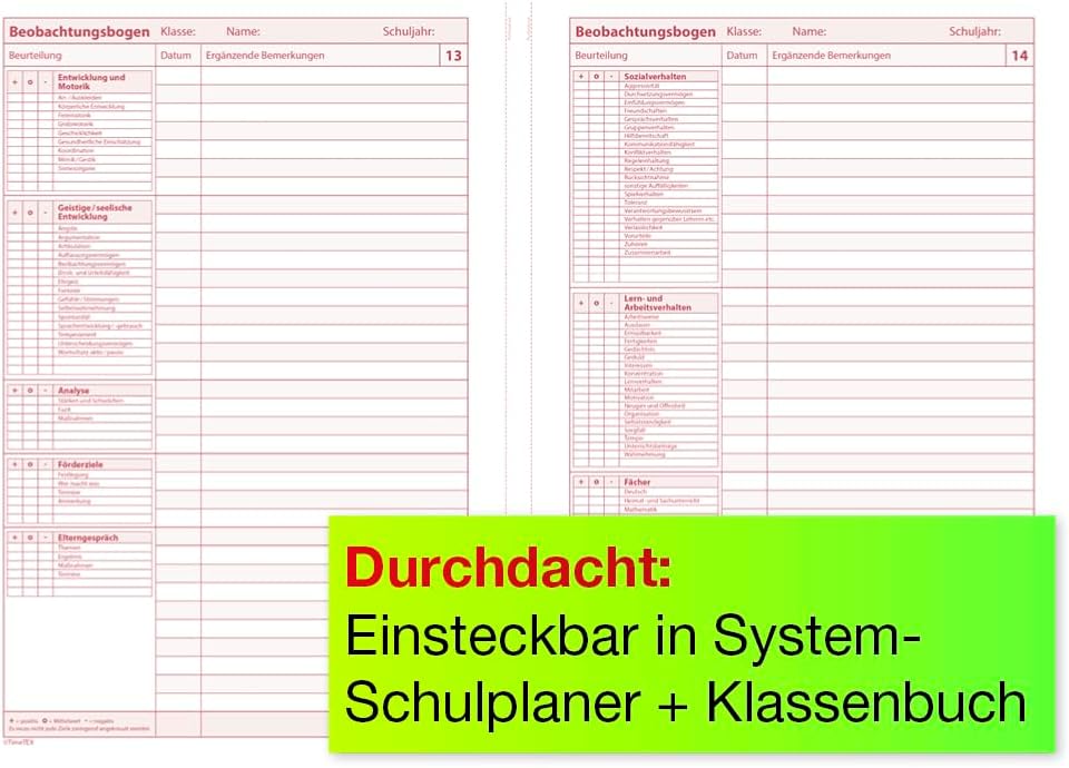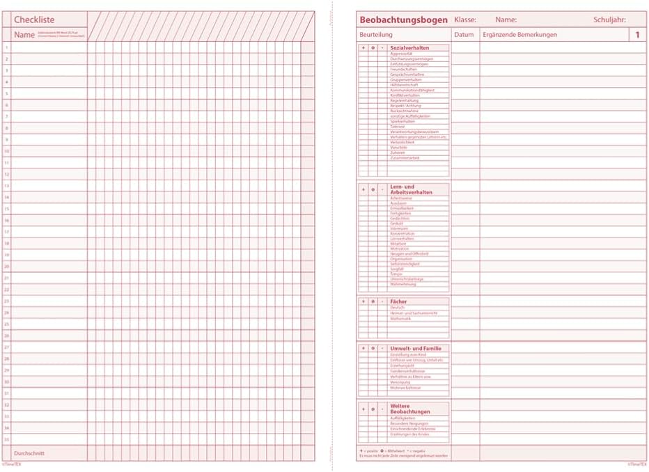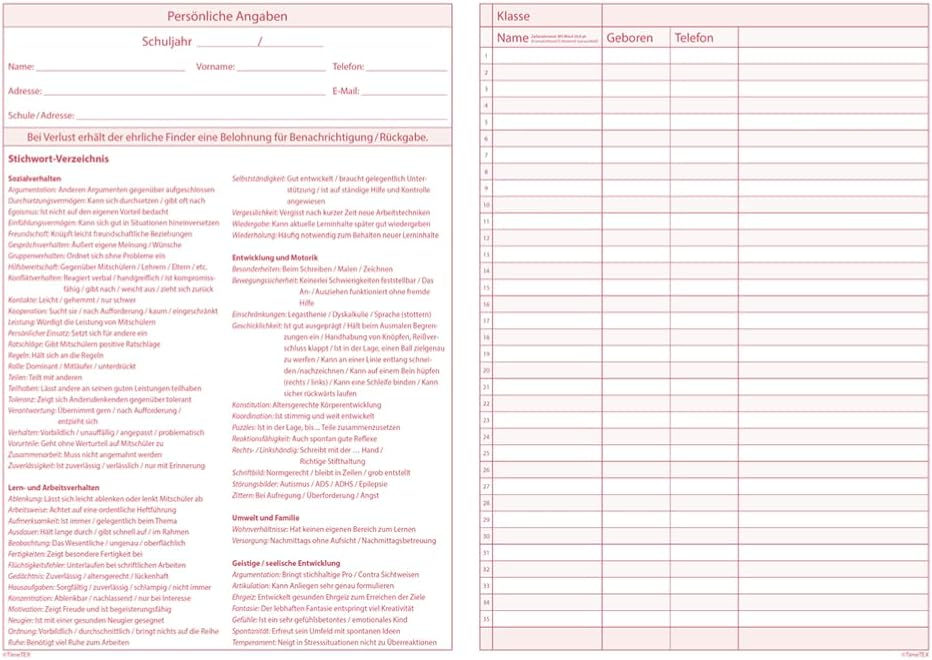 Quaderno A4: funge da supporto organizzativo completo che fornisce spazio per elenchi di studenti, lista di controllo dello stato effettivo, una rubrica per l'analisi e il piano di promozione, una sezione per le conversazioni dei genitori e commenti come il comportamento sociale. Promuovere mirato: ideale per creare un piano di finanziamento previa analisi dello stato reale (ad esempio negli ambiti del comportamento sociale, ecc.). Per indirizzare il potenziale dei tuoi studenti e alleviare gli obblighi di documentazione. Combinato: il quaderno può essere perfettamente combinato con l'agenda scolastica o il libro di classe grazie ad un pratico angolo. Anche gli altri nostri quaderni sul rendimento degli studenti, sulla frequenza o sui voti scolastici aiutano gli insegnanti a tenere traccia della loro vita scolastica. Qualità made in Germany: la produzione dei nostri quaderni organizzativi TimeTEX avviene direttamente in Germania. Ciò ci consente di evitare lunghe distanze di trasporto e quindi di ridurre la nostra impronta di carbonio a lungo termine. Chi siamo: TimeTEX è un'azienda a conduzione familiare in Germania. Il nostro motto aziendale è “non parlare ma agisci”, per questo siamo fortemente impegnati a favore dell'ambiente e dell'integrazione. Questa attenzione per l'uomo e l'ambiente si riflette anche nella qualità dei nostri prodotti.