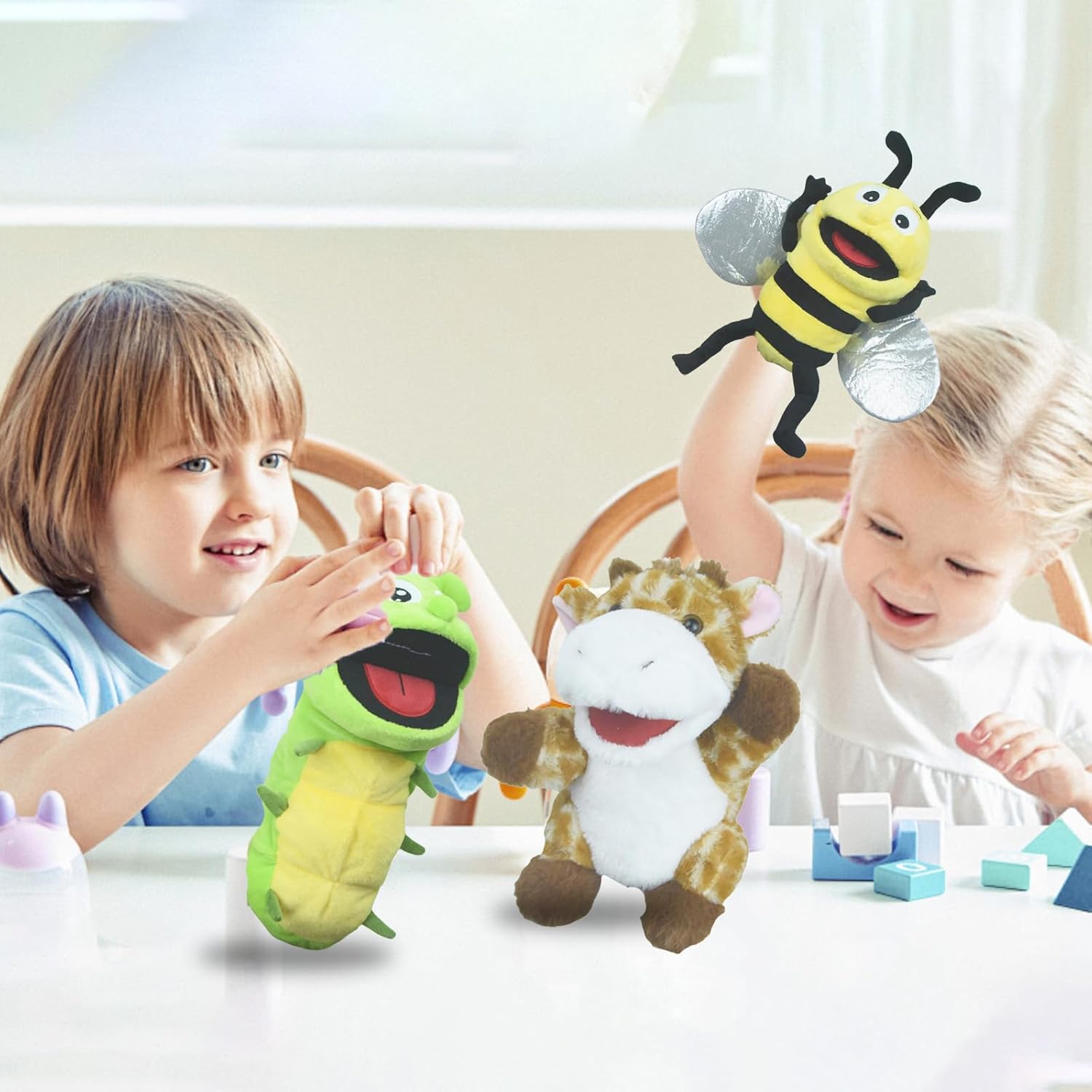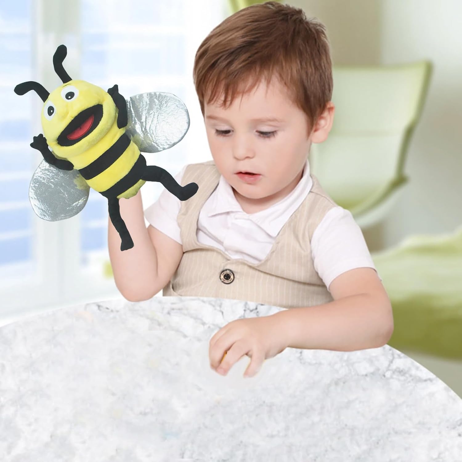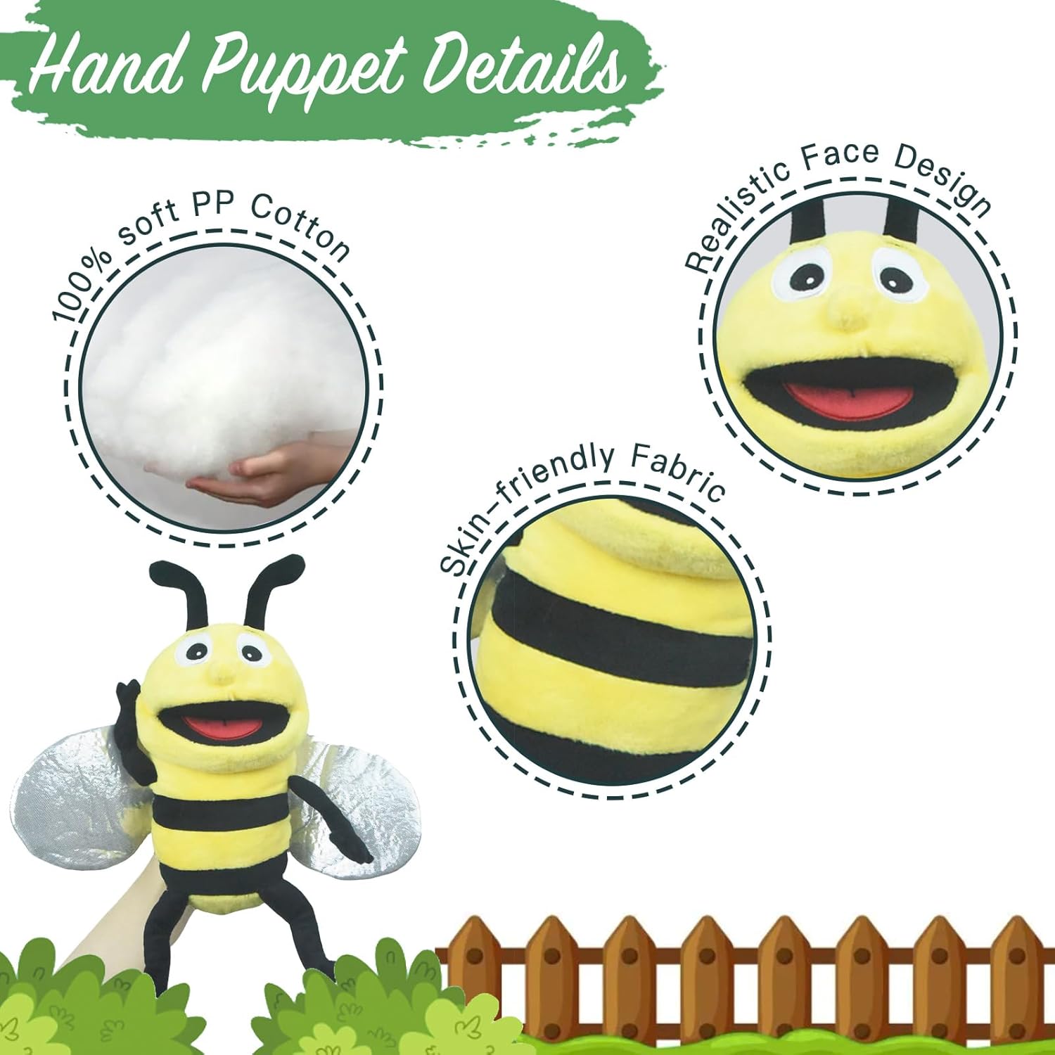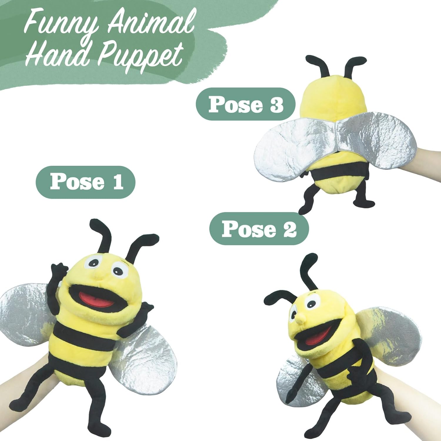 Caratteristiche del prodotto: Ha una fodera morbida e cuciture sottili, con spazio sufficiente per le dita per controllare comodamente i movimenti della bambola; può essere comodamente indossato da mani da bambini ad adulti sia sulla mano sinistra che su quella destra; Pacchetto peluche animale ape Lunghezza*Larghezza*Altezza: 23*15*11cm.dispiegato Lunghezza*Larghezza*Altezza:36*36*11cm. Materiali sicuri e di alta qualità: queste bambole sono realizzate in tessuto lavabile e sicuro per i bambini e possono sopportare infiniti periodi di gioco. Le bocche mobili aggiungono un tocco di realismo e rendono l'esperienza di gioco della bambola ancora più accattivante. Per preservare la morbidezza della bambola, lavarla in acqua fredda e lasciarla asciugare all'aria. Sviluppano abilità colorate: questi pupazzi non sono solo divertenti, ma anche educativi. Stimolano la creatività, la comunicazione e le capacità motorie dei bambini che manipolano le bocche dei pupazzi e inventano storie emozionanti. Un regalo perfetto per bambini di tutte le età: per un compleanno o per le vacanze, queste marionette animali sono una scelta fantastica. Dimensioni per bambini e adulti: queste marionette sono così grandi da essere adatte sia ai bambini che agli adulti, e tutti possono partecipare. Create un teatro di burattini per tutta la famiglia e divertitevi insieme. Multiuso: questi pupazzi sono ideali per stimolare l'immaginazione, per spettacoli di burattini, scene di burattini, in classe o in chiesa, e per sviluppare le capacità motorie, la coordinazione occhio-mano, le capacità di comunicazione, la fiducia in se stessi e i legami socio-emotivi.