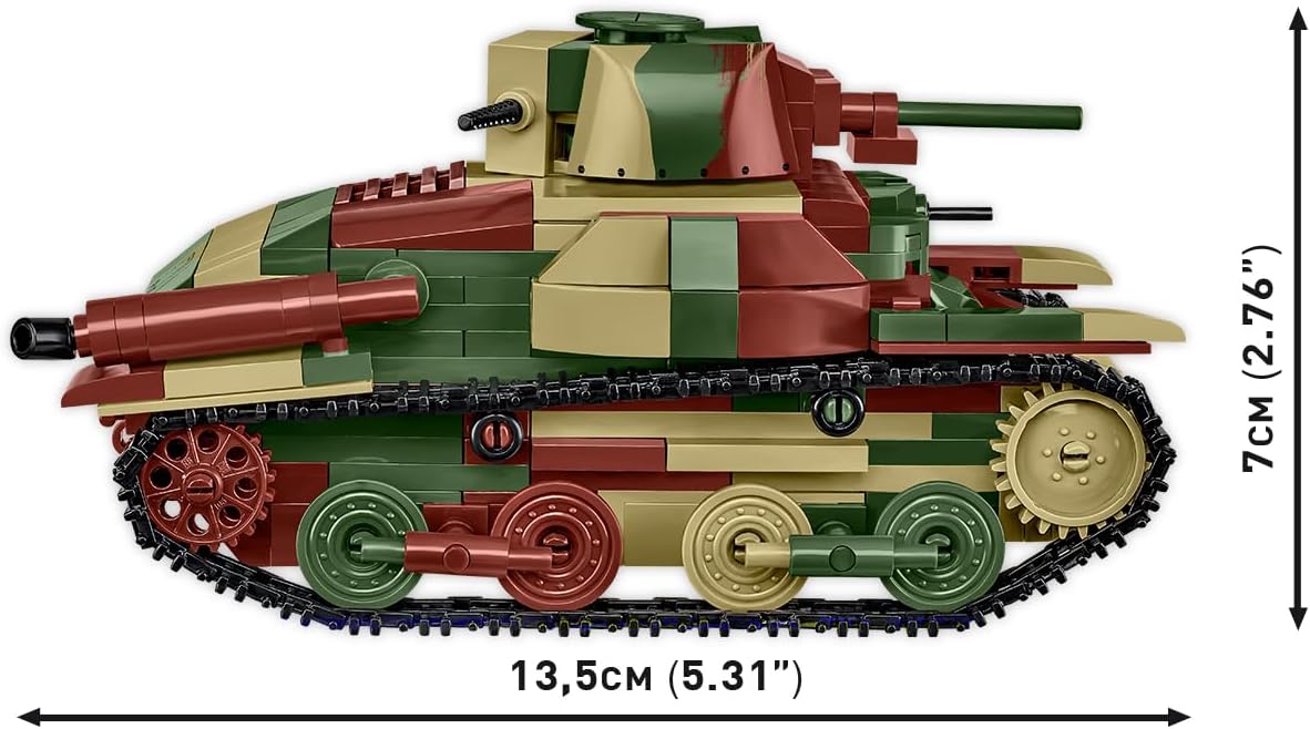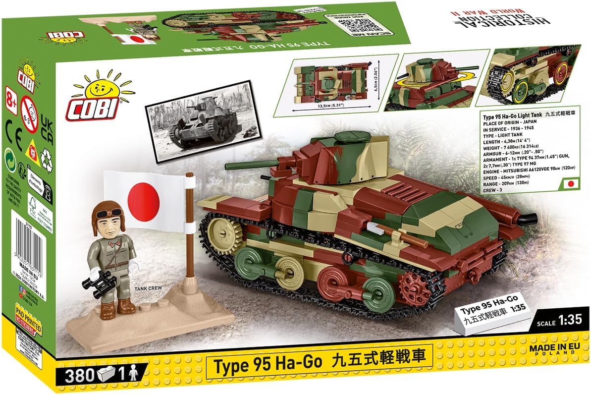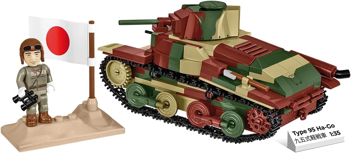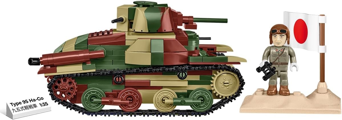 380 elementi di alta qualità Dimensioni del modello assemblato in scala 1:35 (L x A): 13,5 cm x 7 cm Il set di modelli di carro armato leggero comprende una statuetta giapponese ed è completato da un blocco con un frammento di terreno e bandiera giapponese per la visualizzazione Istruzioni chiare e intuitive basate su illustrazioni e istruzioni passo passo Completamente compatibile con altre marche di blocchi di costruzione
