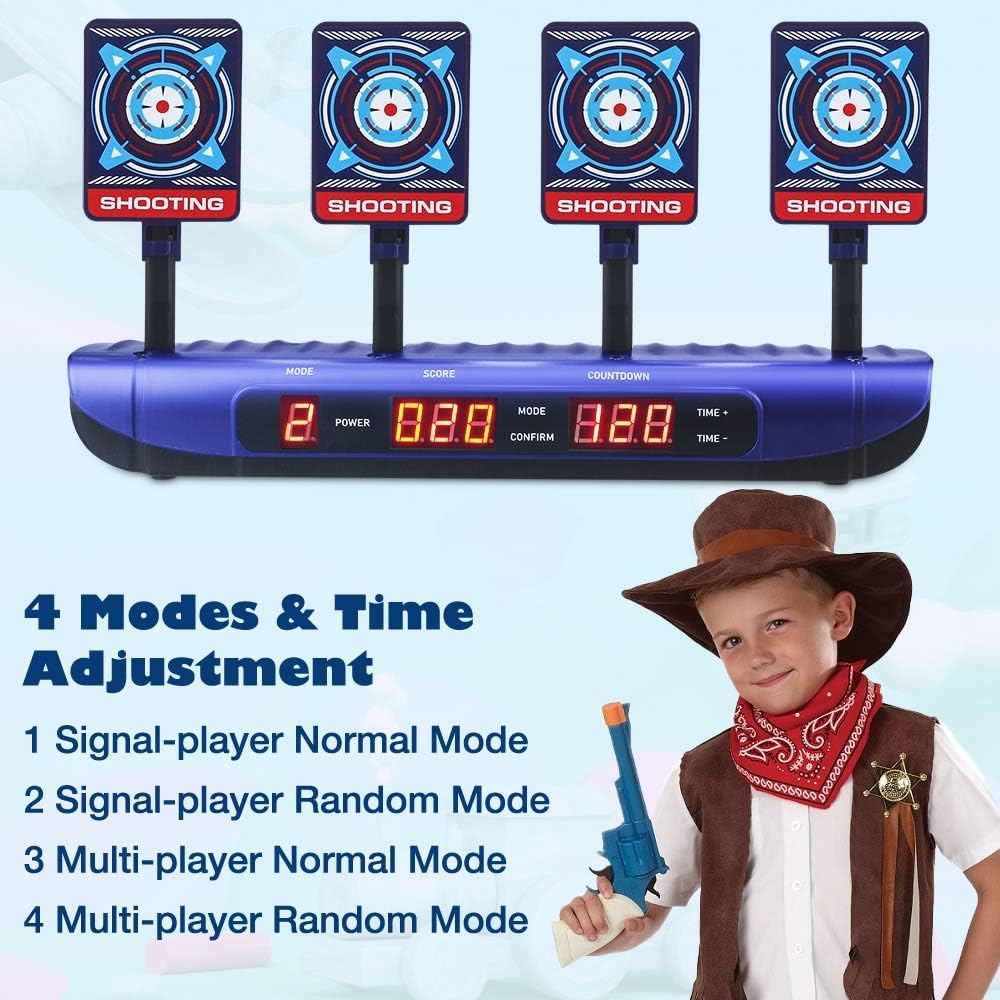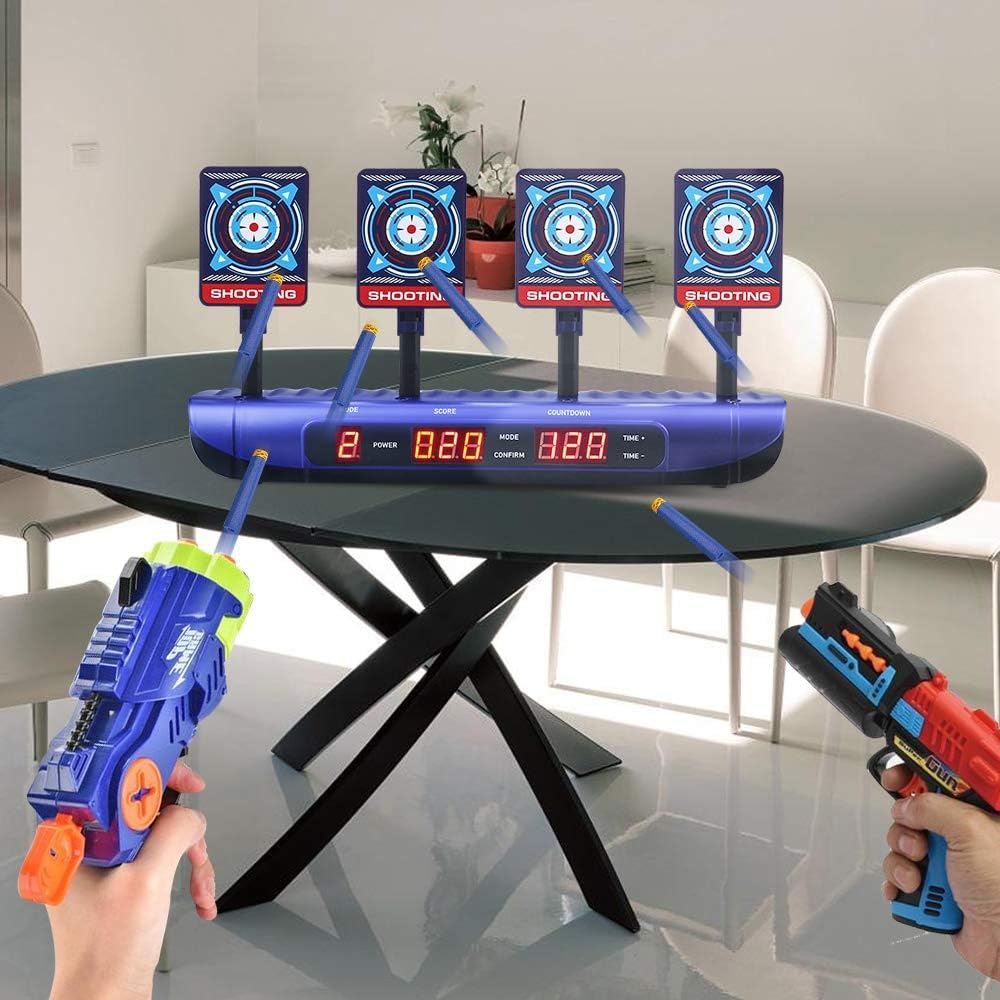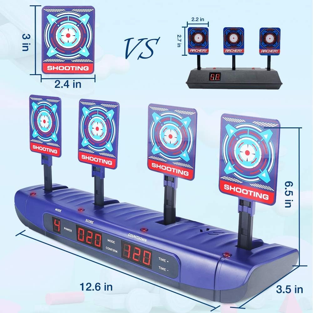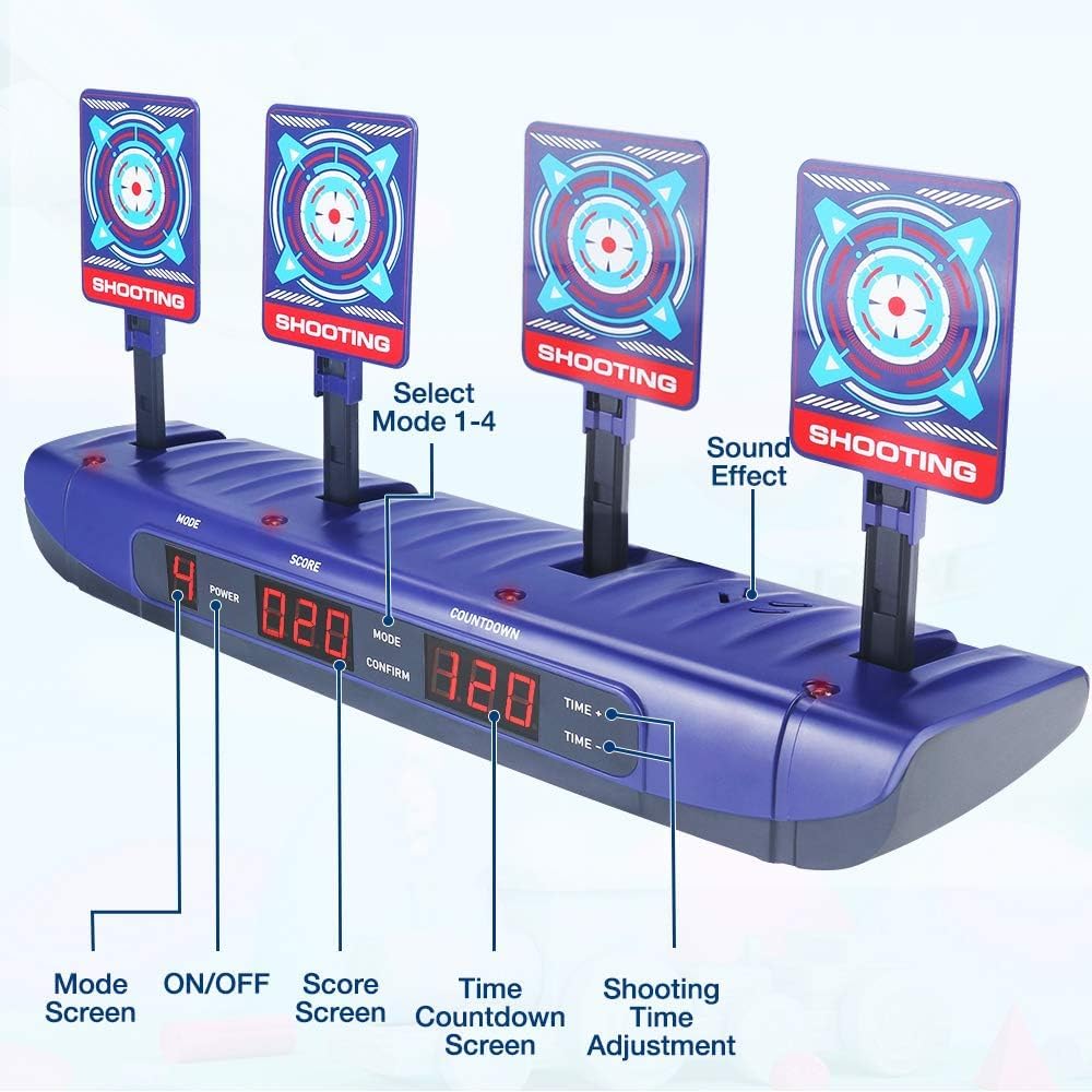 【Aggiorna il bersaglio di tiro nel 2021】 bersaglio elettrico è adatto per le pistole Nerf N-strike Elite, Nerf Mega e Nerf Rival Series e Blaster di altre marche. Molto più ricco di funzioni e di gioco rispetto ad altri bersagli a funzione monotona. Deve essere alimentato da 3 batterie "AA" (non incluse). 【4 modalità e design di regolazione del tempo】dotato di 4 schermi di grandi dimensioni e 3 schermi LCD per visualizzare la modalità di gioco, i punteggi e il conto alla rovescia del tempo.È dotato di 4 modalità di sfida e funzione di regolazione del tempo. 【Sistema di destinazione a ripristino automatico】 Quando tutti e 4 i bersagli devono essere spinti verso il basso, il motore del dispositivo inizia a funzionare ei 4 bersagli si solleveranno automaticamente in successione dopo 3 secondi. 【Effetti sonori realistici】bersagli rispondono a ogni colpo e i suoni sono esilaranti. L'obiettivo è buono per la pratica quotidiana del bersaglio personale e giocato contro i giocatori per vedere chi segna di più. I bambini si alterneranno per competere per un punteggio elevato. Anche gli adulti vorranno divertirsi, fornendo la sensazione di combattimento 【Regalo di compleanno e di Natale per bambini】 Questo tiro a segno è la scelta migliore come regalo di Natale o di compleanno per ragazzi di 5-16 anni.
