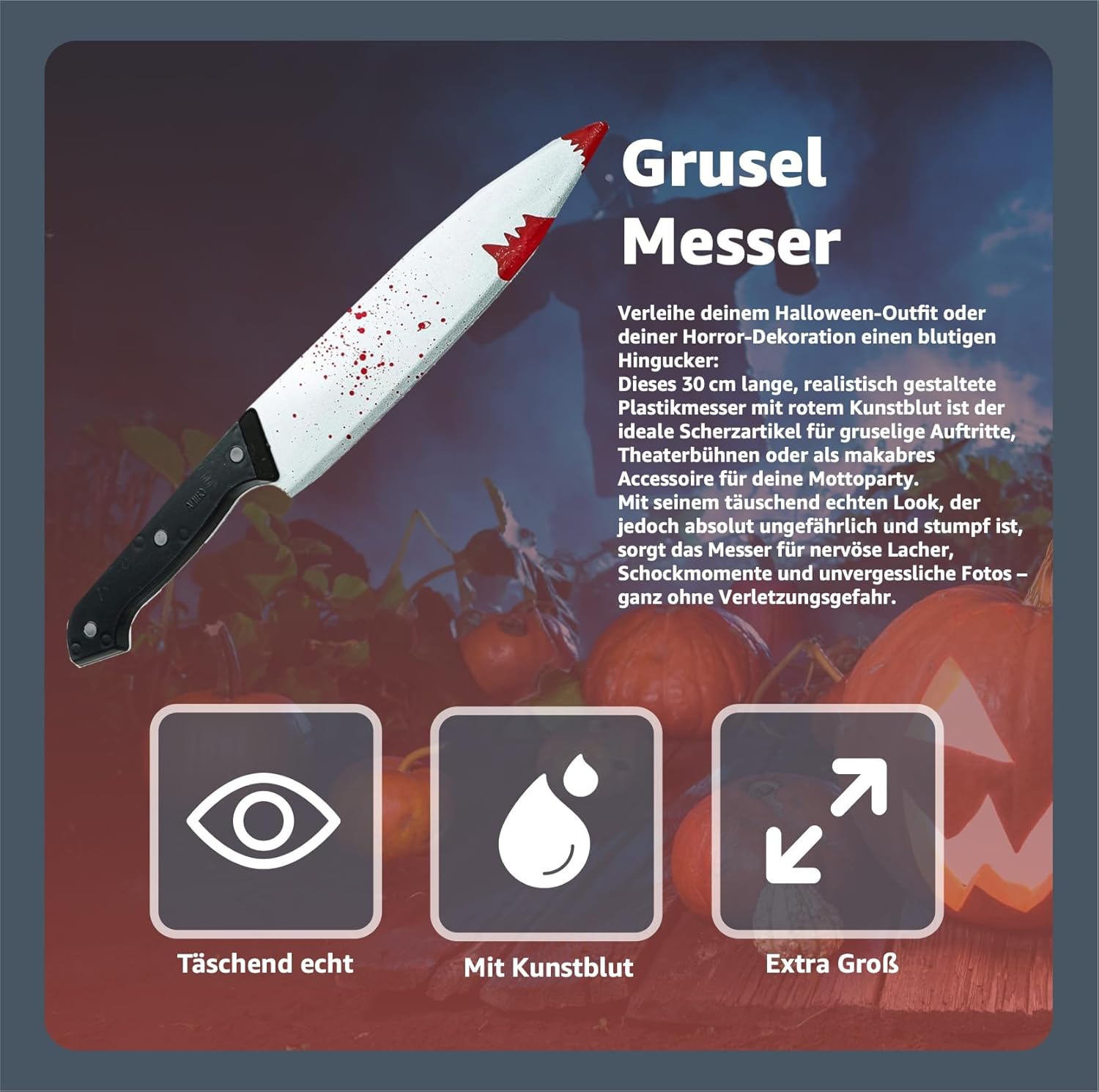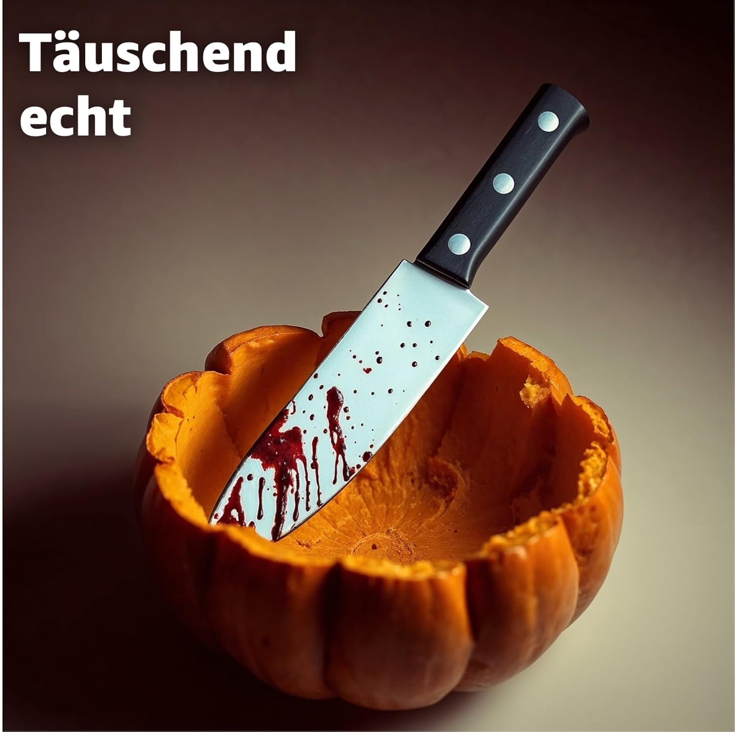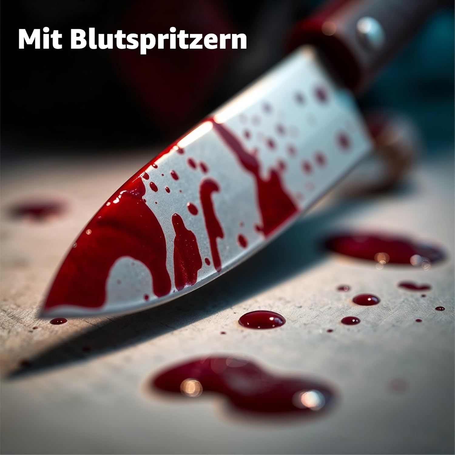 Vero coltello decorativo con effetto sangue, effetto realistico con lama argentata, manico nero e dettagli rosso sangue per il massimo fattore spaventoso Accessorio perfetto per Halloween, carnevale e costumi horror, ideale per abiti da assassino, zombie, clown o slasher Dimensioni: circa 34 cm. Abbastanza grande per costumi accattivanti, abbastanza leggero per indossarlo comodamente Effetto sangue fedele al dettaglio: la lama colorata rossa garantisce un effetto shock spaventoso alle feste e alle foto Materiale plastico leggero e sicuro: nessun bordo tagliente, ideale per ragazzi e adulti Versatile: adatto anche per teatro, cosplay, set cinematografici, sale da pranzo o escape room Combinabile con maschere, sangue artificiale e trucco horror, per un perfetto momento di shock alla prossima apparizione