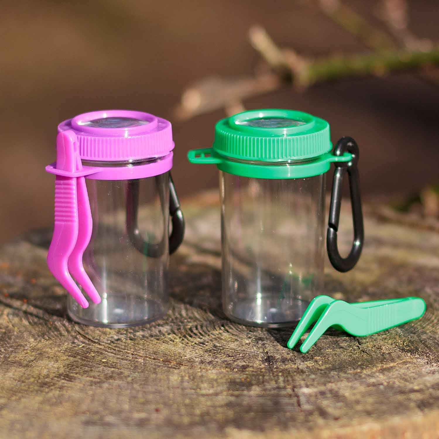 Visore viola o verde. Clip da cintura per un facile trasporto. Fori di ventilazione per respirare. Lente d'ingrandimento nella parte superiore per osservare da vicino gli insetti. Lati in plastica trasparente per una migliore ispezione degli insetti.