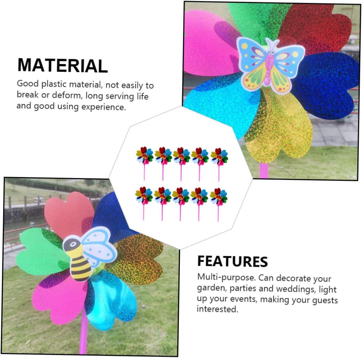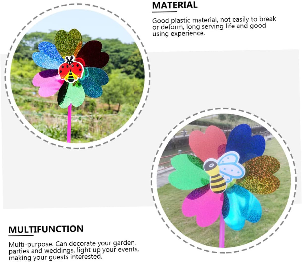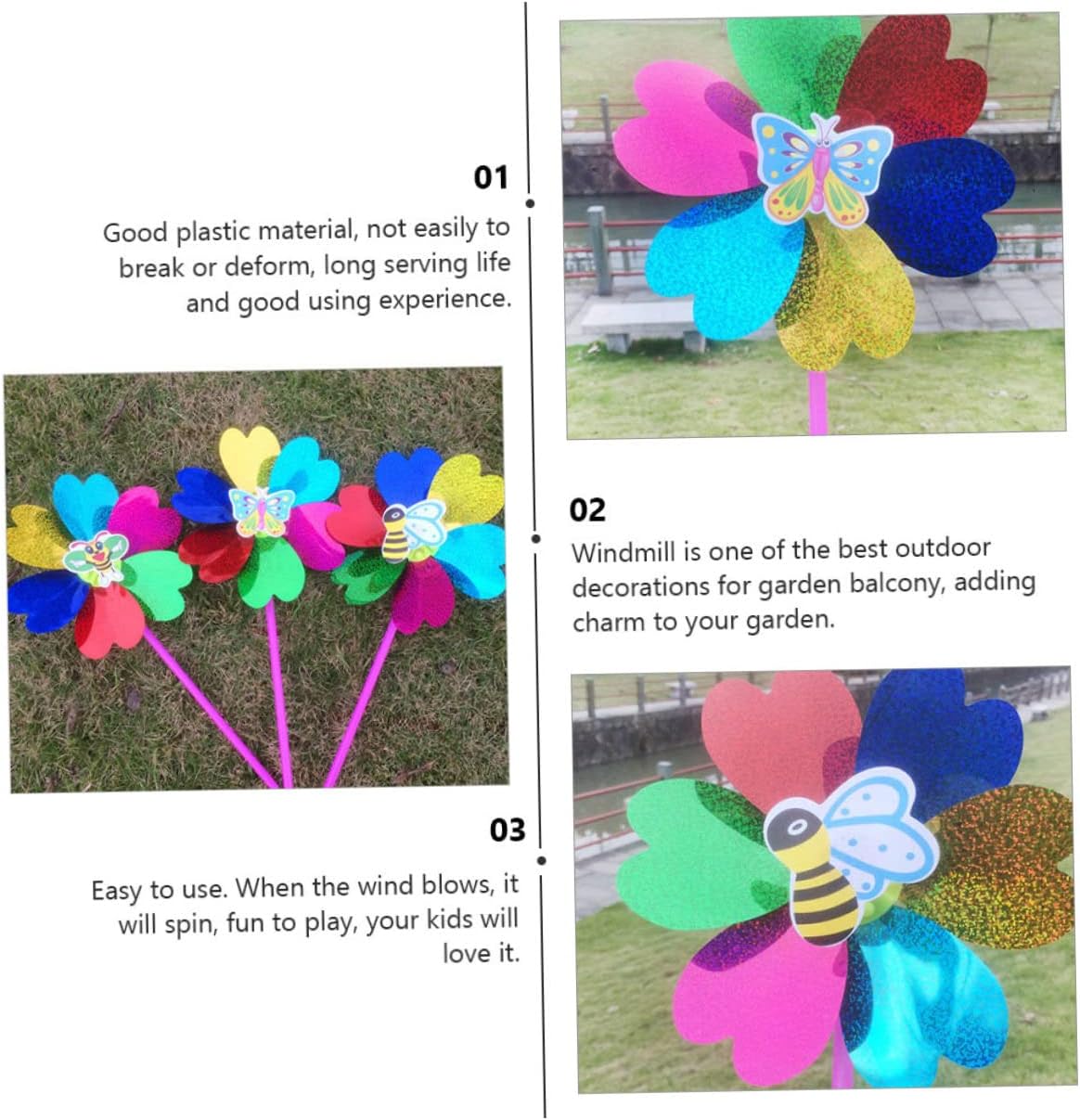 Mulino a vento colorato: realizzato in materiale plastico di alta qualità e con una lavorazione raffinata per un utilizzo duraturo, mulini a vento multicolori Mulino a vento da giardino: questo splendido e affascinante mulino a vento farà sì che tutti gli occhi siano puntati sul tuo giardino, cortile e balcone, mulino a vento Colorato mulino a vento rotante, curato in ogni dettaglio per conferirgli un aspetto attraente e accattivante, decorazione da giardino con mulino a vento Decorazione a forma di mulino a vento: può essere un oggetto decorativo per le feste, produzione squisita e texture realistiche, atmosfera molto festosa, mulini a vento da giardino Mulini a vento colorati: buon materiale plastico, non si rompono o si deformano facilmente, e buona esperienza d'uso, mulini a vento