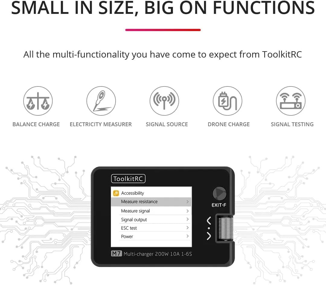 M7 è un prodotto multifunzionale della catena degli attrezzi che integra funzioni come un caricatore e uno scaricatore bilanciati, un display elettrico, un dispositivo di misurazione del segnale e una sorgente di segnale. Può caricare e scaricare e bilanciare. Gestione di batterie LiPo, LiHV, LiFe Lion 1-6S, NiMh 1-16S, PB 1-10S. Corrente di carica: max 10 A @ MAX200 W Può misurare la tensione della batteria, la resistenza interna della batteria, la gestione del bilanciamento della batteria al litio. Può misurare il valore del segnale di PWM/PPM/SBUS, con una precisione di 1 microsecondo. Può emettere segnali standard PWM/PPM/SBUS con una precisione di 1 microsecondo Corrente costante e uscita sorgente di tensione costante, tensione costante personalizzabile 1-28V, corrente costante 1-10A Può essere adattato alle batterie dei droni tradizionali, attivato automaticamente e caricato