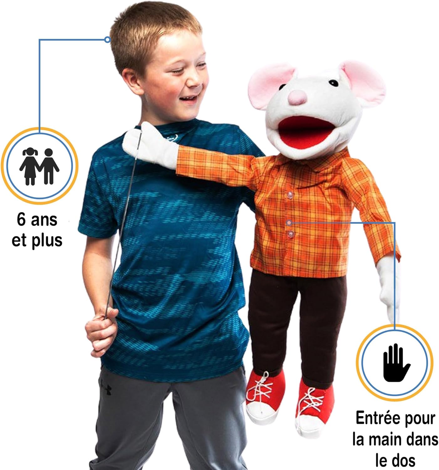Burattino ventriloquo a figura intera di alta qualità realizzato da Silly Puppets. Bocca facile da muovere. Ingresso manuale dal retro del burattino. Include 1 asta di controllo del braccio che può essere agganciata a entrambe le mani per il movimento. Altezza: circa 65 cm. Peso leggero: ca. 500 g. La maglietta di questo pupazzo è rimovibile e può essere cambiata. (Taglia 18 mesi)