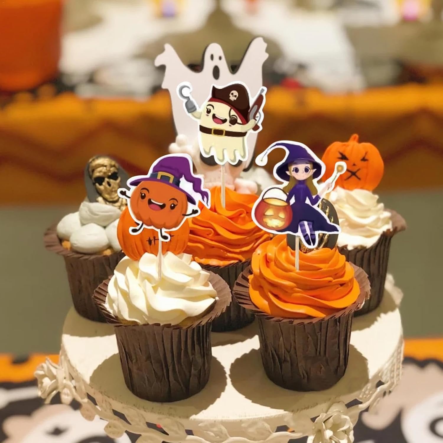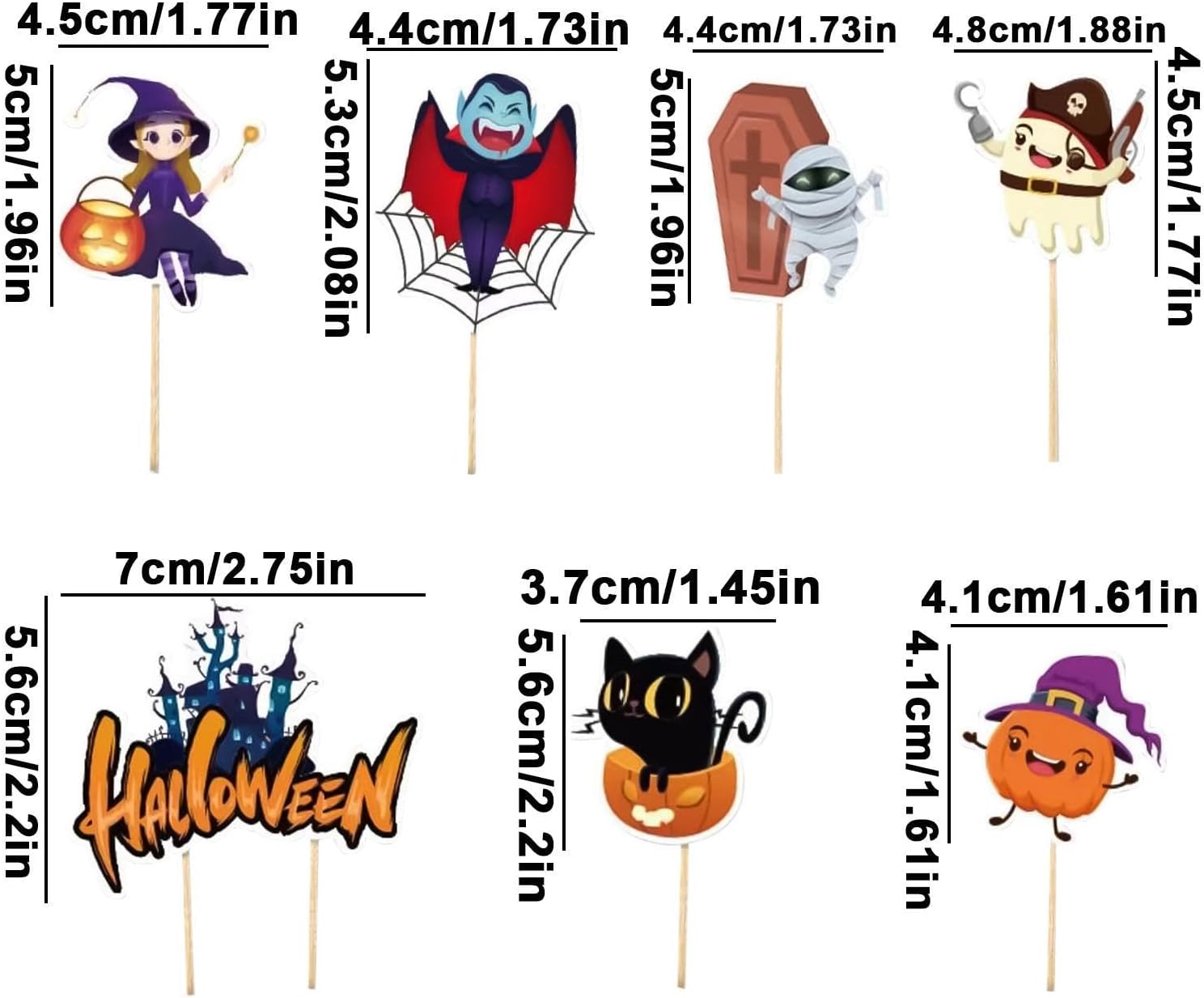 Elementi a tema Halloween: questi toppers molto carini e interessanti presentano molteplici elementi a tema Halloween come vampiro e , che aggiungono più divertimento alla festa. Non facilmente deformabili: con i nostri toppers cupcake di Halloween, i tuoi dessert non sembreranno mai noiosi. Realizzati in cartone resistente e robusti stuzzicadenti, i nostri toppers promettono una buona decorazione per i tuoi dolcetti di Halloween. Facile da montare: trasforma facilmente cupcake semplici in dolcetti spettrali senza il fastidio della glassa tradizionale con questi toppers per cupcake di Halloween. Basta attaccare lo stuzzicadenti al cartone e posizionarlo sulla torta. Aggiunta di dolcetti squisiti: aggiungi un tocco di decadenza ai tuoi dolcetti con i nostri toppers per cupcake di Halloween. Questi toppers sono perfetti per biscotti, dessert e. Portano il tuo gioco di dessert a un livello superiore e rendono ogni boccone ancora più soddisfacente. Ampia gamma di usi: ravviva l'atmosfera della tua festa di Halloween con i nostri spettrali toppers per cupcake. Stupisci i tuoi ospiti con questi disegni spettrali ma adorabili, ideali per regali per neonati e decorazioni di compleanno per bambini