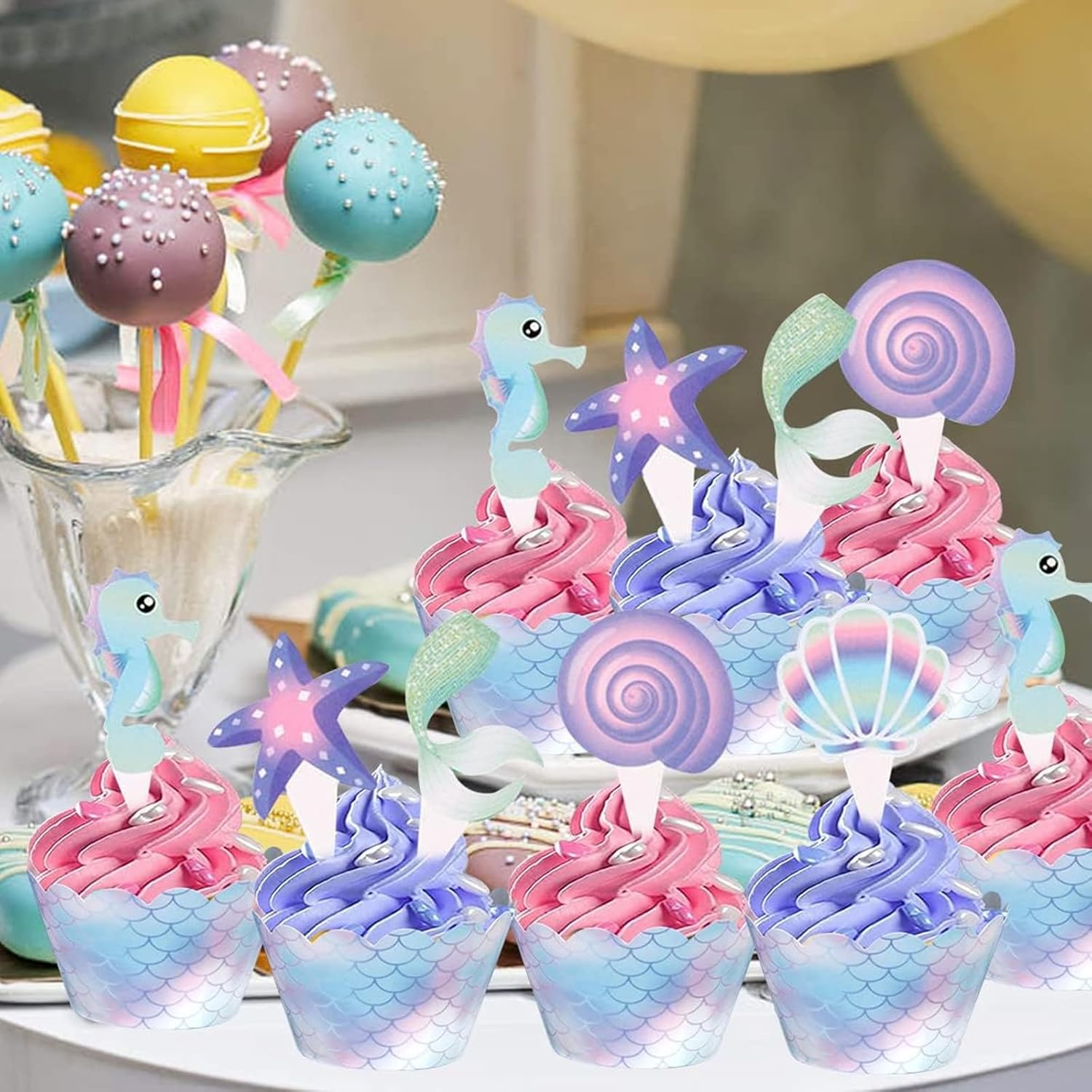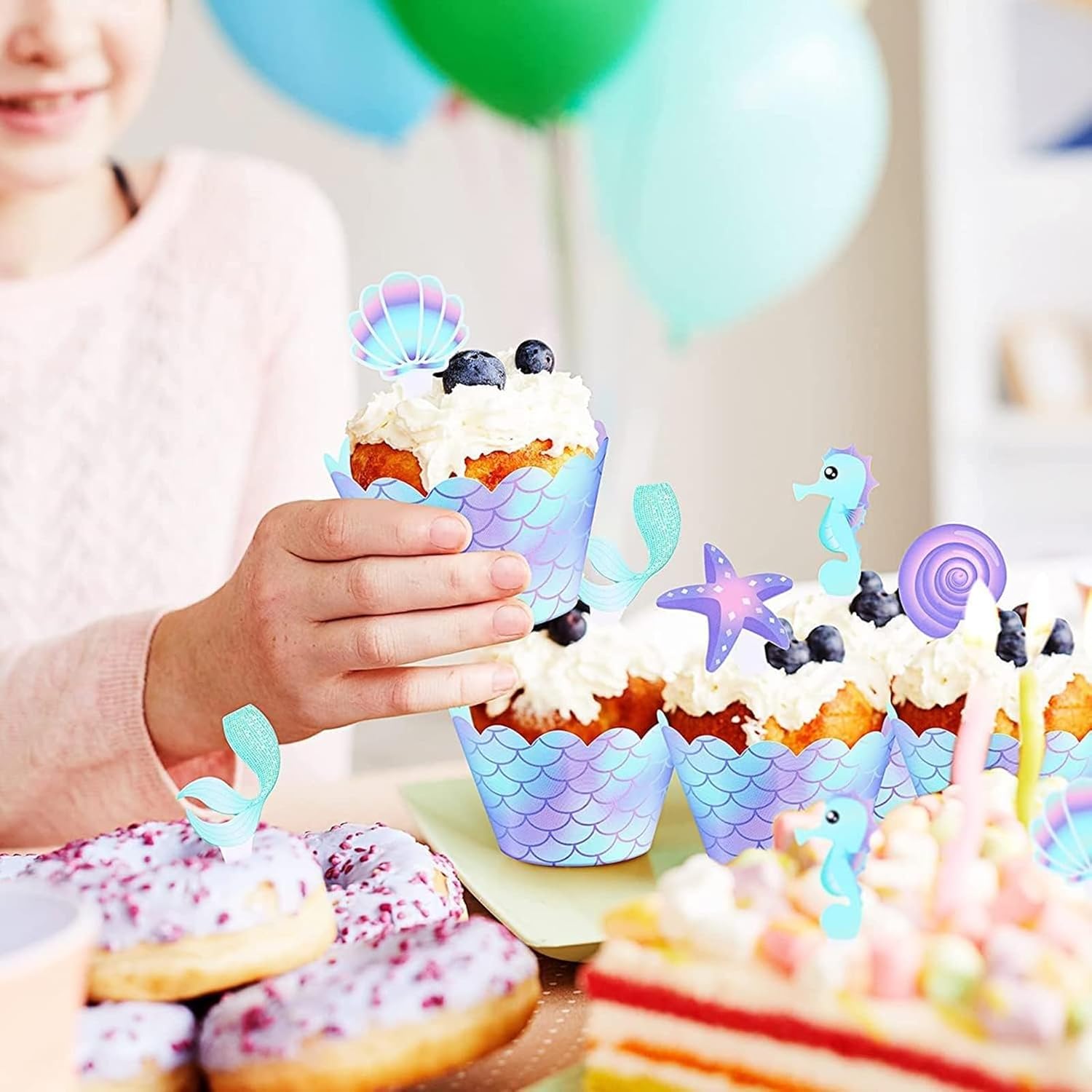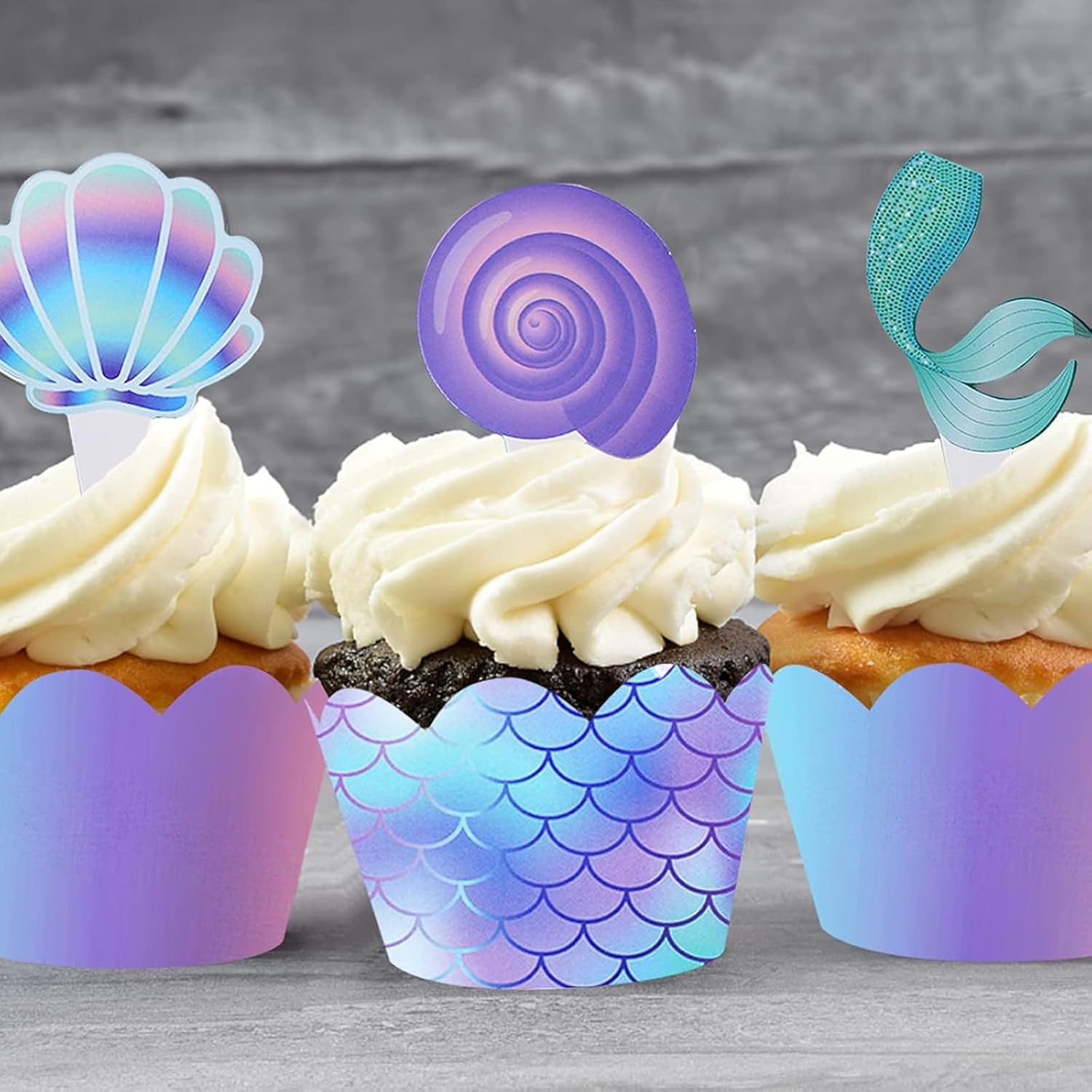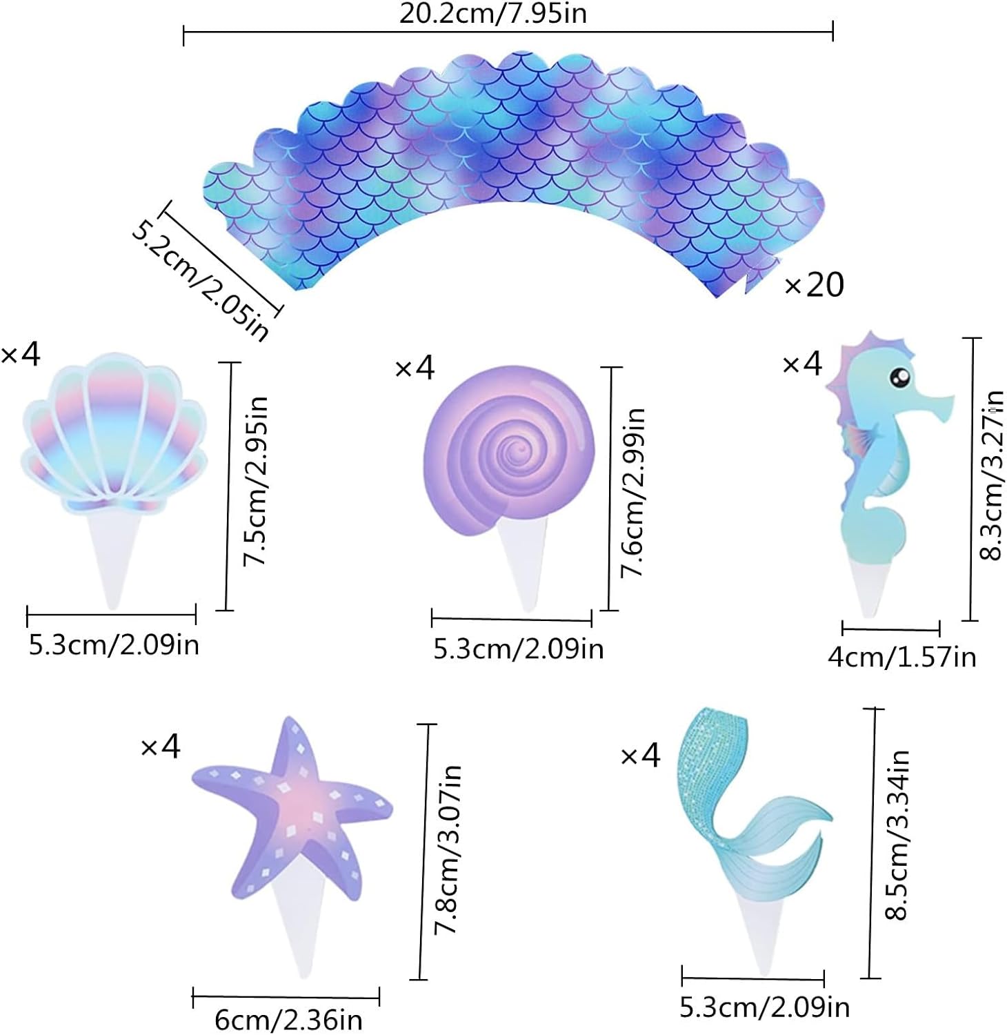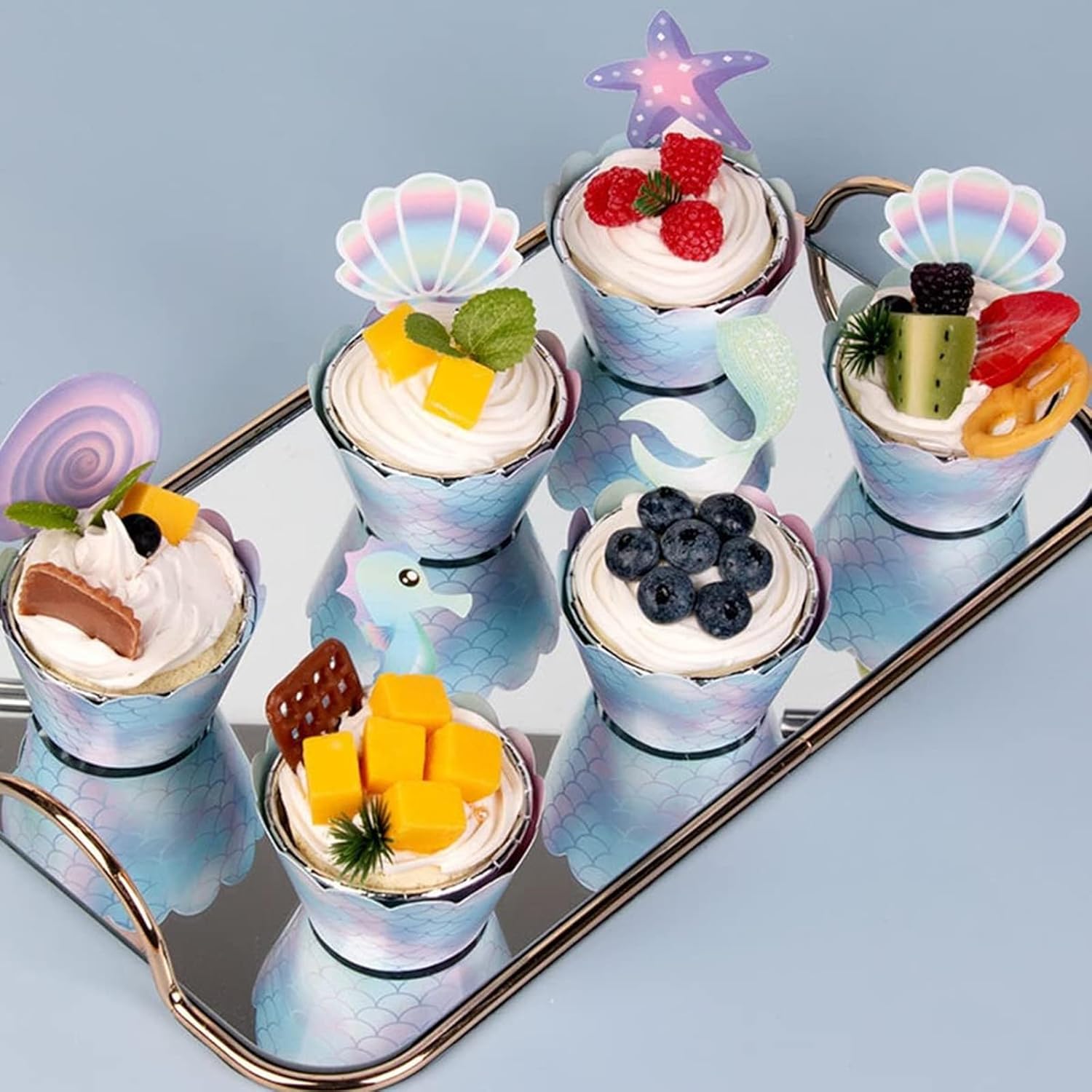 【Articolo della confezione】 Incantevoli teglie da forno per cupcake a tema sirena, insieme a 20 involucri per cupcake a sirenetta e 20 toppers per cupcake, composti da 4 code di sirena, 4 cavallucci marini, 4 conchiglie, 4 stelle marine e altre 4 conchiglie. 40 pezzi in totale. 【Qualità Premium】 Queste decorazioni per torte a sirena sono realizzate con carta di alta qualità. Il colore è sicuro, luminoso e vibrante. Facile da montare: basta avvolgere l'involucro attorno alla base del cupcake, fissare la linguetta e aggiungere i graziosi toppers. È un processo semplice che crea decorazioni attraenti che cattureranno l'attenzione dei tuoi ospiti. 【Toppers fai da te】 Crea una sirenetta carina e lucente o una torta del mondo del mare. Lascia che i bambini si godano la magia con le colorate borse e stole per feste sull'oceano. Questo renderà la tua festa più divertente. 【Occasioni adatte】 Adatto a vari eventi come baby shower, compleanni, feste sull'oceano, matrimoni. La superficie scintillante brilla e rende bellissima la tua festa.