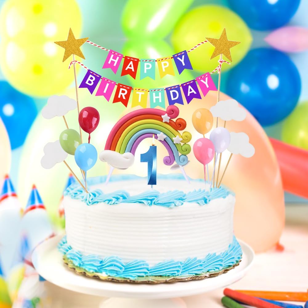 Topper per torta del primo compleanno - Striscione di buon compleanno - Candela blu numero 1 - Set di decorazioni di compleanno con nuvole arcobaleno colorate,
