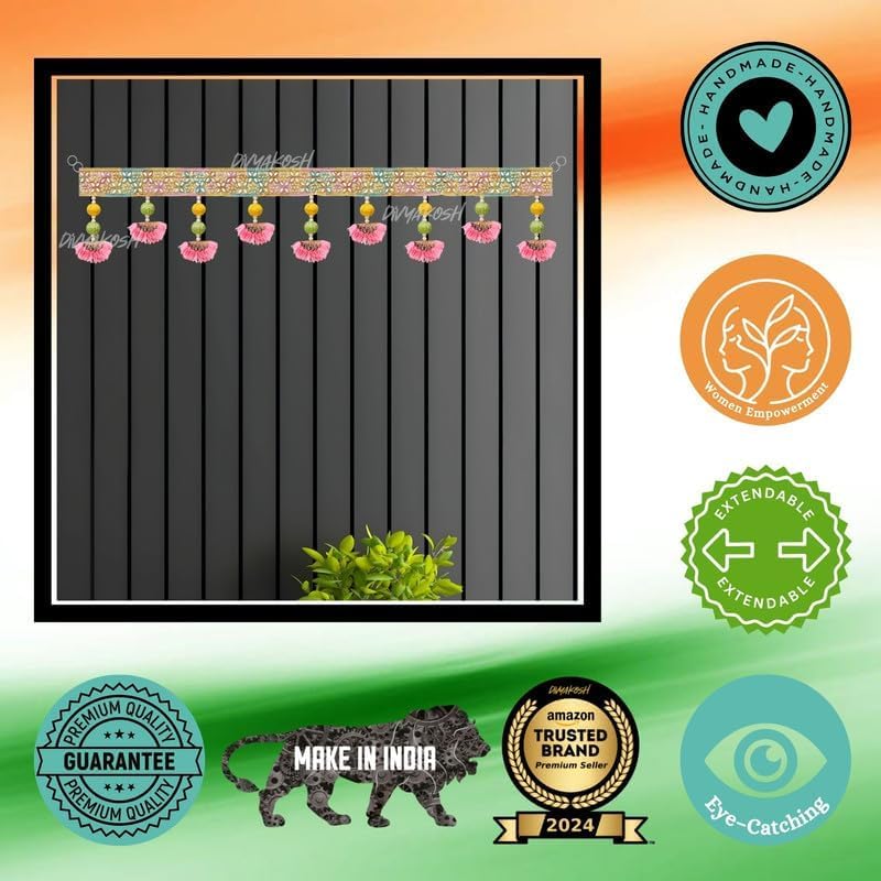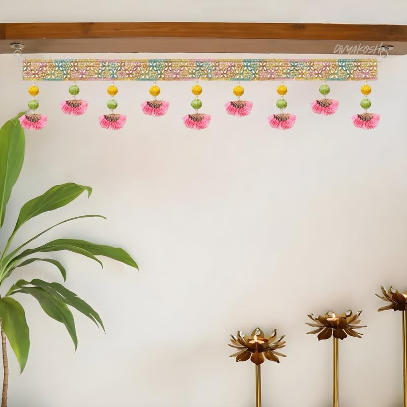 Dimensioni: 94 cm di larghezza tradizionale da appendere alla porta con intricati motivi di loto e dettagli ornati, perfetto per la decorazione della porta Artigianato: realizzato a mano con sofisticato design in pizzo dorato, motivi smerlati e medaglioni decorativi in stile tradizionale indiano Dettagli eleganti: ornato con delicate perline simili a perle e nappe trasparenti sotto ogni medaglione per un movimento aggraziato Combinazione armoniosa di rosa, giallo e bianco con accenti dorati che creano un display vivace e artistico Set completo: include ornamenti da appendere coordinati con motivi floreali ed elementi decorativi per una disposizione completa tradizionale della porta