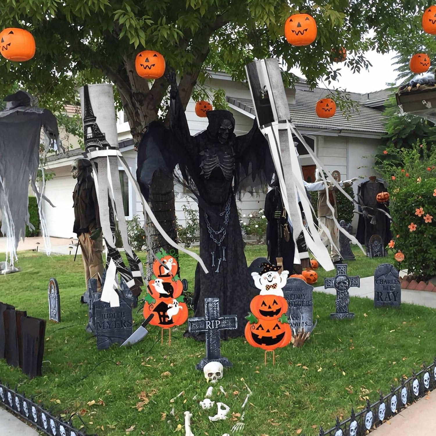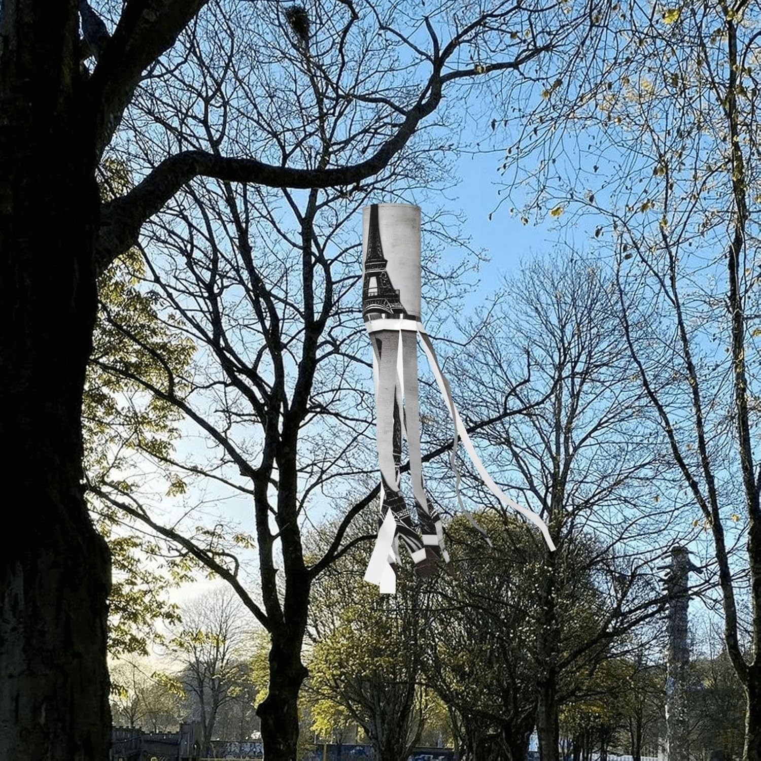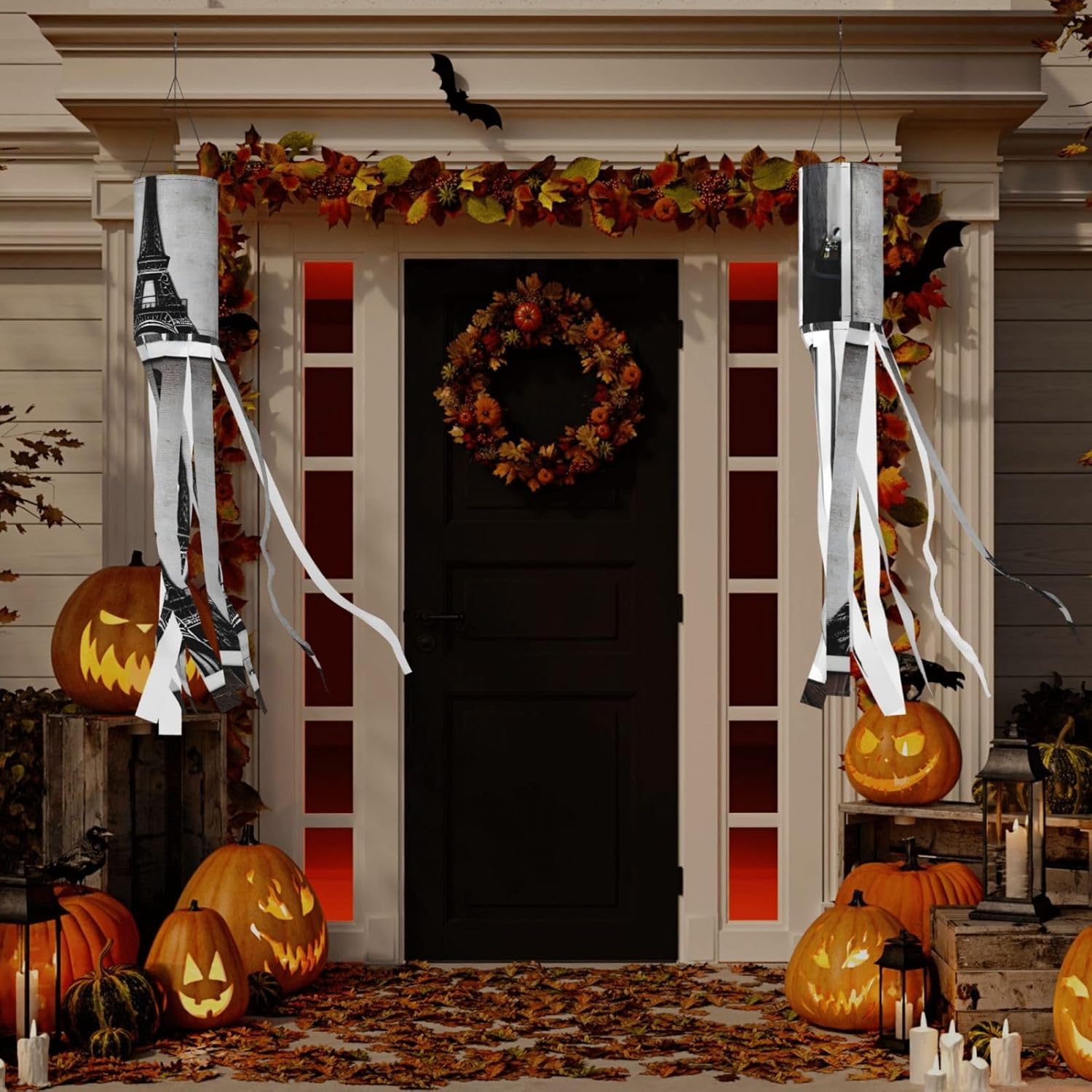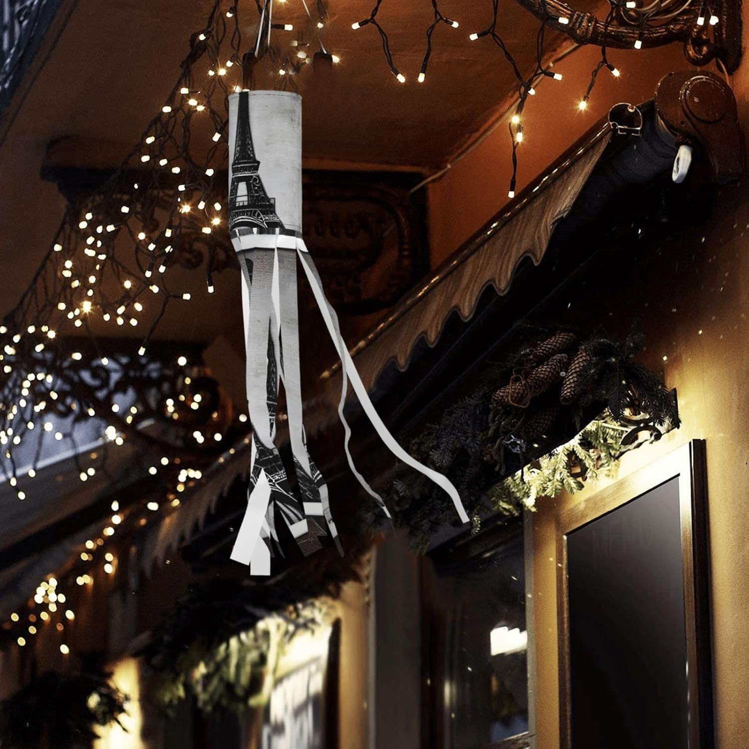 Torre Eiffel del caffè parigino deliziosa illuminazione esterna per le vacanze: calze a vento da strega di Halloween per esposizione stagionale mozzafiato