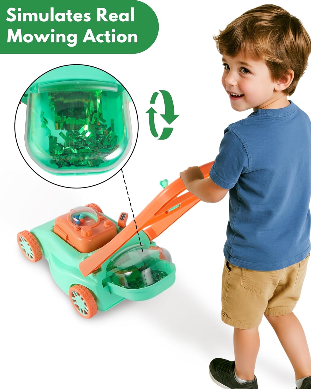 Push and Go: funziona con una semplice spinta della mano, garantendo un movimento fluido su prati o aree pavimentate senza cavi o pesi. Progettato per le mani dei più piccoli: impugnatura compatta e design leggero progettati per una facile maneggevolezza da parte dei giovani utenti in giardino. Costruzione sicura: priva di parti taglienti o componenti pesanti, uno strumento da giardino ideale per le attività supervisionate dai bambini. Nessuna manutenzione richiesta: non contiene componenti elettronici mobili o parti rimovibili, il che lo rende facile da riporre e utilizzare all'aperto. Un accessorio pratico per l'esplorazione del giardino: perfetto per ruoli fantasiosi all'aperto come la manutenzione del giardino, mentre si integra nelle routine di giardinaggio degli adulti.