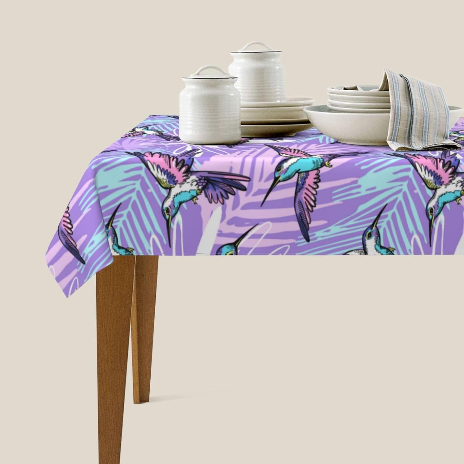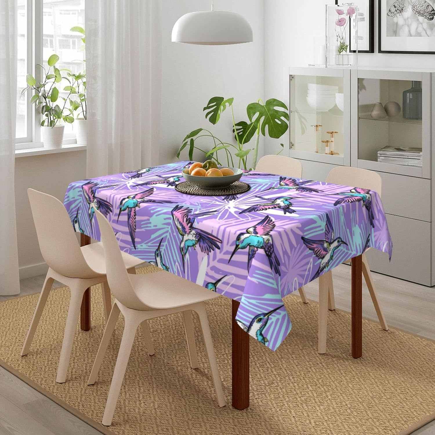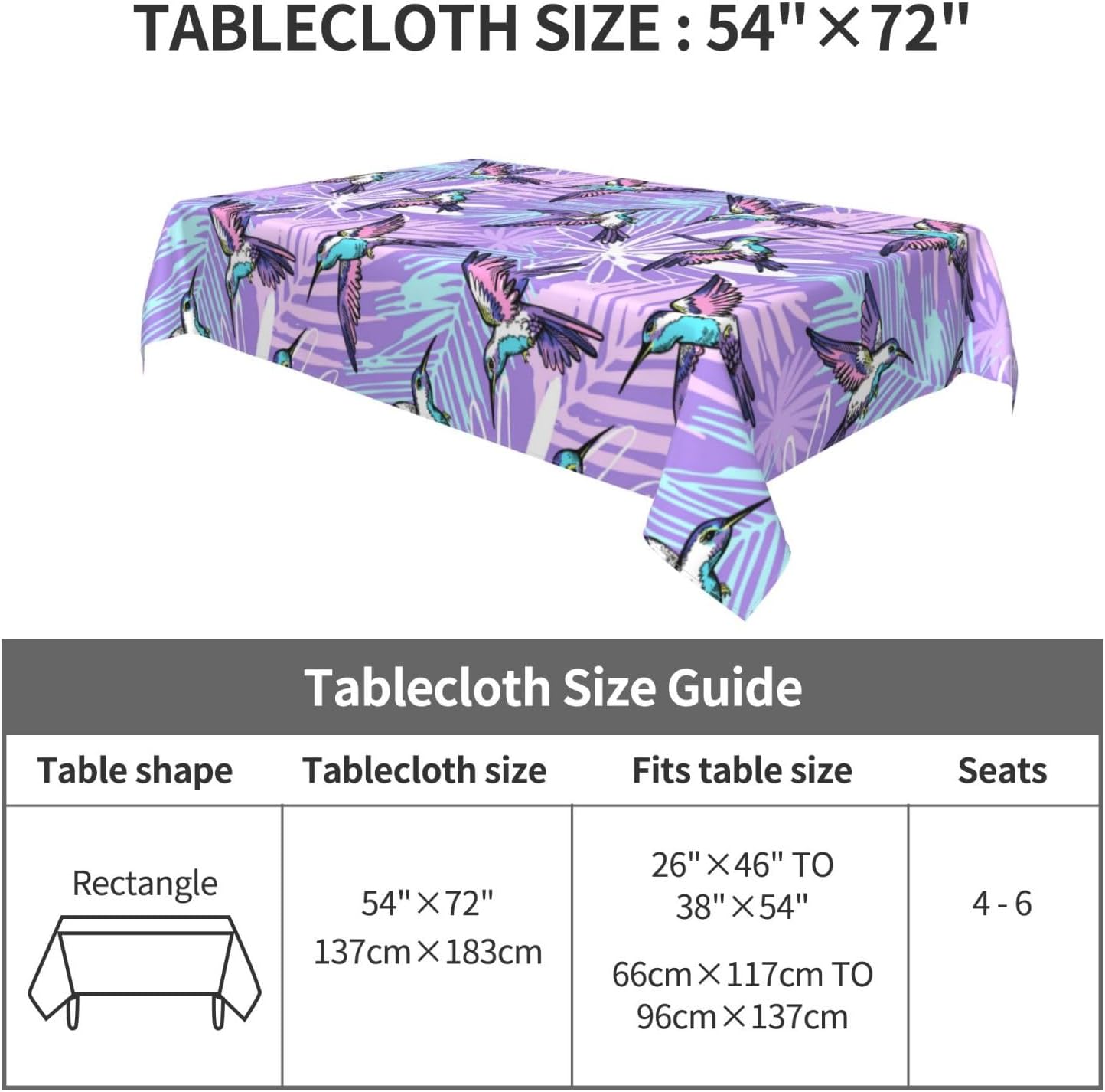Tessuto tovaglia: la nostra tovaglia astratta con colibrì viola è realizzata in tessuto di poliestere di alta qualità che offre una sensazione morbida e accogliente. Il materiale resistente all'acqua protegge il tuo tavolo da schizzi e macchie, rendendolo una tovaglia ideale per varie occasioni.,Resistente alle pieghe e riutilizzabile: questa tovaglia viola astratta colibrì è resistente alle pieghe e può essere facilmente lavata e riutilizzata per mantenere il tuo tavolo da pranzo fresco e pulito. Perfetto per scopi decorativi e funzionali, sia come tovaglia da pranzo che come tovaglia da esterno. Dimensioni della tovaglia: 54" x 72". Questa tovaglia rettangolare con colibrì astratta è adatta a tavoli da 26" x 46" a 38" x 54". È un'aggiunta versatile alla decorazione della tua tavola, adatta come tovaglia da picnic o tovaglia da esterno.,Decorazioni per la casa: questa tovaglia rettangolare astratta con colibrì non solo protegge il tuo tavolo da graffi e macchie, ma aggiunge anche un tocco festoso alla tua sala da pranzo. La tovaglia è perfetta per valorizzare l'arredamento della tua casa mantenendo la tavola pulita e protetta