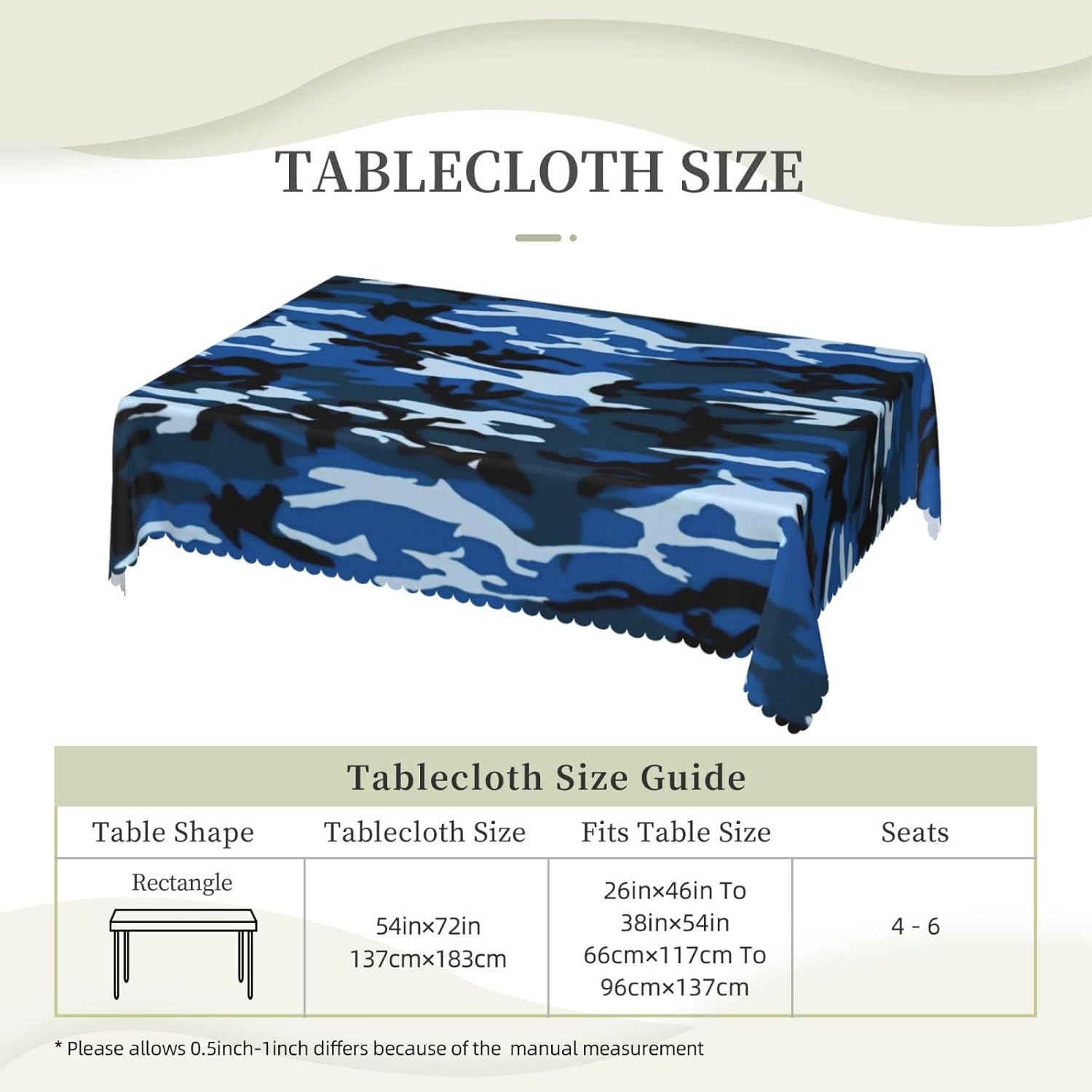 Questa tovaglia decorativa rettangolare con motivo mimetico blu misura 137 x 183 cm. Tovaglia con motivo mimetico blu realizzata in materiale poliestere, calda e morbida, buona resistenza alle pieghe, può essere lavata e riutilizzata, protegge dalla polvere e protegge da ammaccature, scheggiature e graffi. La tovaglia con motivo mimetico blu può essere utilizzata sia all'interno che all'esterno, ideale per feste, matrimoni, campeggio, patio, compleanni in famiglia, buffet, barbecue, tavoli da cucina, ecc. Tovaglia quadrata con stampa mimetica blu, bordo in pizzo semicircolare, Attenzione: non candeggiare, non esporre alla luce solare, è accettabile sia il lavaggio a mano che in lavatrice a temperatura ambiente e la stiratura a bassa temperatura. Se hai problemi o domande, contattaci, ti risponderemo entro 24 ore
