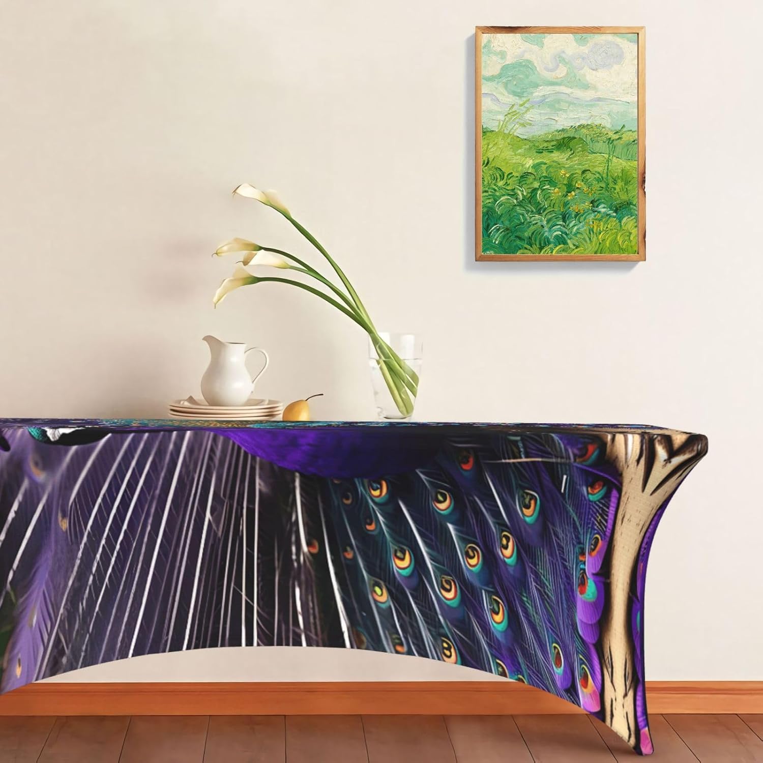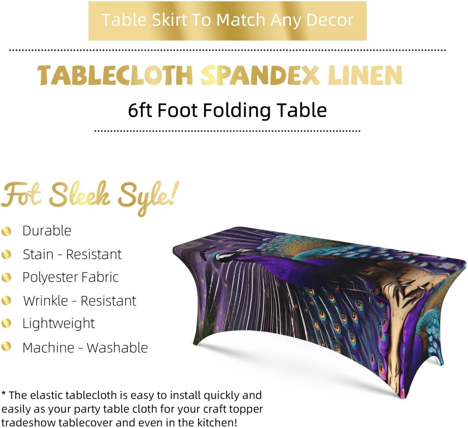 Realizzato in una miscela di poliestere ed elastan. Questa tovaglia viola con motivo pavone offre elasticità e resistenza eccezionali, garantendo una vestibilità comoda su tavoli lunghi fino a 1,8 m. Il tessuto altamente elastico è resistente alle pieghe e leggero, rendendolo facile da indossare e adatto a tutte le occasioni. Per feste, matrimoni, buffet, fiere e altro ancora, questa tovaglia elastica viola con motivo pavone aggiungerà un tocco di eleganza e protezione a qualsiasi evento. Anche per ricevimenti in hotel, esposizioni di gioielli ed esposizioni di artigianato, offre un'alternativa superiore alle tradizionali tovaglie. Questo set con motivo pavone viola include una tovaglia con quattro copripiedi angolari che proteggono le gambe del tavolo da graffi e danni. Il design garantisce una vestibilità sicura migliorando l'estetica generale del tuo tavolo. Progettata per un'installazione facile e veloce, questa tovaglia viola pavone si adatta a grandi tavoli rettangolari o ovali. La superficie pulita è resistente alle macchie e di facile manutenzione, mantenendo il tavolo immacolato durante l'evento. La tovaglia viola con stampa pavone presenta un motivo a stampa completa che aggiunge colori vivaci e stile a qualsiasi ambiente. Il tessuto resiste a liquidi, polvere e sporco, proteggendo il tuo tavolo e migliorandone l'aspetto per la decorazione della casa, la sala da pranzo e l'uso esterno.