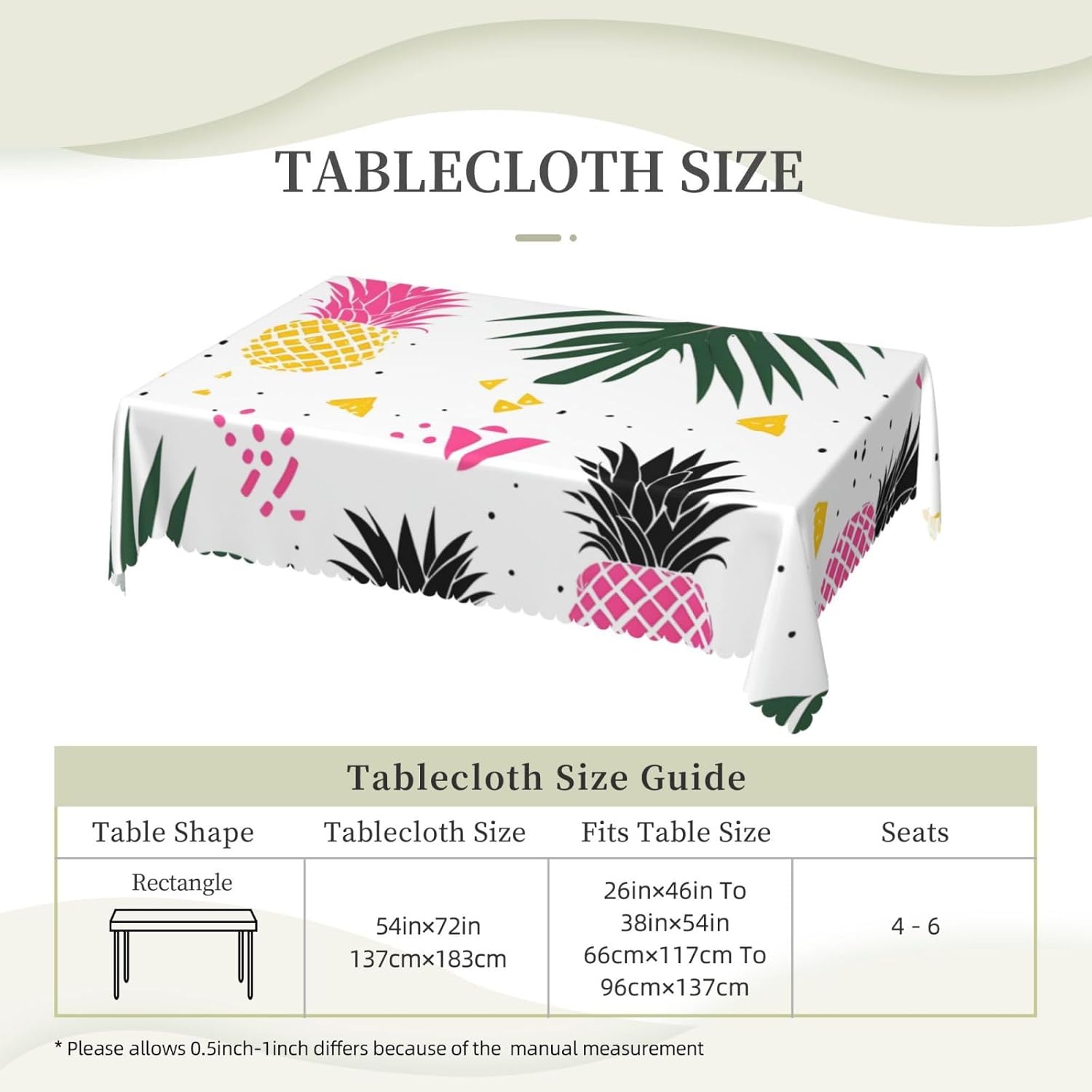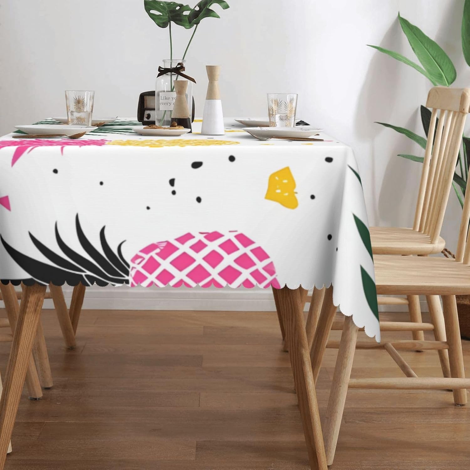 【Motivo Ananas Tropicale】Impermeabile e Decorativo - Proteggi e valorizza il tuo tavolo con la nostra tovaglia impermeabile di alta qualità. Aggiunge un tocco di eleganza a qualsiasi sala da pranzo e protegge il tavolo da schizzi e macchie. VESTIBILITÀ PERFETTA: questa tovaglia quadrata è progettata per adattarsi a tavoli larghi fino a 38 pollici e lunghi fino a 54 pollici. Le dimensioni sono 54" x 72" e forniscono una copertura sufficiente per il tuo tavolo. 【Design Elegante】La tovaglia presenta una stampa su un lato su tutta la superficie con un bellissimo bordo in pizzo, aggiungendo un tocco di raffinatezza alla tua esperienza culinaria. MATERIALE IN POLIESTERE DI ALTA QUALITÀ: Realizzata al 100% in fibra di poliestere, la nostra tovaglia offre una sensazione calda e morbida, eccellente resistenza alle pieghe e facile manutenzione. È lavabile in lavatrice e può essere riutilizzato per garantire protezione e decorazione durature alla tua tavola. MULTIUSO - Adatta per cene al chiuso e all'aperto, questa tovaglia è perfetta per bar, cene, brunch, picnic, matrimoni e feste. Offre un equilibrio ideale tra funzionalità ed estetica.