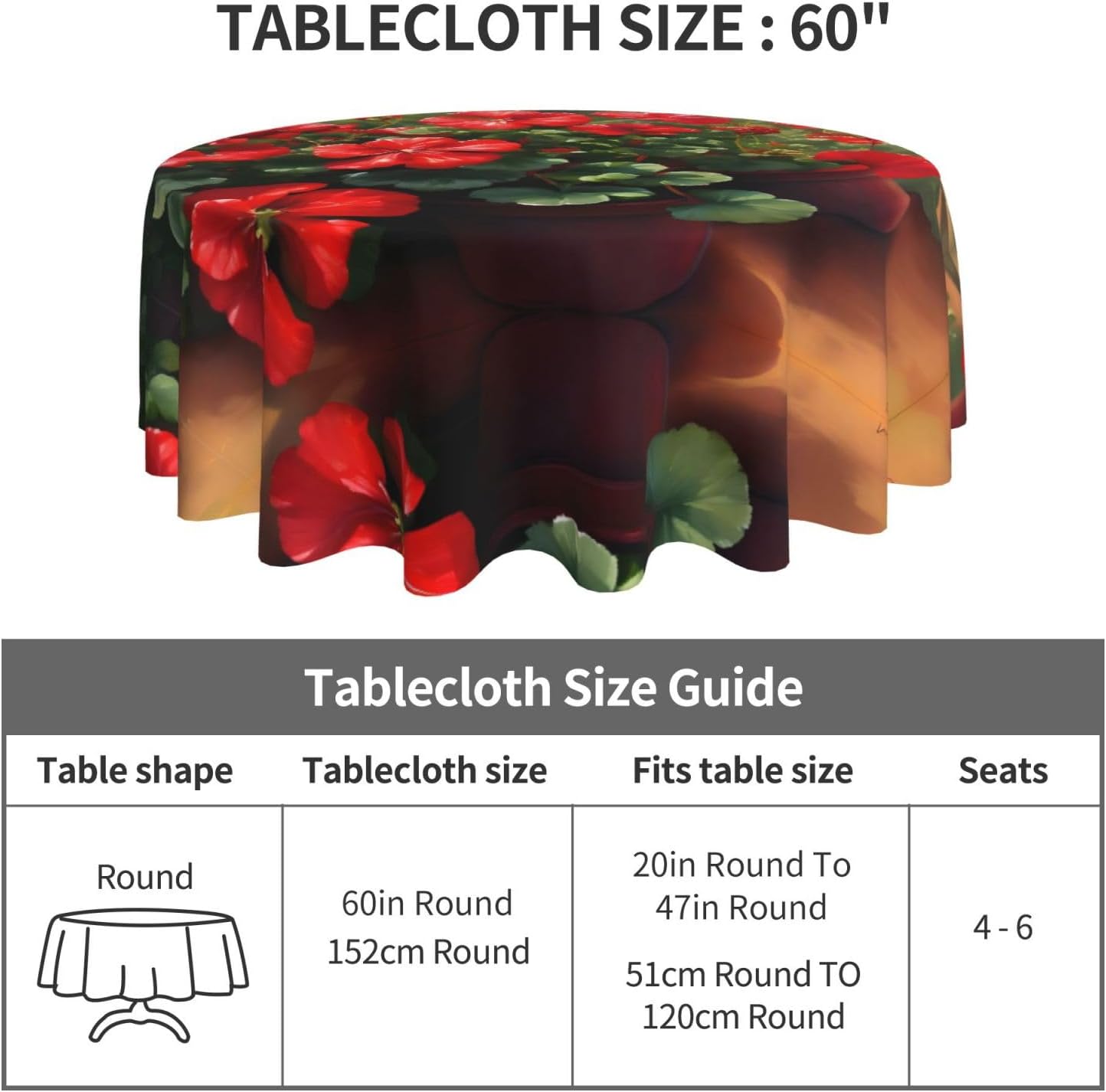 Tovaglia decorativa rotonda Gerani rossi: 60 "di diametro, abbastanza spaziosa da coprire un grande tavolo. Materiale 100% poliestere, caldo e morbido al tatto. Buona resistenza alle rughe, piegata piatta dopo un uso ripetuto. Riutilizzabile, pratica e durevole. Vantaggi prestazionali: come l'armatura del tavolo, resistente ai graffi e allo sporco. Forte decoratività, adatta a una varietà di stili. Non solo aggiunge bellezza ma protegge anche il piano del tavolo, il meglio di entrambi i mondi. tavoli rotondi, sia grandi che piccoli. Come una bella decorazione per abiti, diventa il centro dell'attenzione. Crea un'atmosfera calda ed elegante, adatta per la casa e il lavoro. 【Ampia gamma di applicazioni】 Adatto per una varietà di occasioni, caffè, matrimoni, feste, ecc. Resistente e molto decorativo, protegge il piano del tavolo e aggiunge fascino.