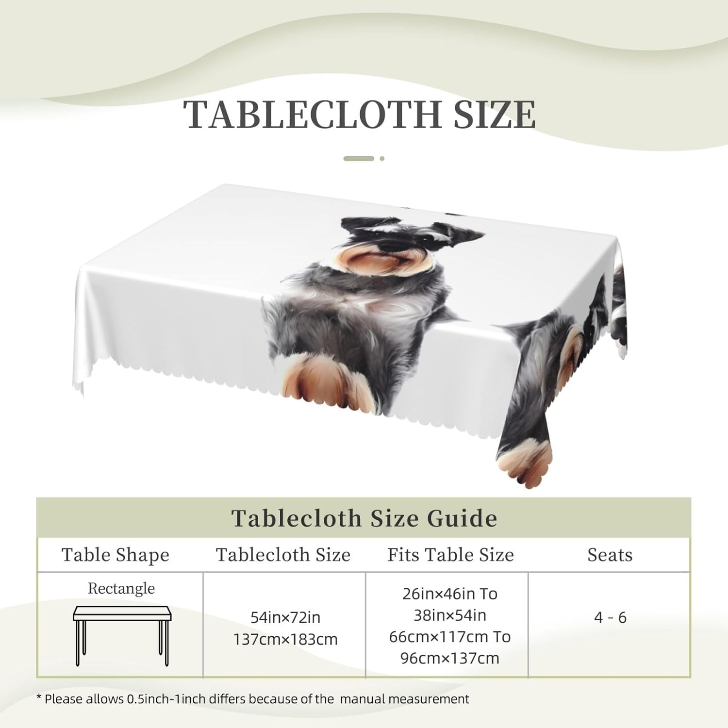 Design quadrato elaborato dello Schnauzer ben educato: questa tovaglia quadrata in pizzo presenta una splendida stampa su un lato, aggiungendo un tocco di eleganza a qualsiasi tavola. RESISTENTE FIBRA DI POLIESTERE AL 100%: Realizzata al 100% in fibra di poliestere di alta qualità, la nostra tovaglia offre una sensazione accogliente e morbida pur mantenendo un'eccellente durata e resistenza alle pieghe per una bellezza duratura. RESISTENTE ALL'ACQUA E RIUTILIZZABILE: Realizzata in tessuto impermeabile di alta qualità, questa tovaglia è facilmente lavabile e riutilizzabile per garantire che la superficie da pranzo sia protetta da schizzi, macchie e graffi, all'interno o all'esterno. MULTIUSO - Perfetta per applicazioni pratiche e decorative, la nostra tovaglia quadrata migliora l'atmosfera di bar, cene, brunch, buffet, picnic, matrimoni, feste e altro ancora. Trasforma senza sforzo qualsiasi occasione indoor o outdoor in un evento sofisticato. Elegante bordo in pizzo semicircolare: completa di un affascinante bordo in pizzo smerlato a semicerchio, questa tovaglia aggiunge un tocco di raffinatezza senza tempo che migliorerà l'arredamento della tua cucina, sala da pranzo o sala riunioni.