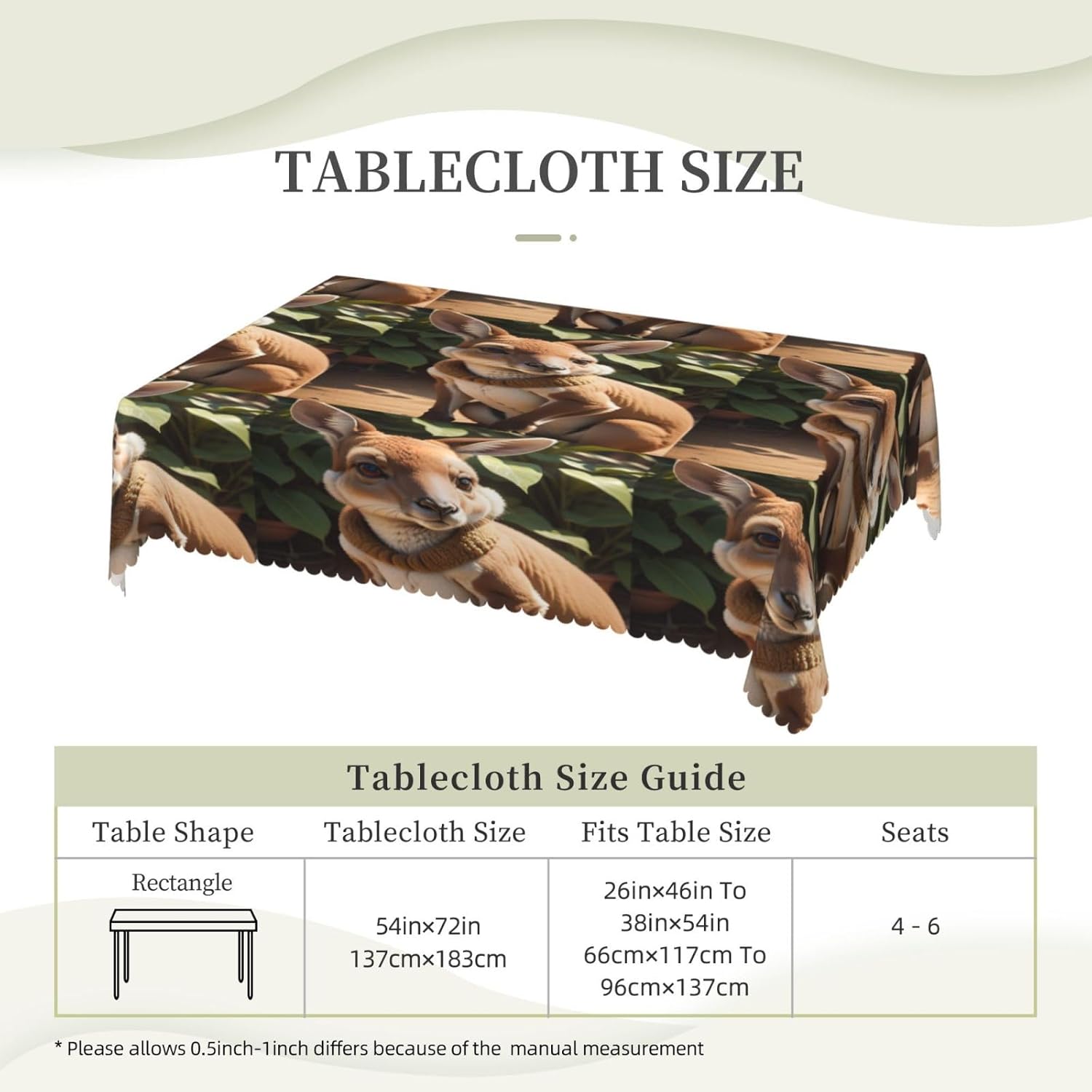 Questa tovaglia decorativa rettangolare con stampa Funny Zoo "Per Kangaroo Zoo" misura 137x183 cm. Tovaglia con stampa Funny Kangaroo Zoo, realizzata in materiale poliestere, calda e morbida, buona resistenza alle pieghe, può essere lavata e riutilizzata, protegge dalla polvere e protegge da ammaccature, scheggiature e graffi. Tovaglia con stampa divertente zoo di canguri, utilizzabile sia all'interno che all'esterno, ideale per feste, matrimoni, campeggio, patio, compleanno in famiglia, buffet, barbecue, tavoli da cucina, ecc. Tovaglia quadrata con stampa divertente zoo di canguri, bordo in pizzo semicircolare, Attenzione: non candeggiare, non esporre alla luce del sole, è accettabile sia il lavaggio a mano che in lavatrice a temperatura ambiente e la stiratura a bassa temperatura. Se avete problemi o domande, contattateci, vi risponderemo entro 24 ore